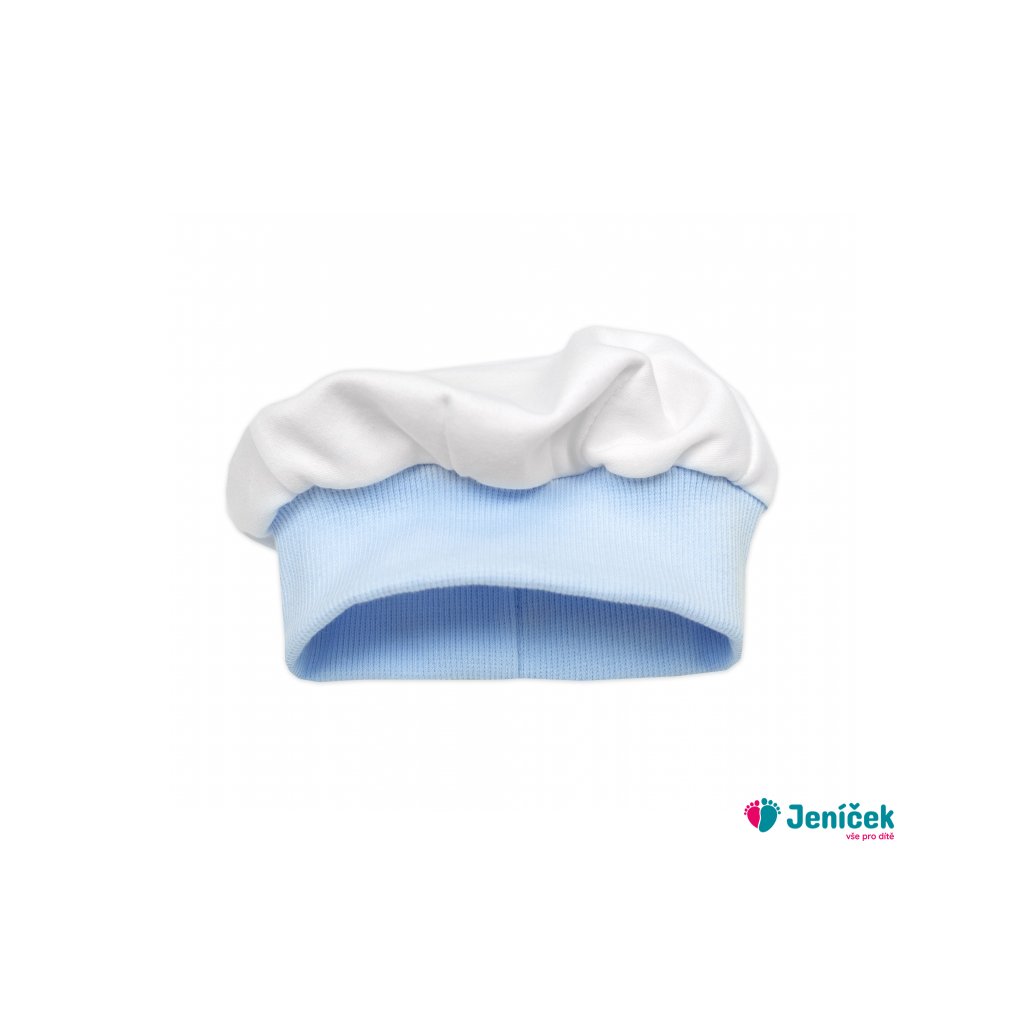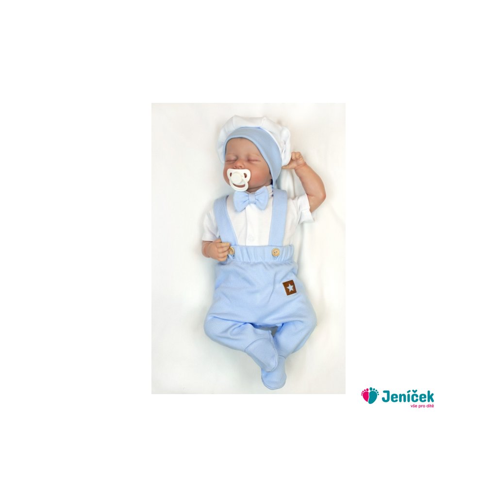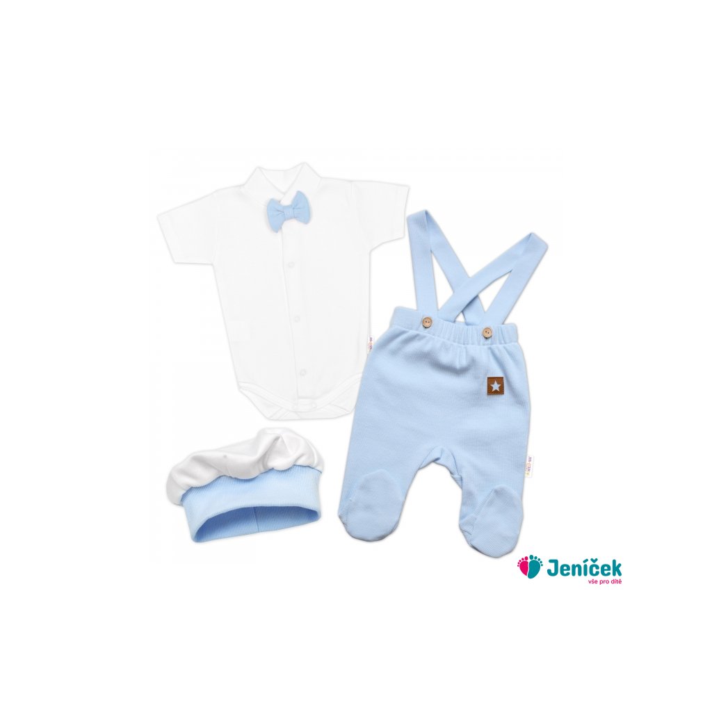 Bavlněná souprava Gentleman 3D, body kr. rukáv, polodupačky s láclem + čepička, modrá/bílá