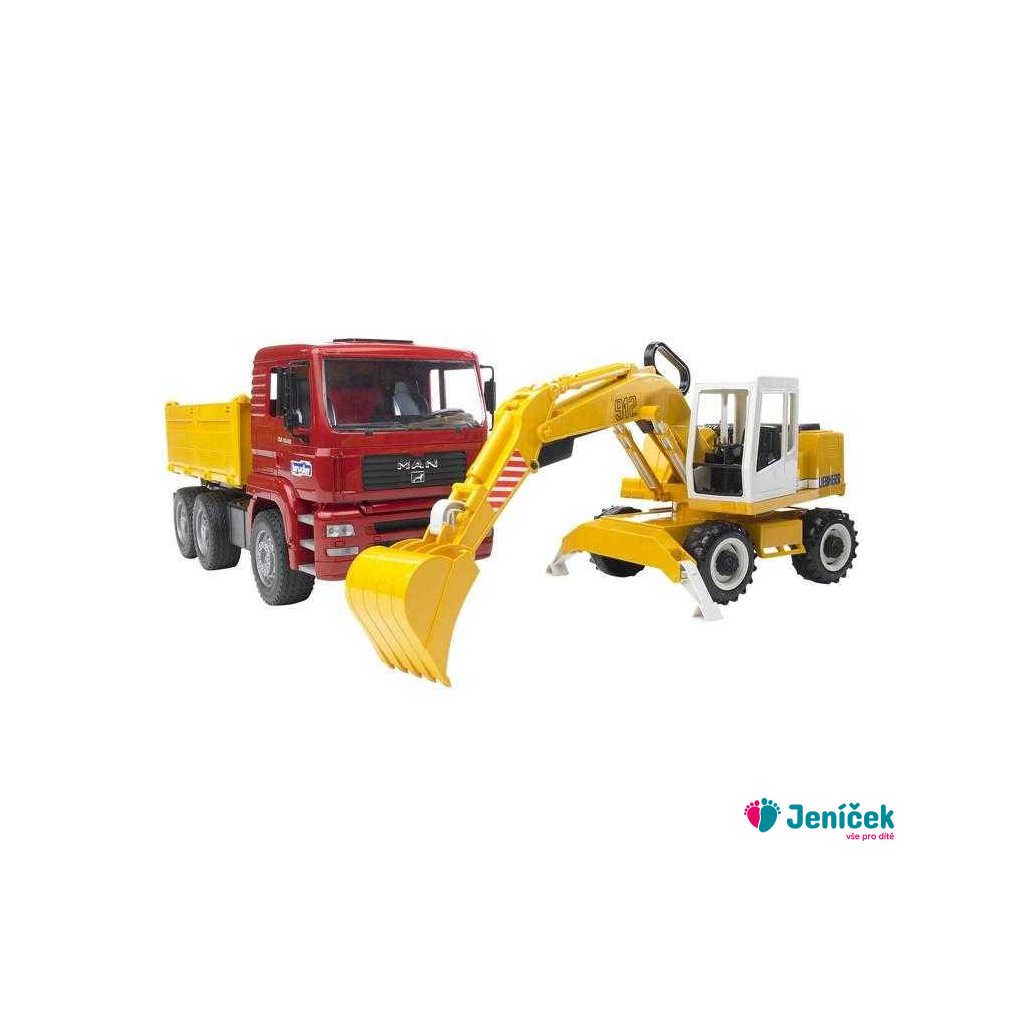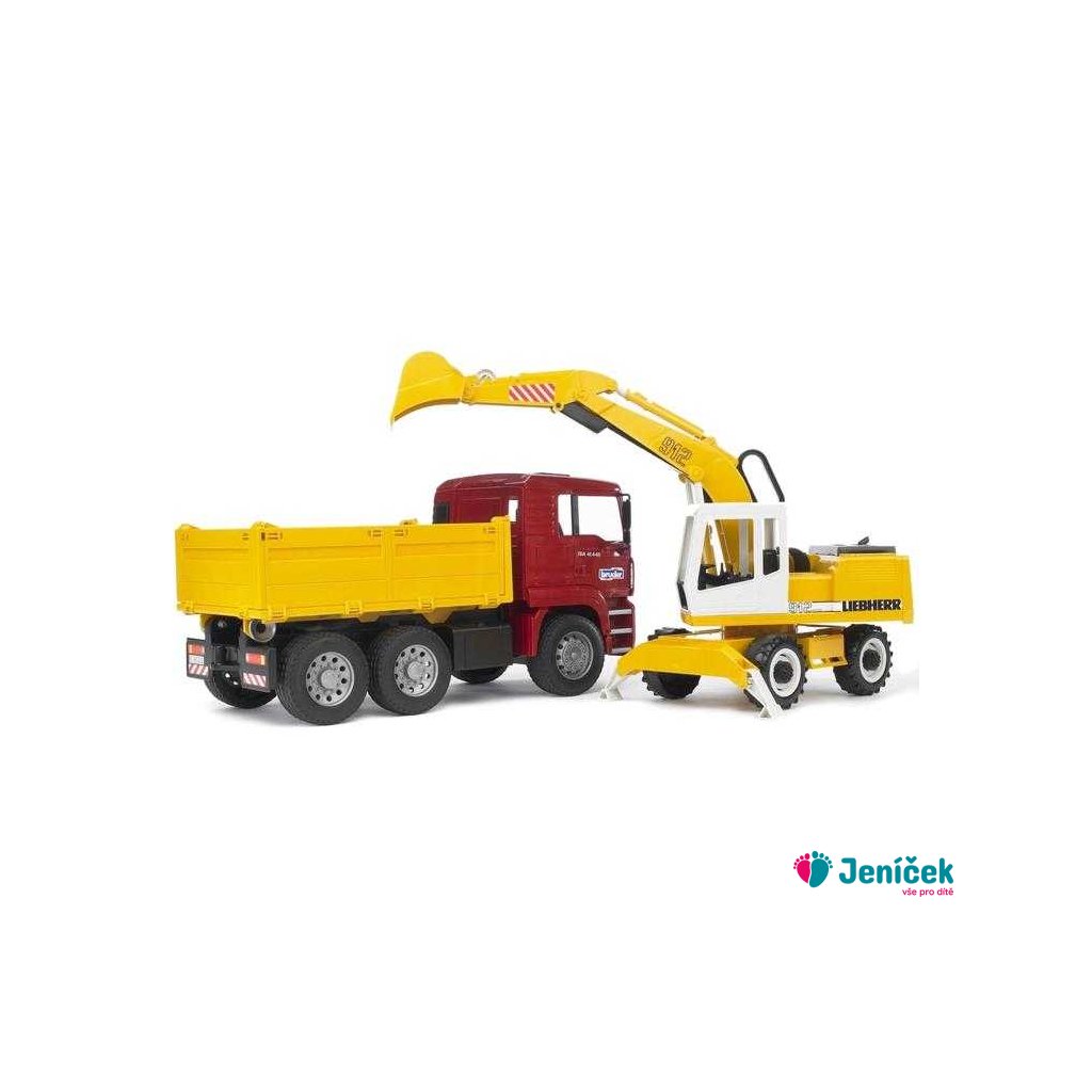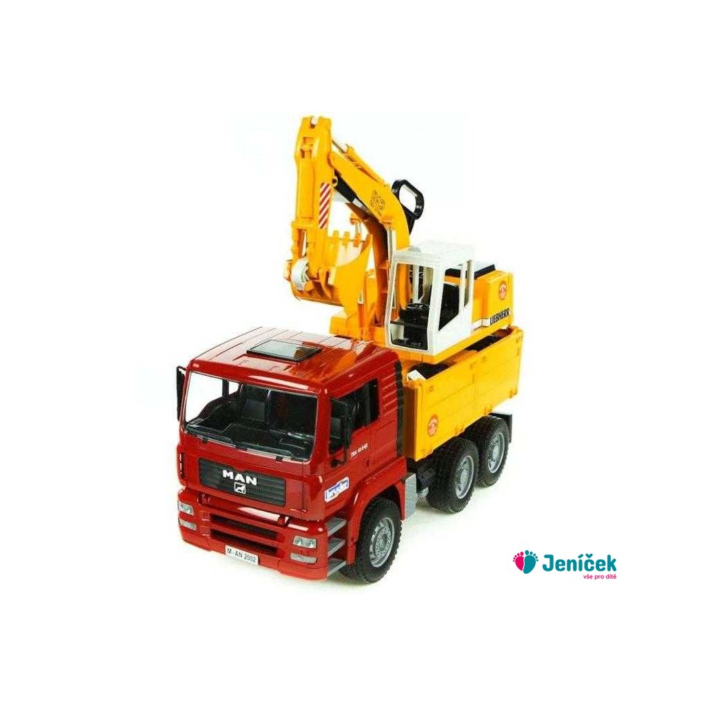 Nákladní auto MAN TGA je klasický sklápěč s měkkými pneumatikami a sklopnou korbou. Součástí setu je bagr Liebherr na nakládání materiálu. Bagr má stabilizační výsuvné opěrné nohy, profilové pneumatiky a funkční rýpadlo s otočnou kabinou. Kabina s plně funkčním ramenem se lžící se otáčejí o 360°. Doporučujeme k vozu dokoupit a nainstalovat světelný a zvukový maják BR2801. Vyrobeno v Německu, z kvalitních materiálů. Hlavní vlastnosti: sklopná korbasoučástí bagr Liebherr s rýpadlemvyrobeno v Německu