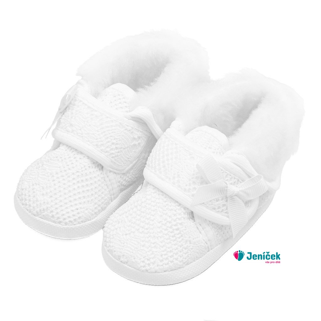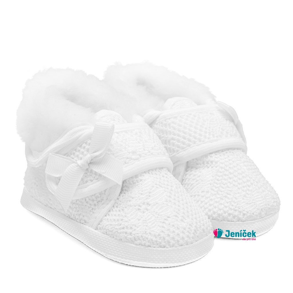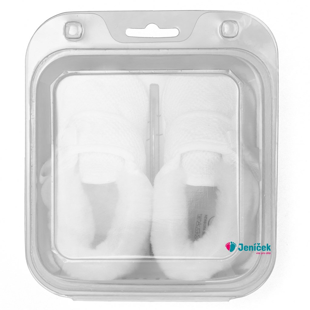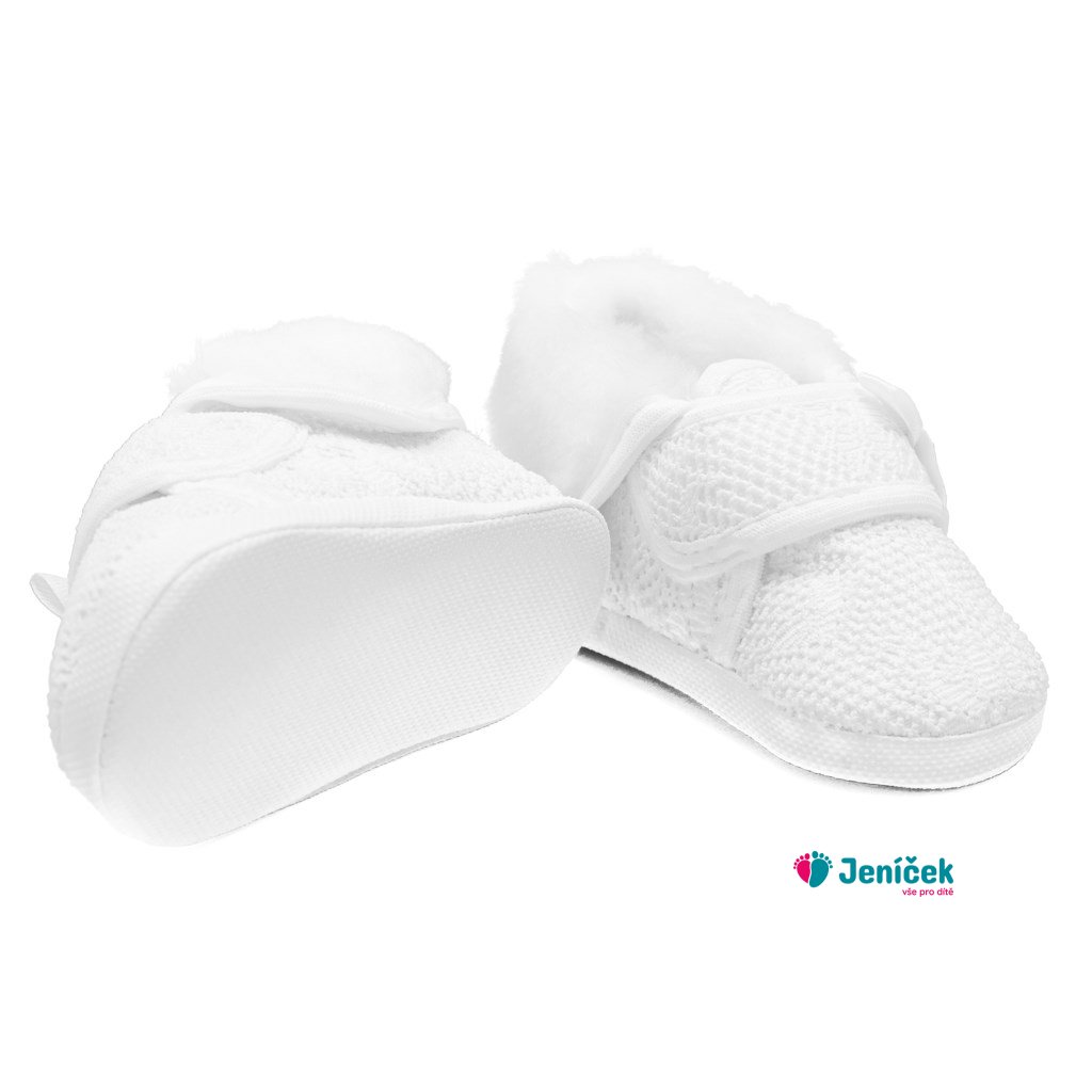 Kojenecké zimní capáčky New Baby pro miminka. Krásné, teplé krajkové capáčky na suchý zip. Vnitřní část je vystlaná rounovou pleteninou-100% polyester. Capáčky přiléhají k nožičce a mají široký vnitřek, což umožňuje volný pohyb prstů a svalů. Výrobek není určen k chůzi. Jsou velmi lehké s tenkou syntetickou podrážkou. Složení: 80% bavlna, 20% polyester, rounová pletenina-100% polyester. Podrážka: syntetický materiál PVC bez BPA. Délka vnitřní stélky 10 cm. Určeno pro děti 0-3 měsíců. Dodáváné v praktické krabičce. Upozornění: pod textilní vložkou se někdy nachází papírová vložka, která drží tvar capáčky. Před prvním použitím odstraňte tuto papírovou vložku.