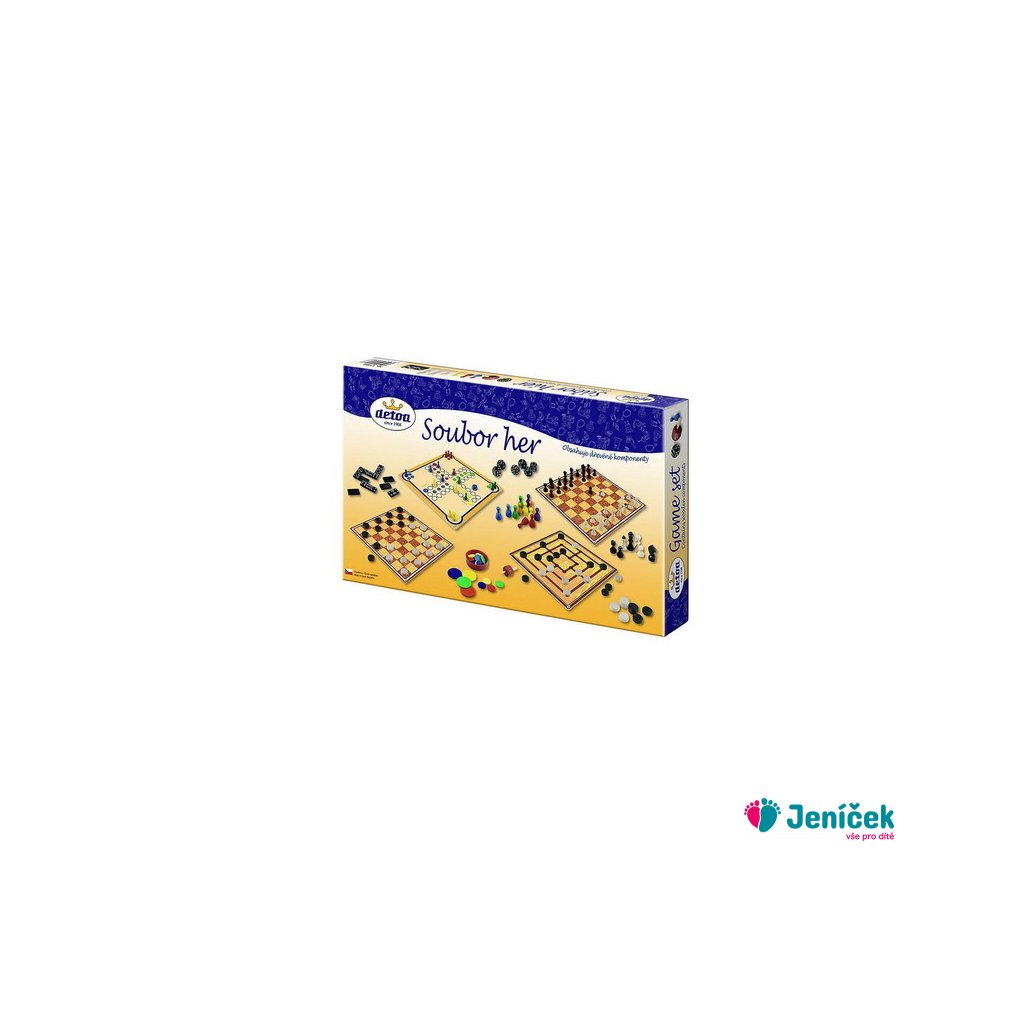 Soubor her Člověče, nezlob se, domino, kostky, šachy, dáma, bleší hra a mlýn. Součástí jsou dřevěné komponenty a hrací desky z tvrdého papíru. Velikost balení je 370 x 225 x 45 mm. Nevhodné pro děti do 3 let. Obsahuje malé části. Výrobek je zdravotně nezávadný.Dřevěná hračka splňuje všechny normy EU.