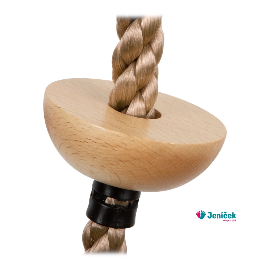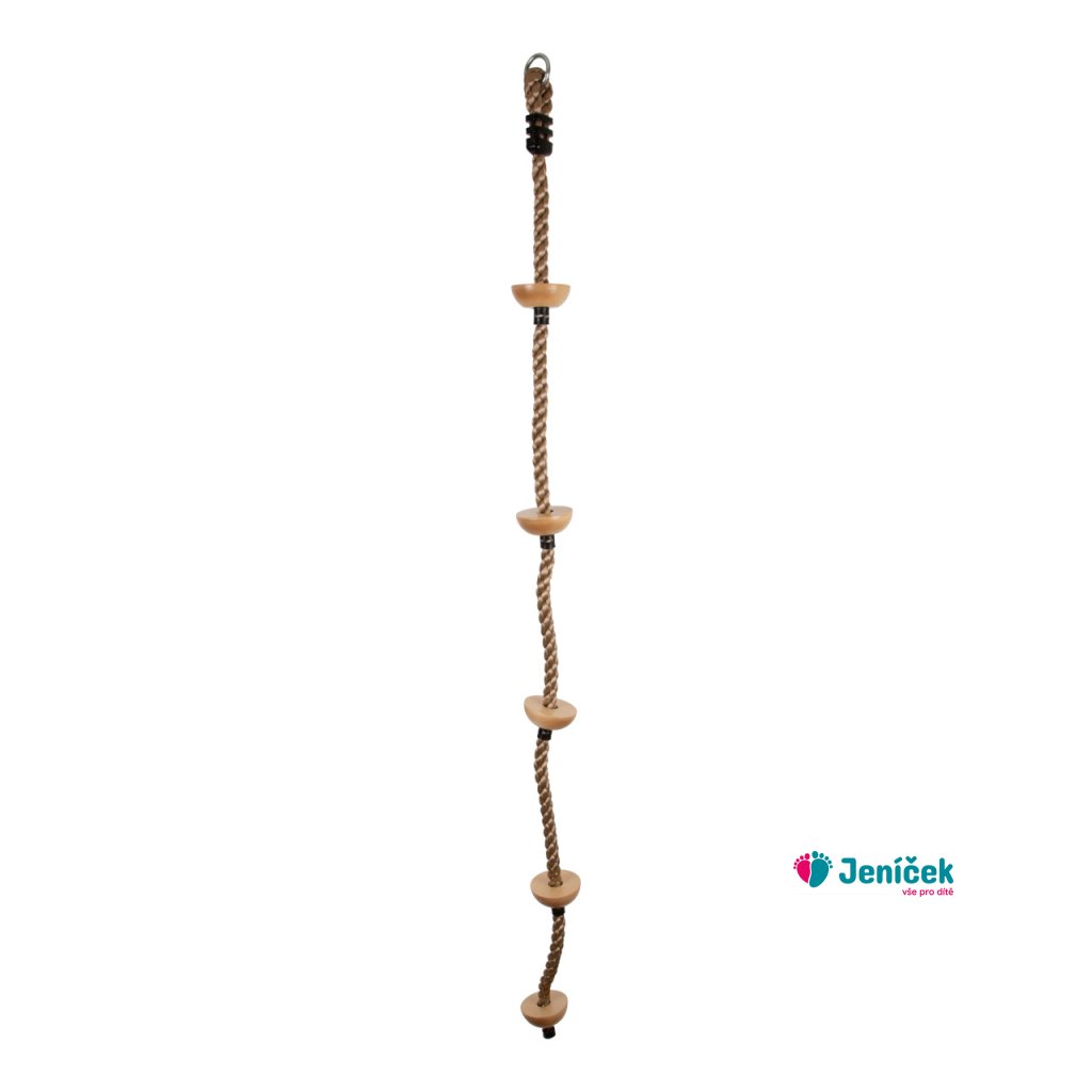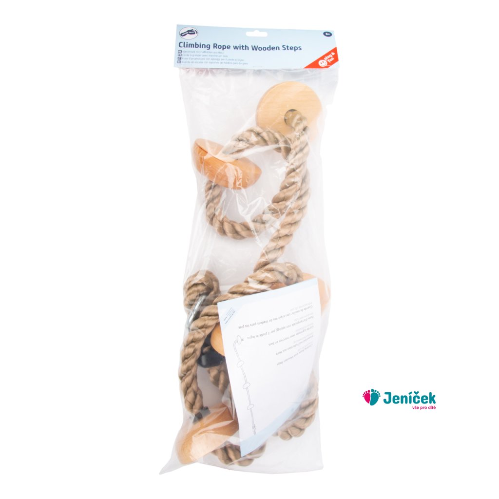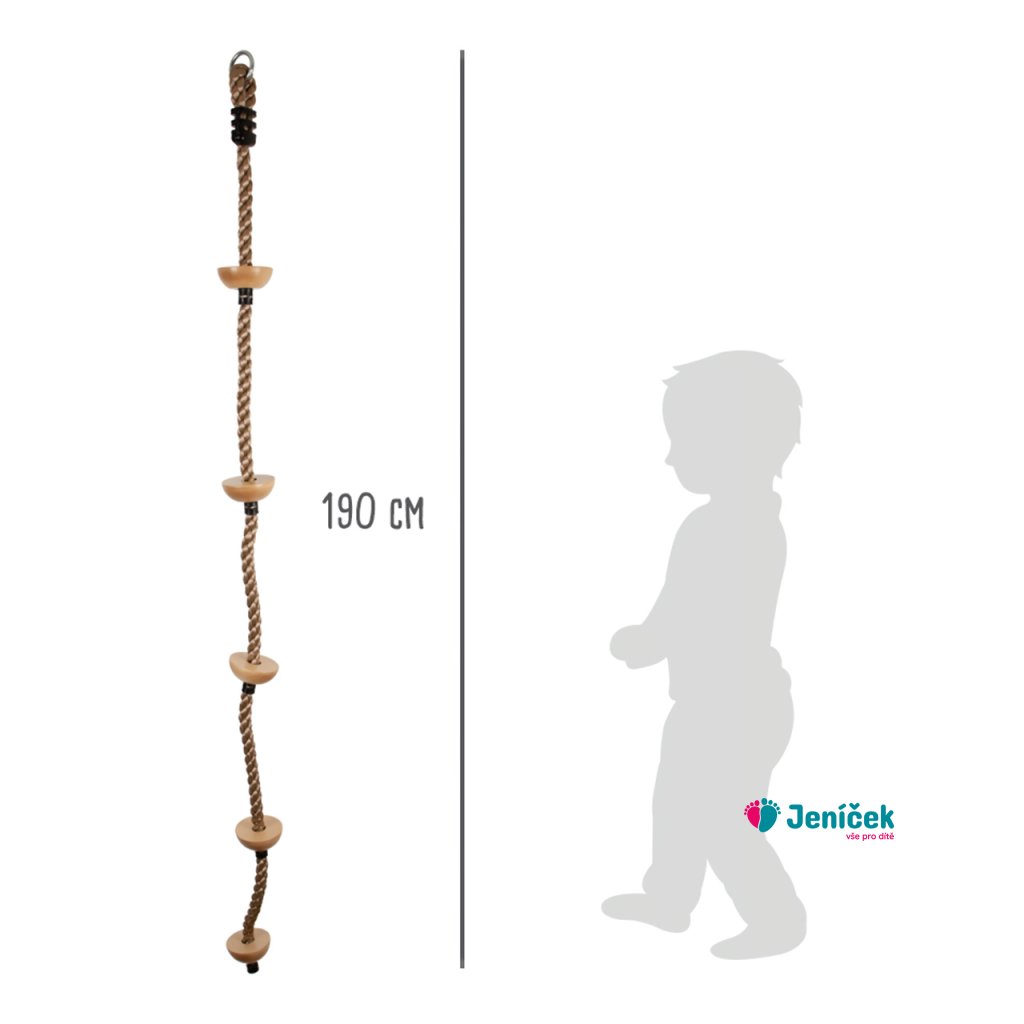 Výš a ještě výš! Dětské šplací lano v přírodním stylu s nášlapnými body, které jsou vyrobeny z masivního dřeva. Na laně jich najdete pět, dětem usnadní šplhání. Lano má kovové oko pro zavěšení. Ať už jej použijete venku nebo doma, děti si s ním užijí mnoho sportovní zábavy. Můžete jej třeba použít jako vchod do domečku na stromě. Děti si s lanem potrénují ovládání těla, rovnováhu a sílu. Kdo vyleze nahoru nejrychleji? Hlavní vlastnosti