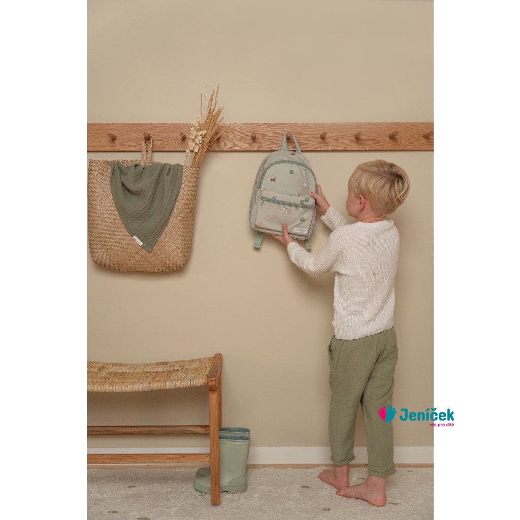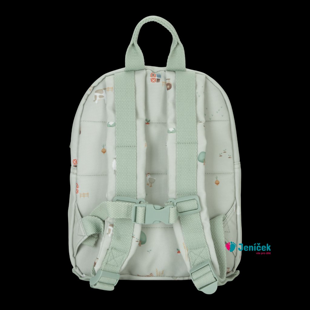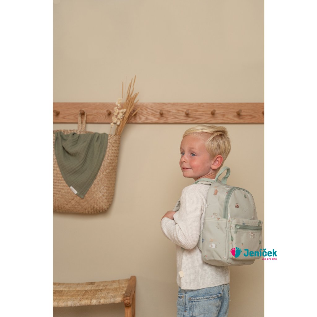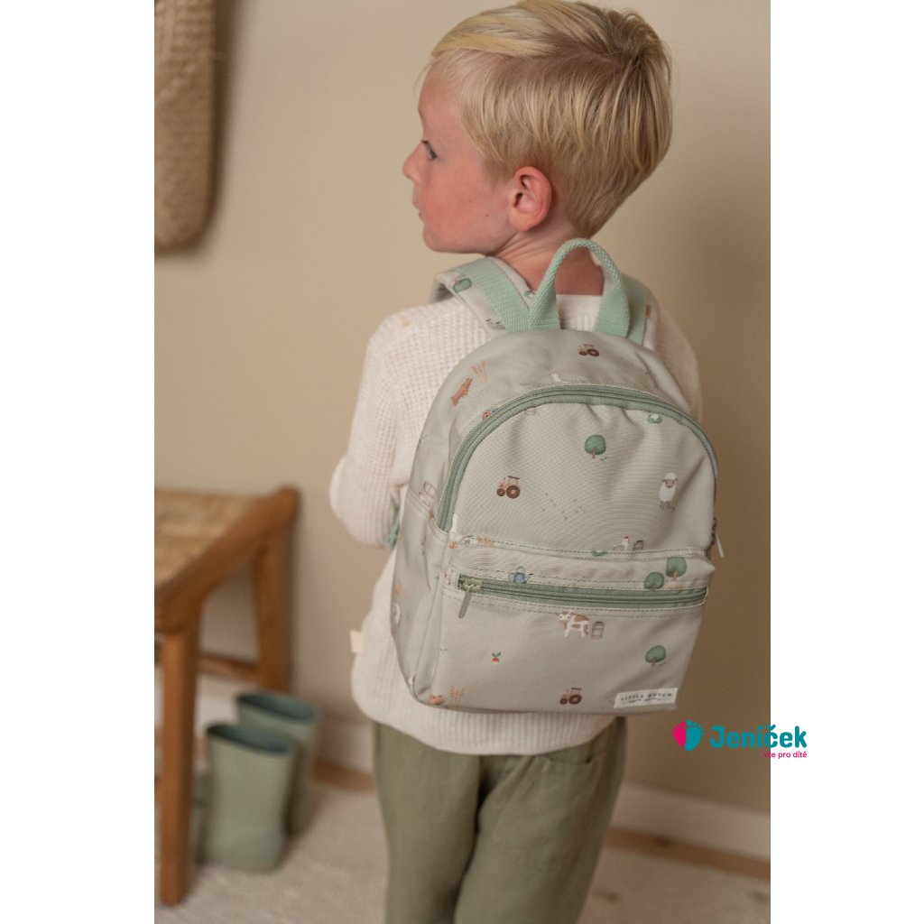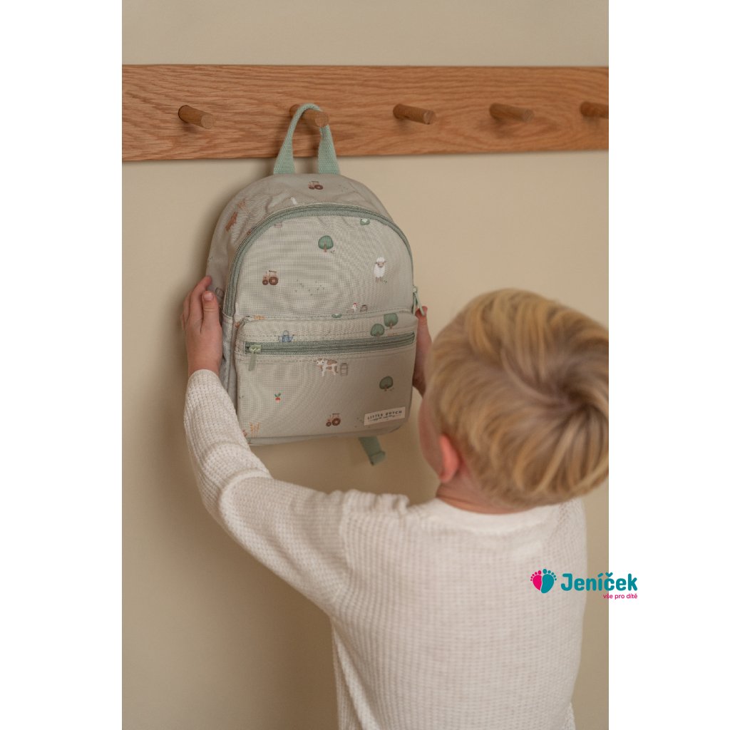 Roztomilý dětský batůžek potištěný obrázky zvířátek z farmy je ideálním doplňkem na výlety do přírody i procházky městem. Batůžek má nastavitelné ramenní popruhy a hrudní pás pro příjemné nošení. Držadlo umožňuje přenášení v ruce. Batůžek je vybaven vnější kapsou na zip pro uložení drobností a vnitřní prostor s kapsou, elastickým držákem na pití a jmenovkou. Batůžek je součástí designové kolekce hraček a doplňků pro děti Little Dutch Farma. Je výjimečný i tím, že jeho výroba je šetrná k naší planetě díky použití až 10 recyklovaných plastových lahví. Rozměry: 12 x 22,5 x 29 cm
