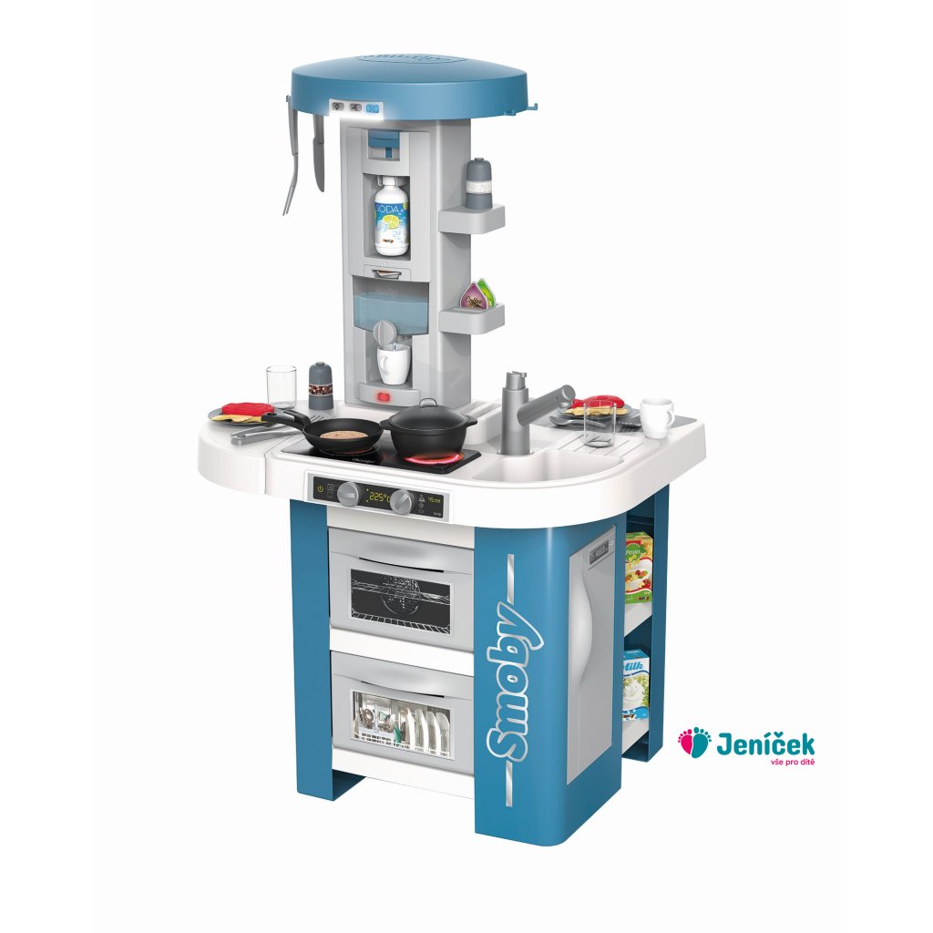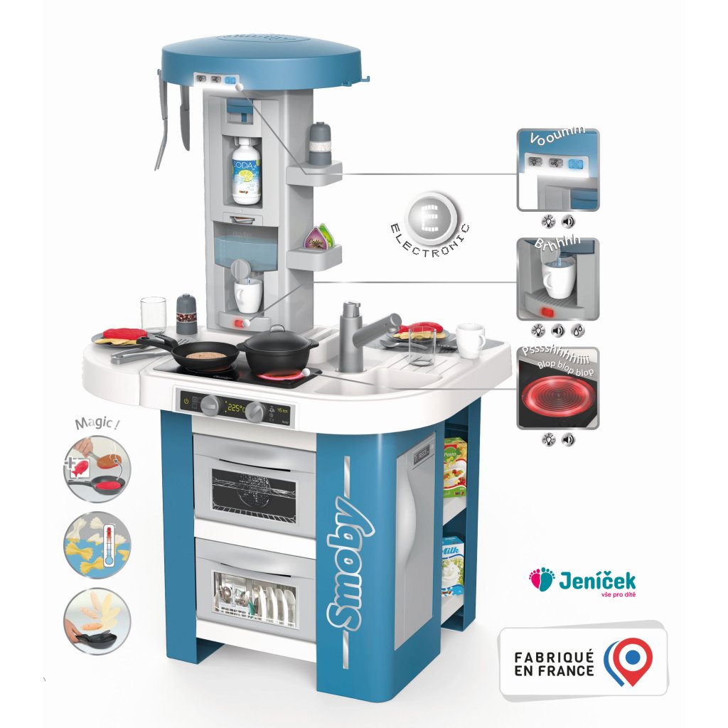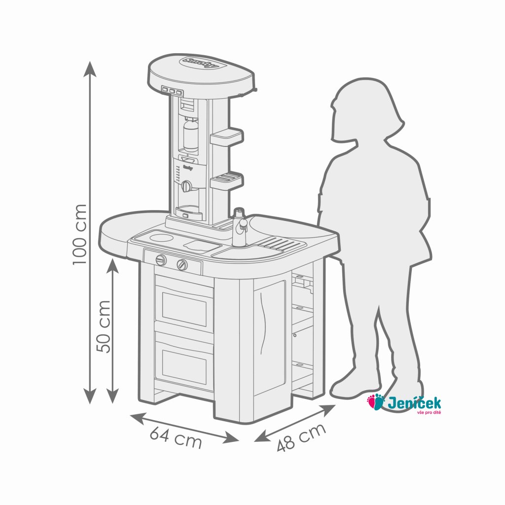 Stabilní kuchyňka Studio Tech Edition je kompaktní, stabilní kuchyňka s mnoha extra elektronickými funkcemi. S velkou herní plochou 360° - lze si hrát ze všech stran. Kuchyňská deska je vybavena elektronickou varnou deskou se dvěma různými zvuky vaření a červeným osvětlením. Kávovar má plnitelnou nádržku na vodu, pomocí které lze přes ventil plnit vodu do šálků. Po stisknutí tlačítka se objeví blikající světlo, které napodobuje zahřívání přístroje, a když tlačítko znovu stisknete, uslyšíte realistický zvuk přístroje na espresso. Digestoř má tři různé úrovně hluku a také světelnou funkci. Kuchyňka má také troubu, myčku, lednici, dřez s kohoutkem, automat na sodu a několik úložných prostor. Obsahuje 35 zábavných doplňků: těstoviny, které ve studené vodě mění barvu, pánvičku na snadné palačinky, kávové kapsle, ryby a steaky, slánku a pepřenku se zvukem „cvaknutí“, pánve, kuchyňské náčiní, nádobí, příbory, hrnky, brýle atd. Rozměry (DxŠxV): 64 x 48 x 100 cm.Doplňkové parametry