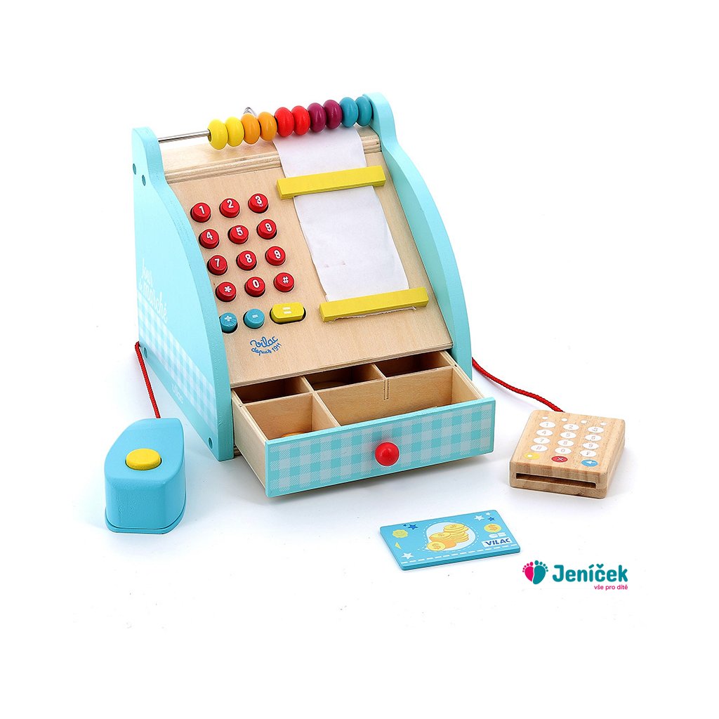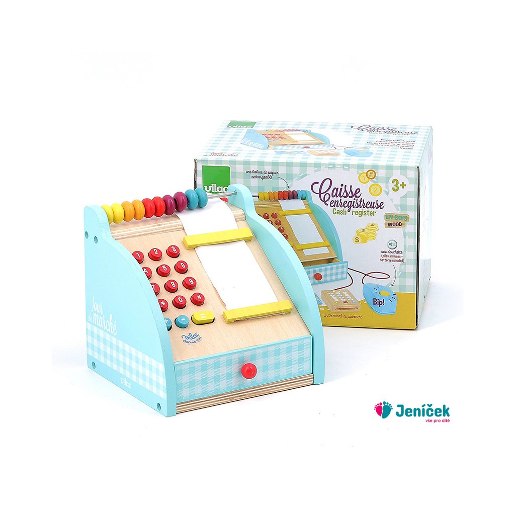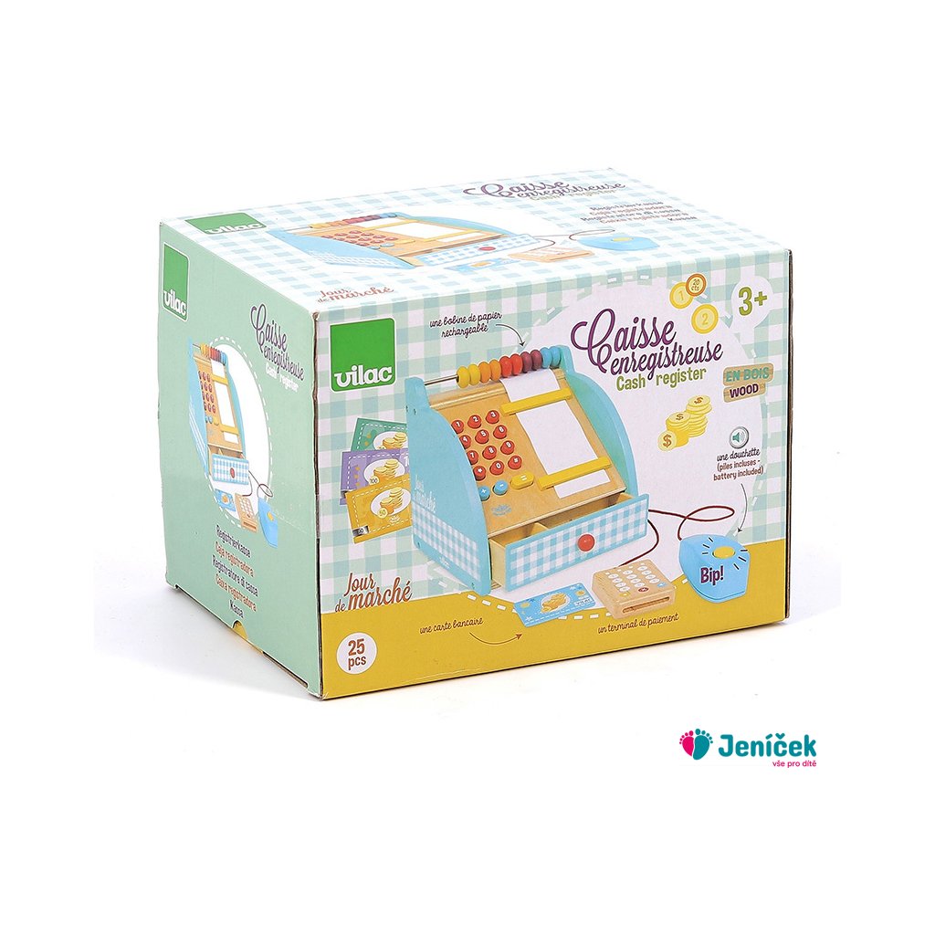 Dřevěná pokladna s šuplíkem na peníze, počítadlem a bankovním terminálem. Obsahuje také klasické zvukové tlačítko a funkční numerickou klávesnici. Mezi doplňky patří bankovky a mince. Hračky Vilac mají značku francouzské agentury ADEME, to znamená, že tyto dřevěné hračky jsou vyráběny ekologicky. Šetří životní prostředí, neznečišťují půdu, vodu a vzduch, neplýtvají energiemi.