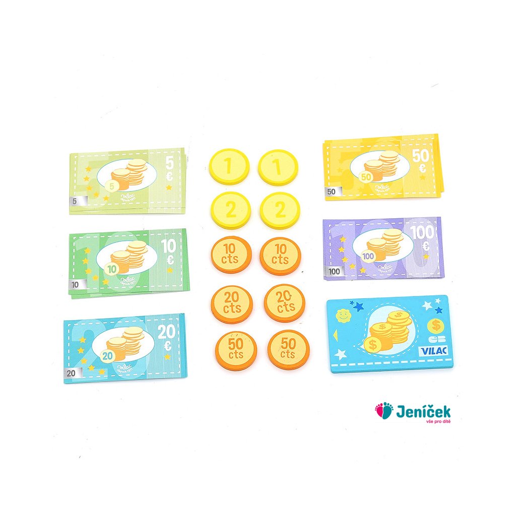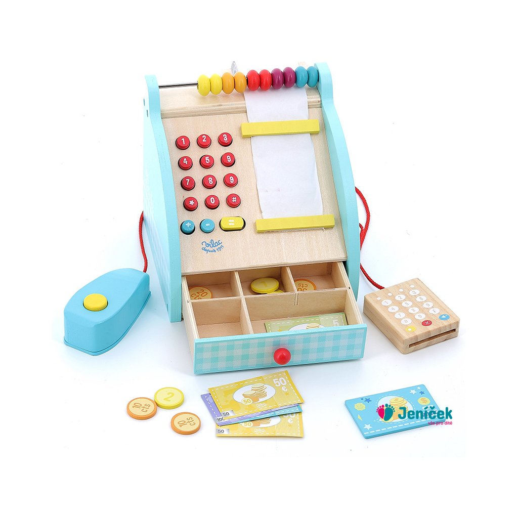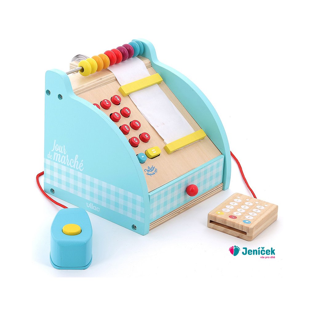 Dřevěná pokladna s šuplíkem na peníze, počítadlem a bankovním terminálem. Obsahuje také klasické zvukové tlačítko a funkční numerickou klávesnici. Mezi doplňky patří bankovky a mince. Hračky Vilac mají značku francouzské agentury ADEME, to znamená, že tyto dřevěné hračky jsou vyráběny ekologicky. Šetří životní prostředí, neznečišťují půdu, vodu a vzduch, neplýtvají energiemi.