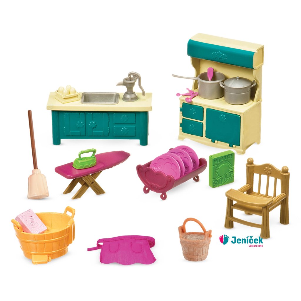 Sada nábytku vám umožní vybavit kuchyň v domečku pro postavičky zvířátek Li'l Woodzeez. Po dobré večeři je potřeba umýt nádobí, umýt podlahu a vyžehlit vyprané prádlo! Domeček i postavičky zvířátek se prodávají samostatně. Obsah 21-dílné sady: kbelík, mop, sada lžic, metla, krabička mýdla, 4 talíře, odkapávač na nádobí, prací prášek, pánev, stojan na vejce, vana, žehlička, žehlicí prkno, dřez, zástěra, hrnec s poklicí, sporák, vysoká židle. Samostatně prodávané postavičky zvířátek Li'l Woodzeez jsou vyrobené z měkkého příjemného materiálu a mají pohyblivé ruce, nohy i hlavy pro zábavnou předstíranou hru. Součástí samostatně prodávané nabídky doplňků Li'l Woodzeez jsou domečky, obchody i dopravní prostředky. Všechny postavičky a doplňky Li'l Woodzeez jsou navzájem kompatabilní a umožní vám vytvořit originální městečko pro nekonečnou hru rozvíjející fantazii a kreativitu vašeho dítěte. Vhodné pro děti od 3 let.Doplňkové parametry