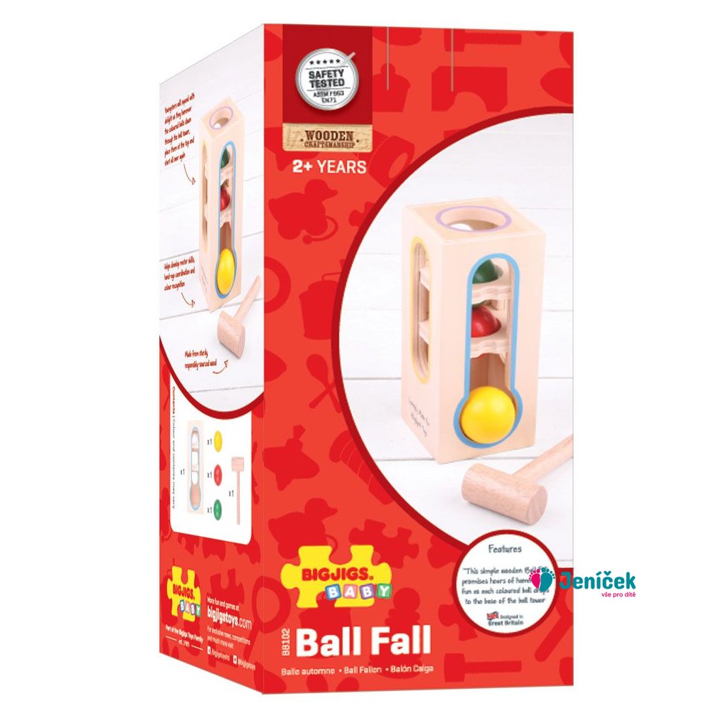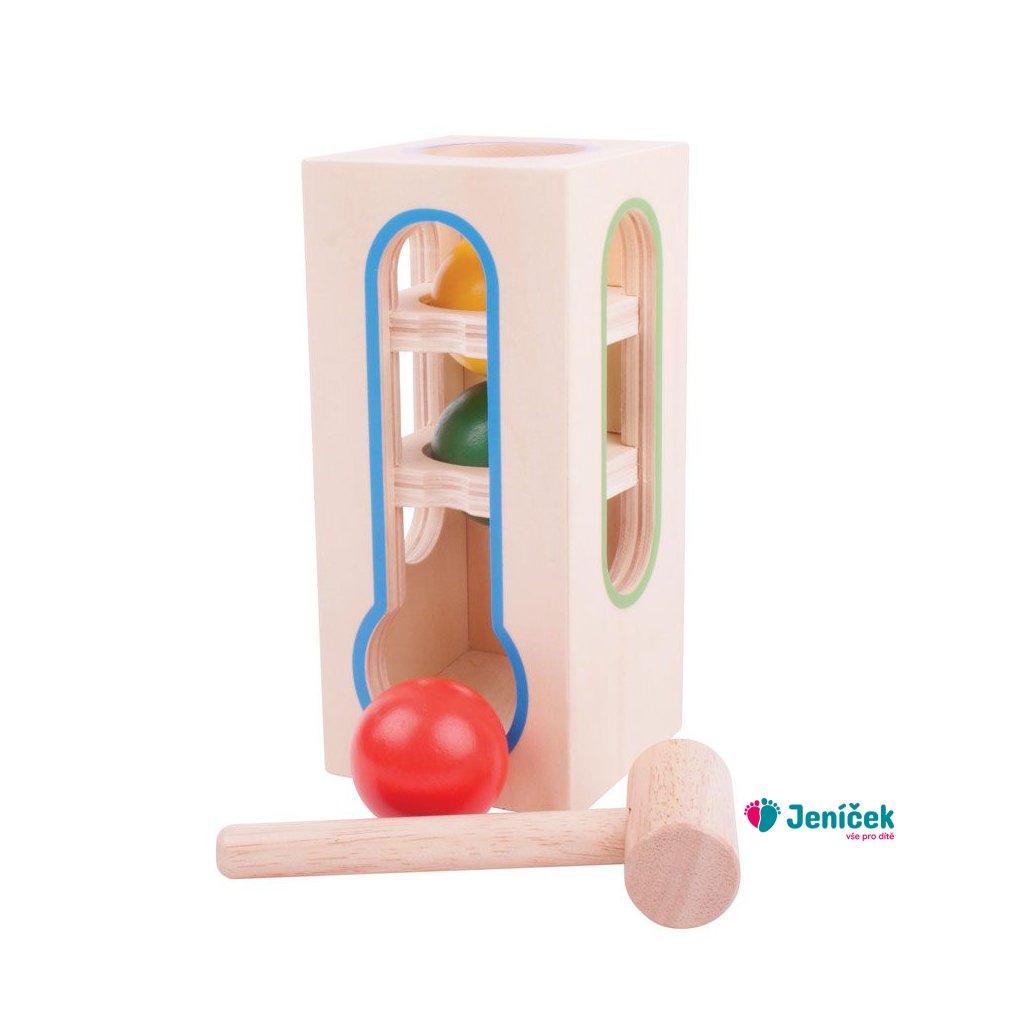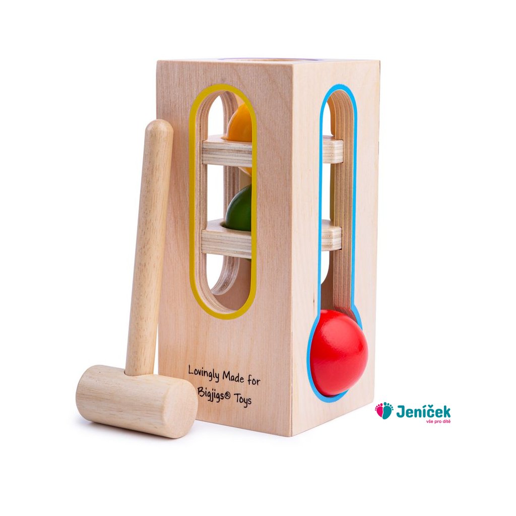 Tato jednoduchá dřevěná hračka slibuje hodiny zábavného bušení, protože každý barevný míček je sražen dolů do spodní části věže a po umístění zpět na vrchol můžete začít znovu!Klepání a posunování koule může pomoci rozvíjet jemnou motoriku, koordinaci oko-ruka a rozpoznávat barvy. Vyrobeno z kvalitních zodpovědně nakupovaných materiálů. Vyhovuje současným evropským bezpečnostním normám. Anglická značka Bigjigs Toys byla založena roku 1985 a zpočátku se zabývala výrobou pouze dřevěných puzzlí. Majitelé vyráběli vše ručně s láskou v malém zahradním domku, své výrobky prodávali na trhu. Spokojení zákazníci výrobce motivovali k mnoha dalším nápadům a rozšíření nabídky o další dřevěné hračky. Přibylo zasílání poštou a prodej přes katalog. Spokojenost a věhlas značky rostla, takže následoval velkoobchodní prodej a pro udržení výrobních cen přesun a rozšíření výroby na východ. Nové značky kvalitních a nápaditých hraček si v Anglii všimly další velké prodejní firmy.Dnes Bigjigs Toys hračky zůstávájí ve vlastnictví rodiny s obrovskými sklady v jiho-východní Anglii. Společnost i nadále dodává své hračky široké zákaznické základně ve Velké Británii a západní Evropě podpořená loajálním, oddaným a tvrdě pracujícím týmem zaměstnanců. Veškeré dřevěné hračky BigJigs Toys jsou navržené v Anglii a vyrobené jak tamtéž, tak i ve východní Evropě a jihovýchodní Asii. Kvalita hraček značky BigJigs Toysje testována a odpovídá všem podmínkám pro prodej v EU a USA.Doplňkové parametry