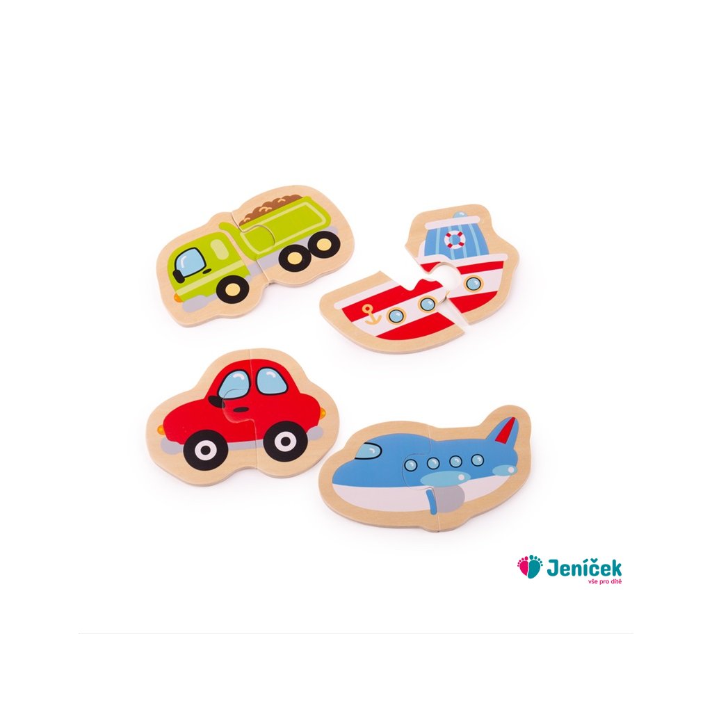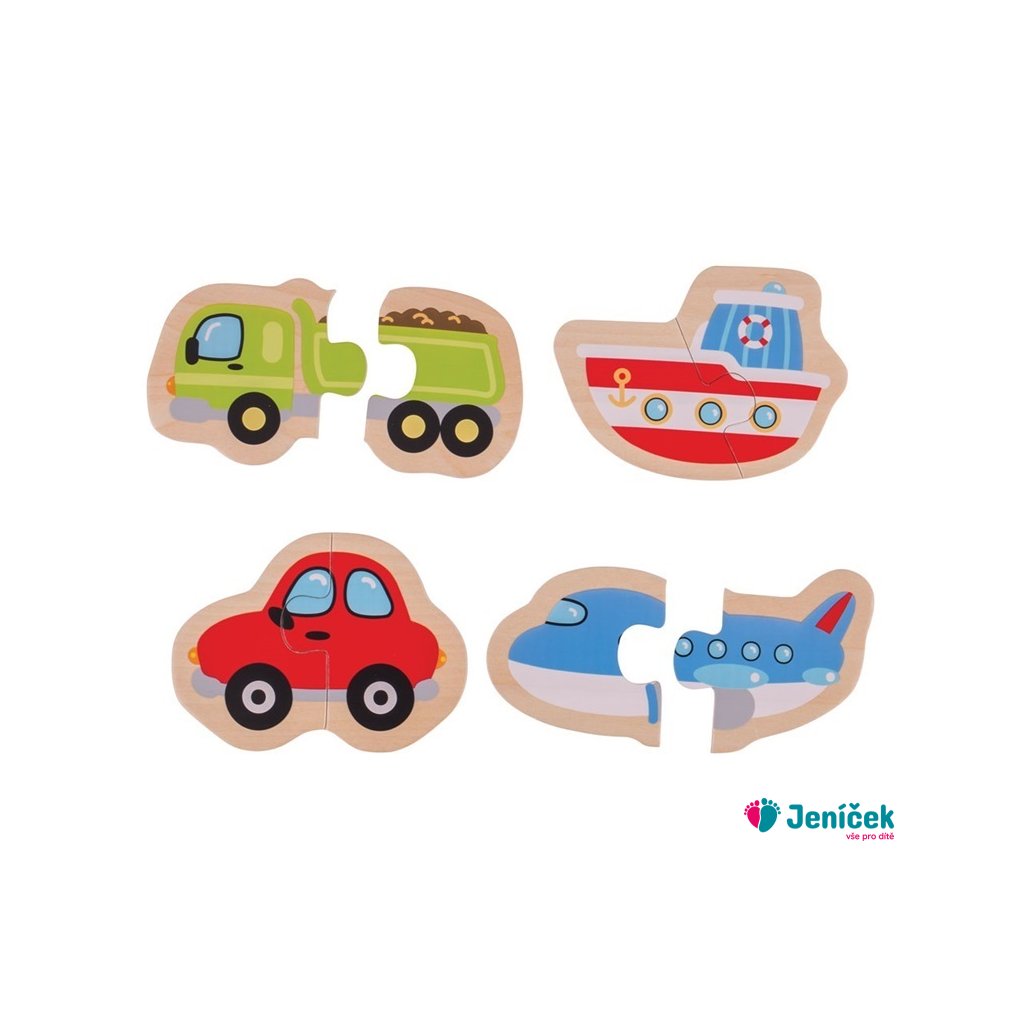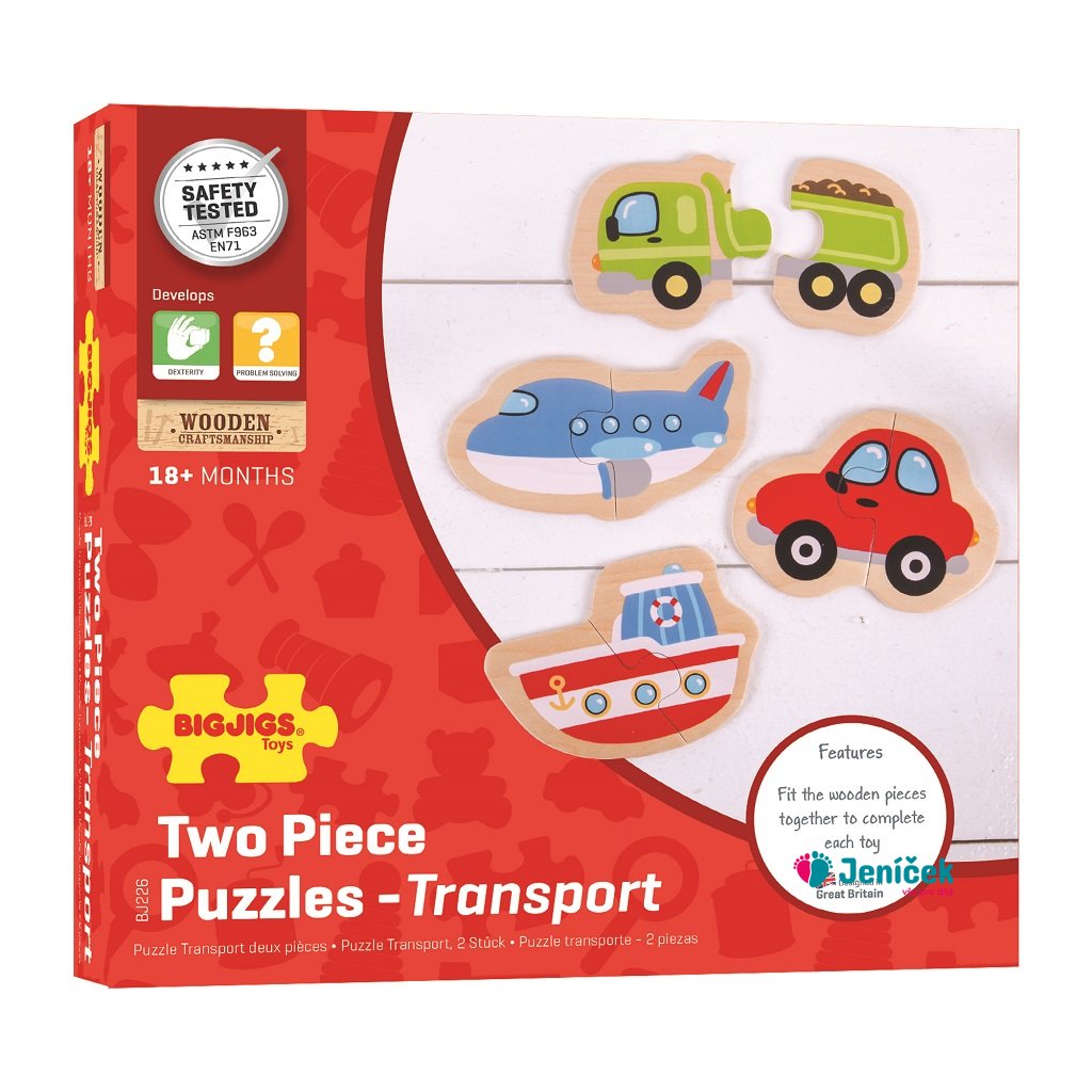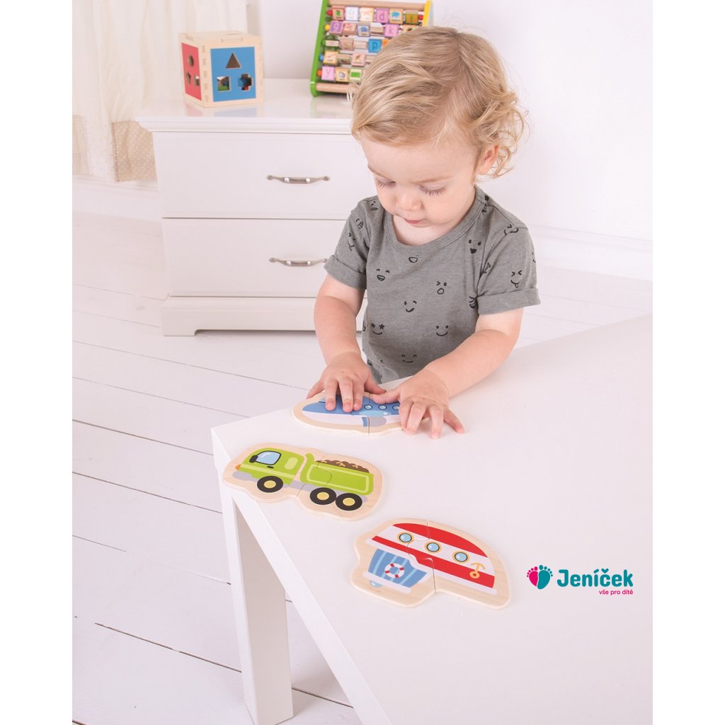 Malí hráči musí správně přizpůsobit každý z 8 dřevěných dílků dohromady, aby vytvořili čtyři barevné dopravní prostředky. Jakmile budou skládačky dokončeny, budou děti povzbuzovány k tomu, aby o nich hovořili. Dílky jsou perfektně uzpůsobeny pro malé ruce, které je musí zvedat, uchopit a umístit. Skvělý způsob, jak rozvinout slovní zásobu, zručnost, manipulaci, odpovídající schopnosti a soustředění, a povzbuzuje rozpoznávání tvarů a barev. Vyrobeno z vysoce kvalitních, zodpovědně dodávaných materiálů. Odpovídá současným evropským bezpečnostním normám. Součásti je 8 dílků.Anglická značka Bigjigs byla založena roku 1985 a zpočátku se zabývala výrobou pouze dřevěných puzzlí. Majitelé vyráběli vše ručně s láskou v malém zahradním domku, své výrobky prodávali na trhu. Spokojení zákazníci výrobce motivovali k mnoha dalším nápadům a rozšíření nabídky o další dřevěné hračky. Přibylo zasílání poštou a prodej přes katalog. Spokojenost a věhlas značky rostla, takže následoval velkoobchodní prodej a pro udržení výrobních cen přesun a rozšíření výroby na východ. Nové značky kvalitních a nápaditých hraček si v Anglii všimly další velké prodejní firmy.Dnes Bigjigs hračky zůstávájí ve vlastnictví rodiny s obrovskými sklady v jiho-východní Anglii. Společnost i nadále dodává své hračky široké zákaznické základně ve Velké Británii a západní Evropě podpořená loajálním, oddaným a tvrdě pracujícím týmem zaměstnanců. Veškeré dřevěné hračky BigJigs jsou navržené v Anglii a vyrobené jak tamtéž, tak i ve východní Evropě a jihovýchodní Asii. Kvalita hraček značky BigJigs je testována a odpovídá všem podmínkám pro prodej v EU a USA.