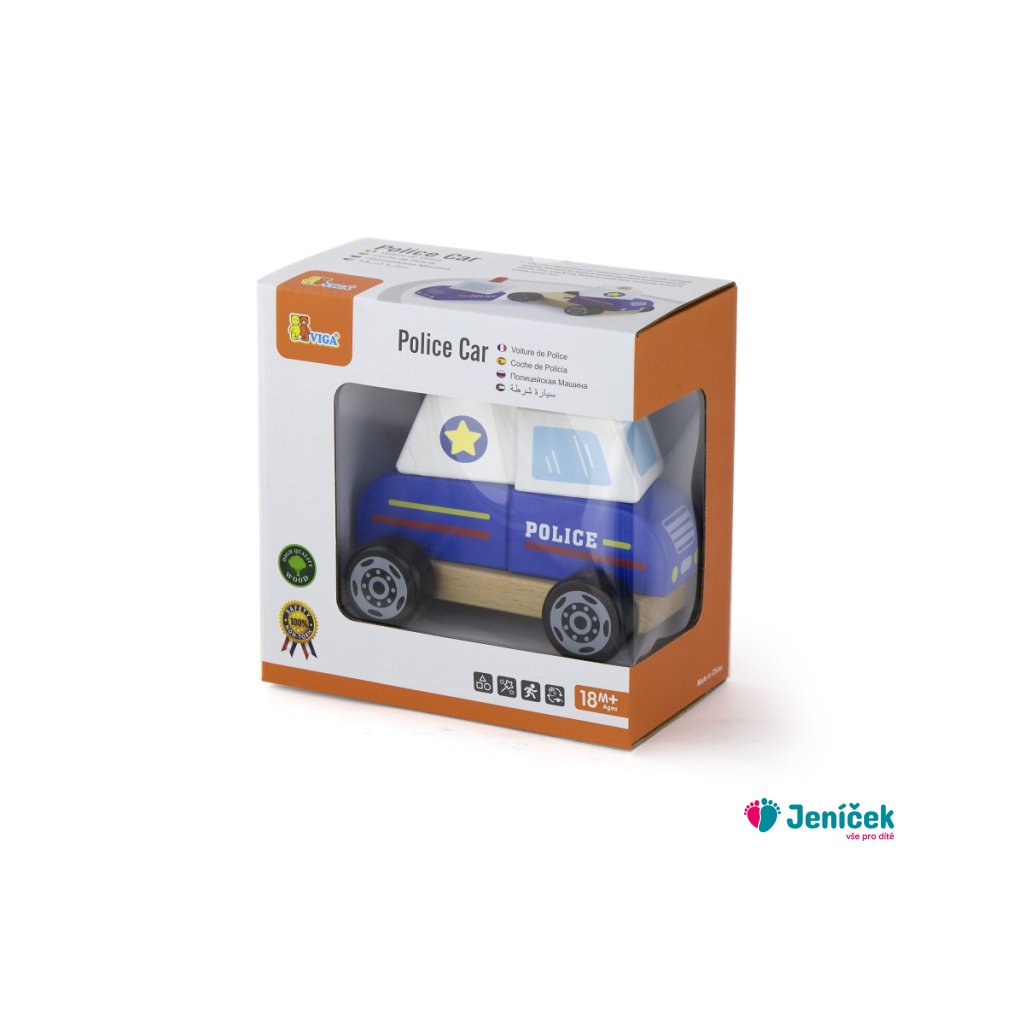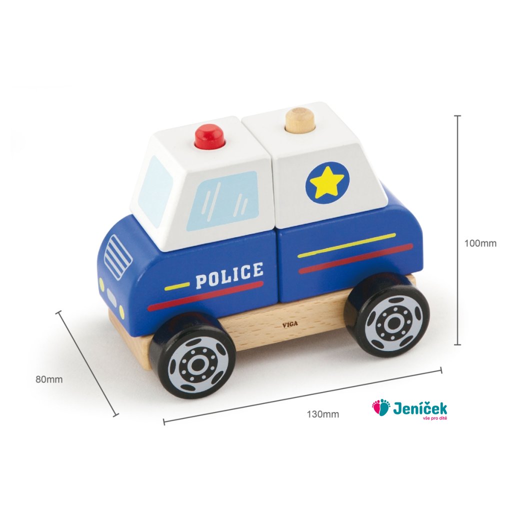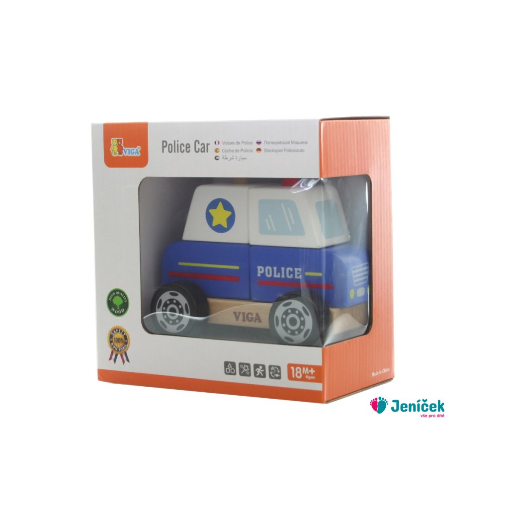 Dřevěná skládačka policejní auto o rozměru cca 12,5 x 10 x 8 cm. Rozměry balení cca 16 x 16 x 9 cm. Věk 18m+