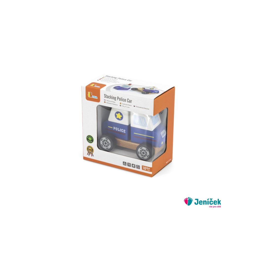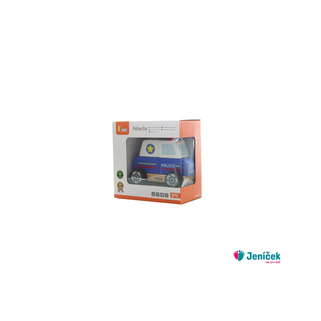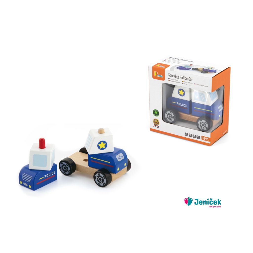 Dřevěná skládačka policejní auto o rozměru cca 12,5 x 10 x 8 cm. Rozměry balení cca 16 x 16 x 9 cm. Věk 18m+