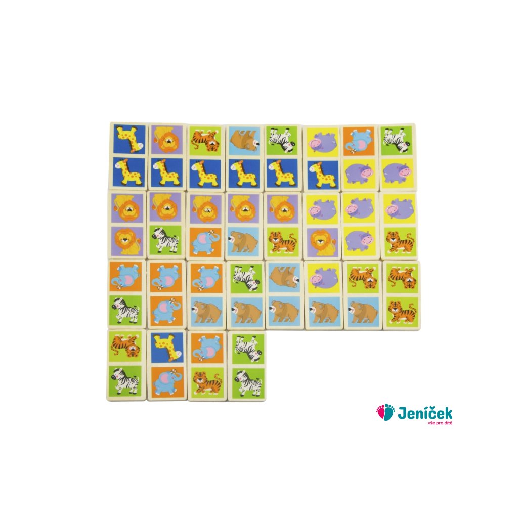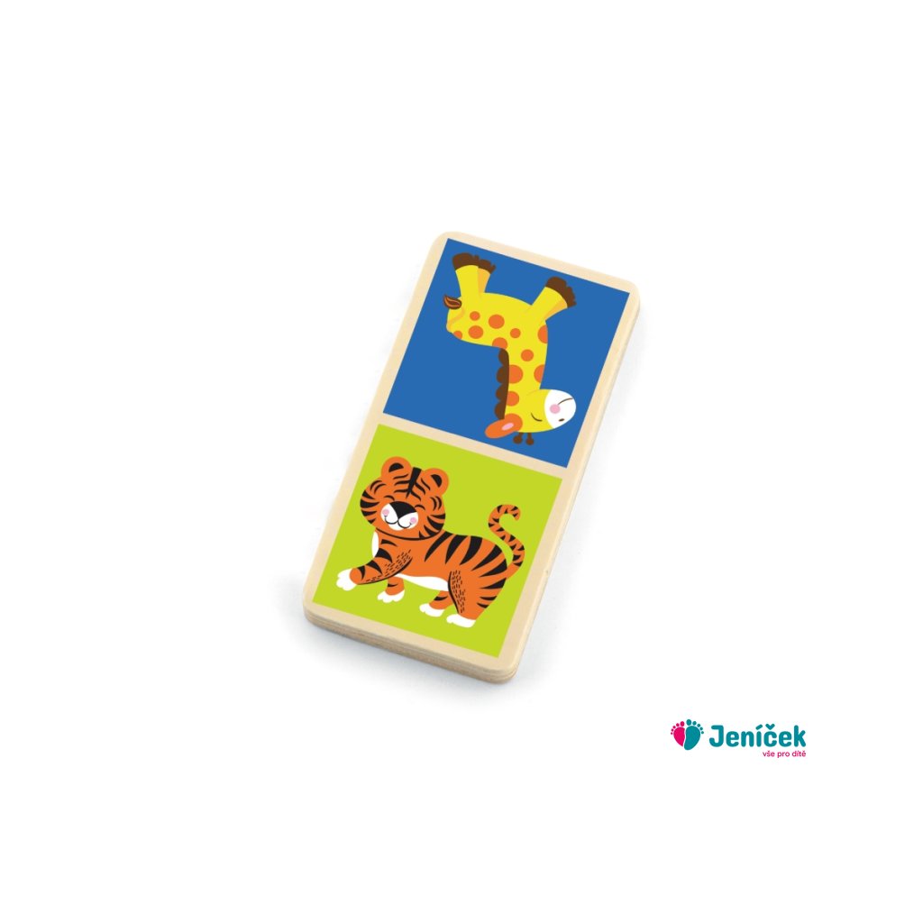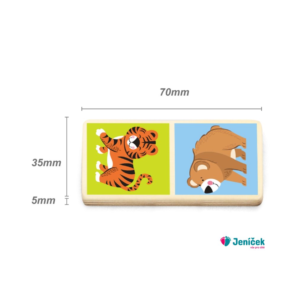 Dřevěné domino s divokými zvířátky. Rozměr jednoho dílku cca 7 x 3,5 x 0,5 cm. Baleno v krabičce, která slouží jako úschovný box pro domino. Rozměry balení cca 21 x 19 x 4,5 cm. Věk 3+