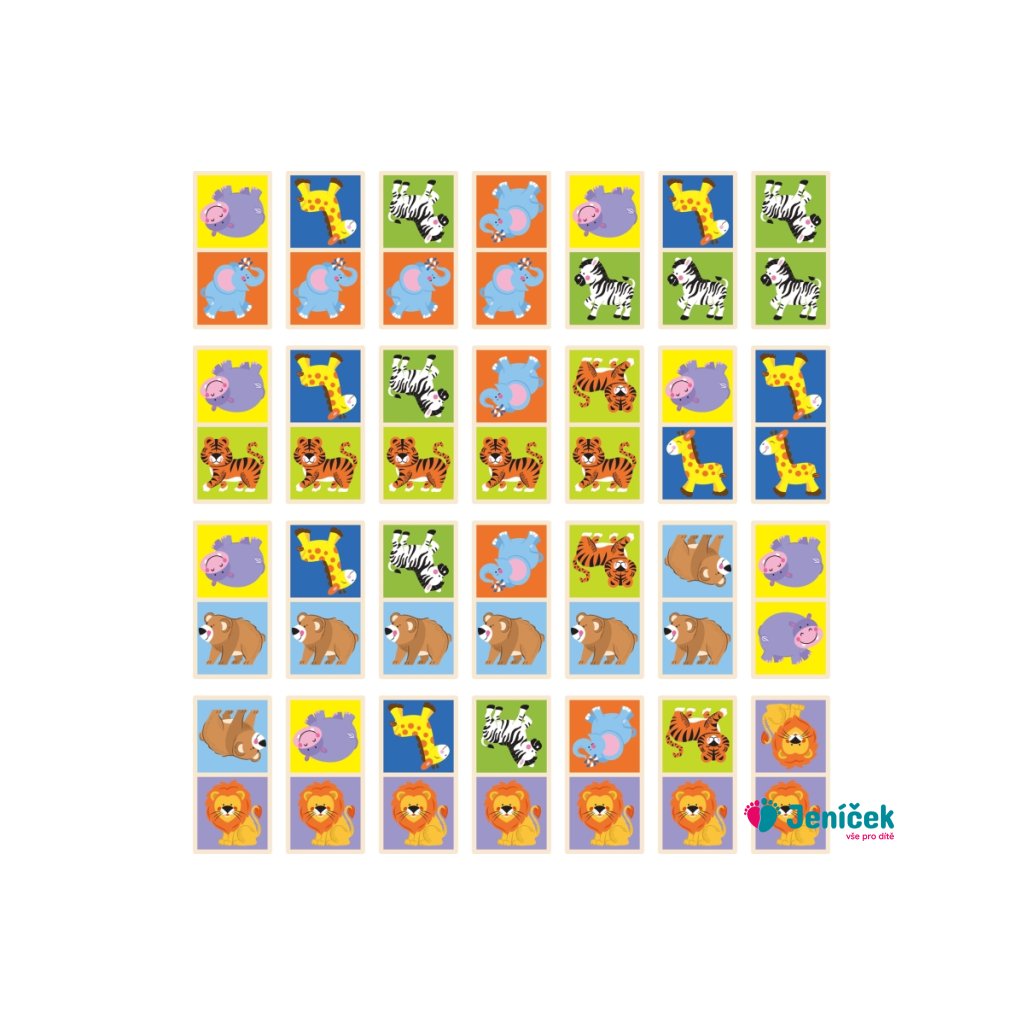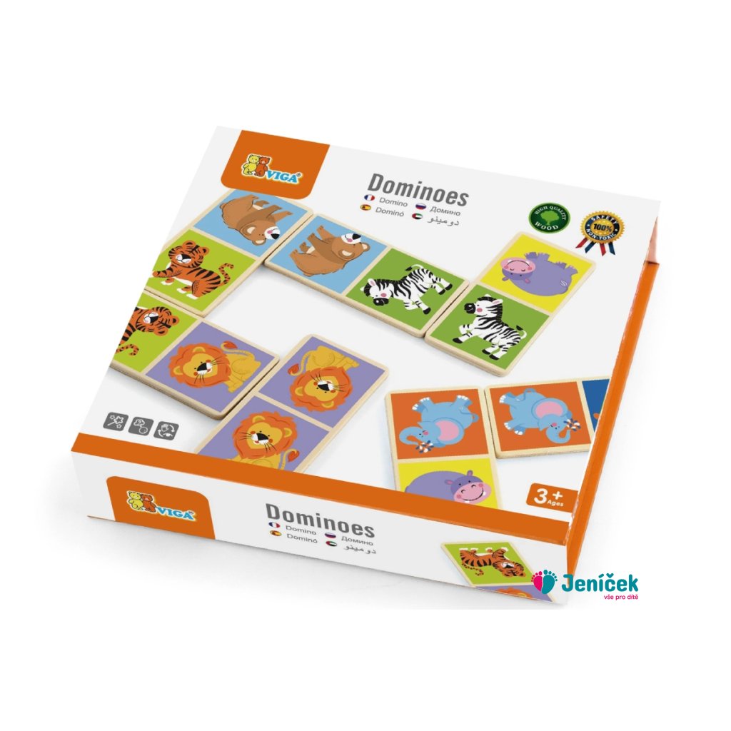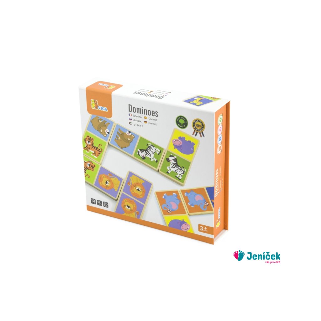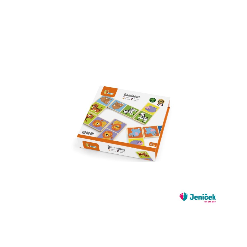 Dřevěné domino s divokými zvířátky. Rozměr jednoho dílku cca 7 x 3,5 x 0,5 cm. Baleno v krabičce, která slouží jako úschovný box pro domino. Rozměry balení cca 21 x 19 x 4,5 cm. Věk 3+