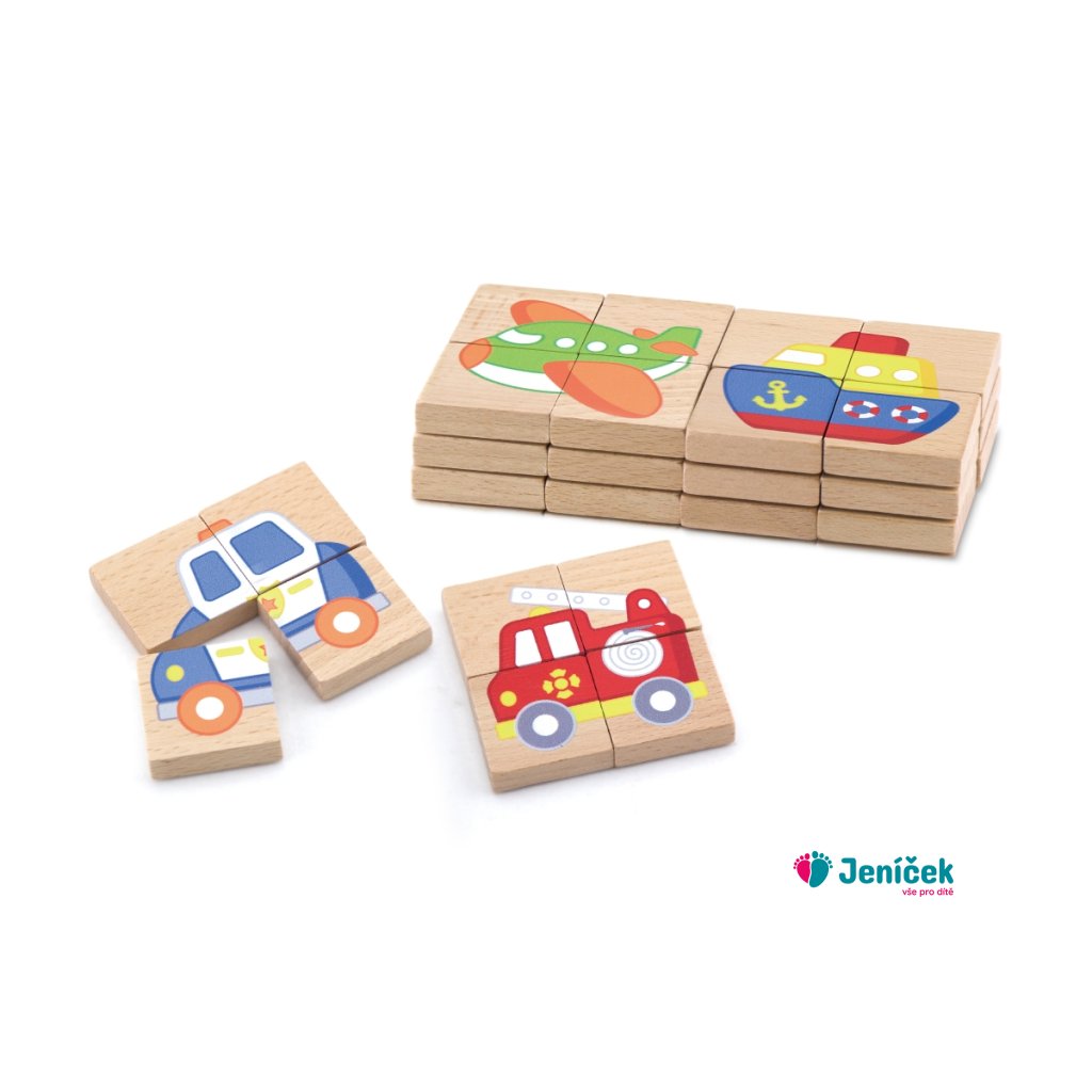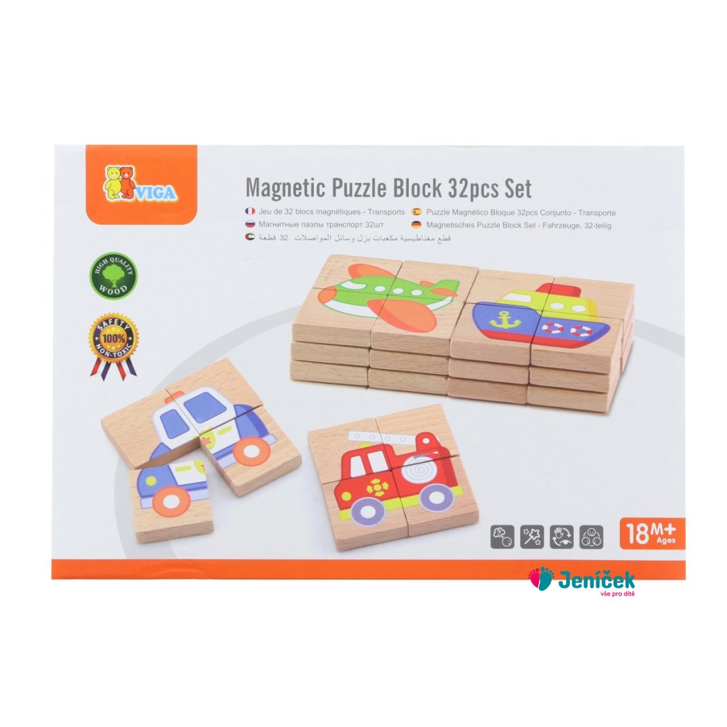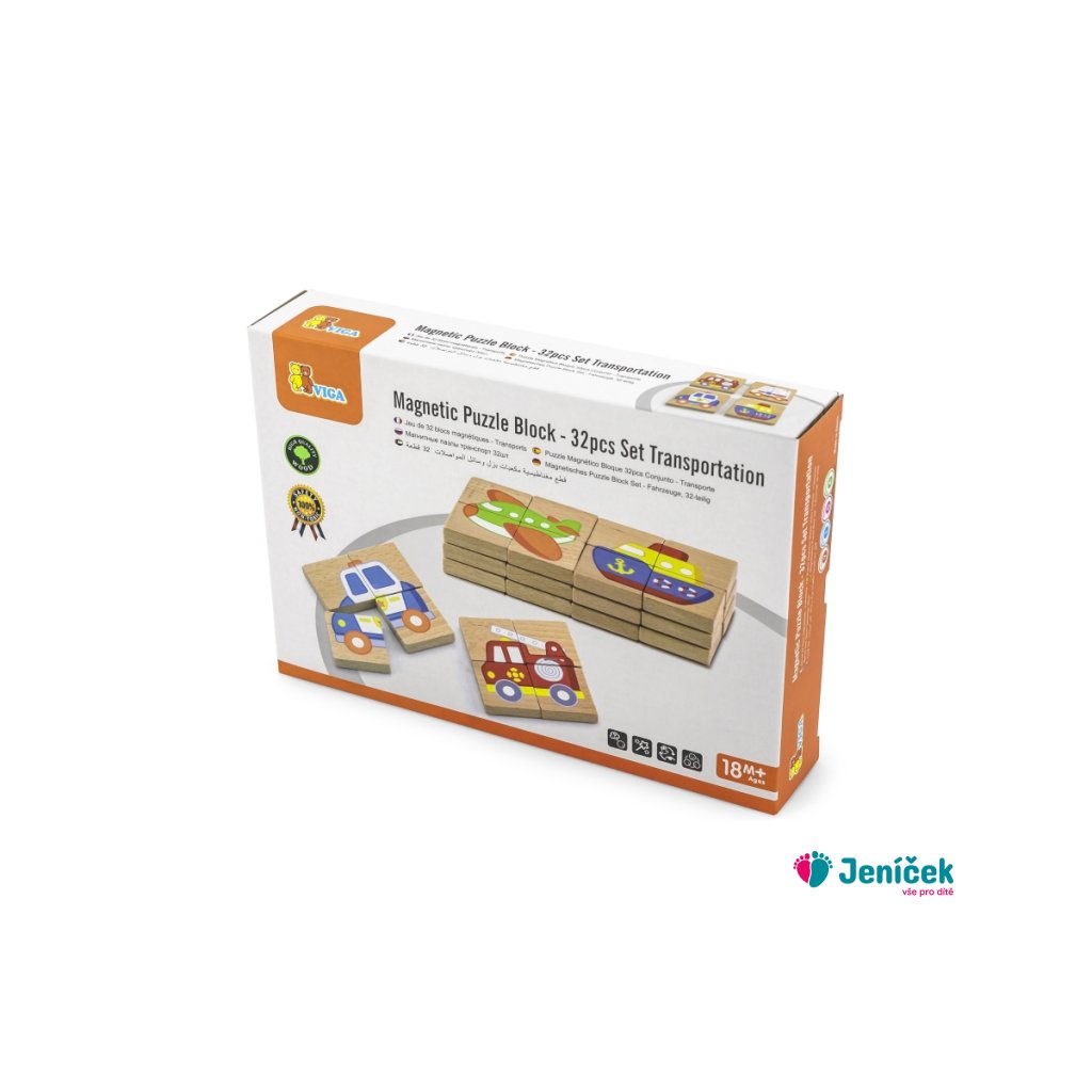 Dřevěné magnetické puzzle s motivy dopravních prostředků. Balení obsahuje celkem 32 kusů. Rozměry balení cca 26 x 18 x 5 cm. Věk 18m+