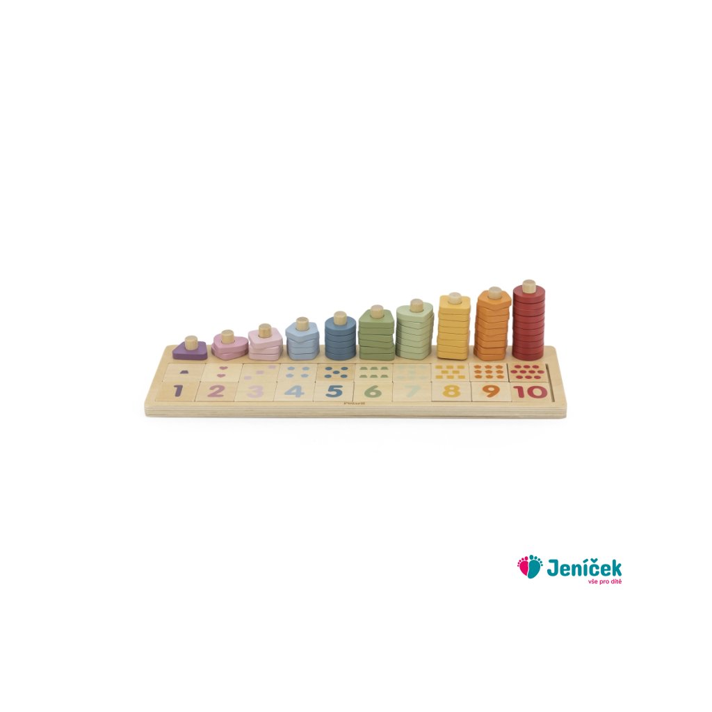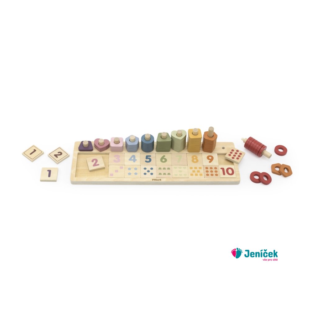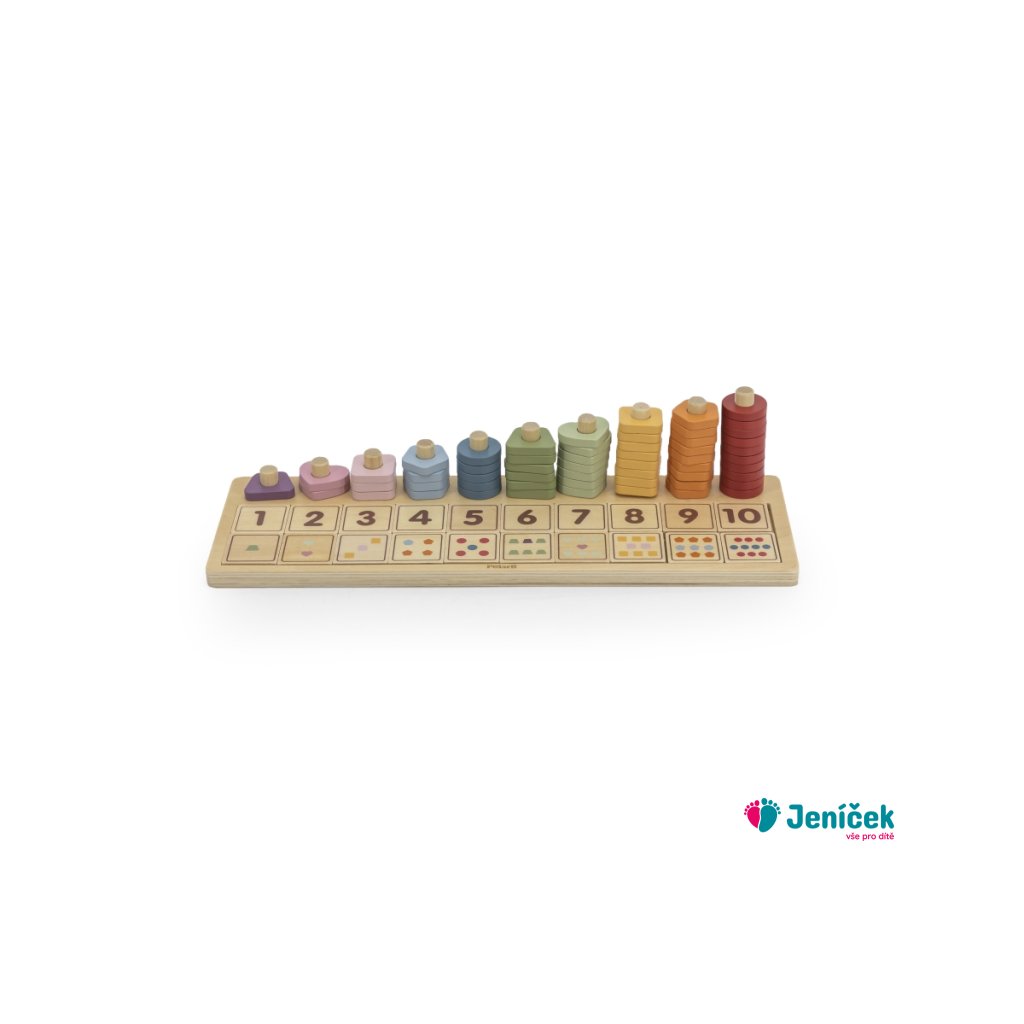 Dřevěná hra určená k trénování počítání do deseti. Hra obsahuje desku, stojánky určené k navlékání určitého počtu různých tvarů, kostičky s čislicemi a kostičky s obrázkama. Rozměry hry 36,5x11,4x8,5 cm. Rozměry balení cca 37x13x6 cm. Věk 3+