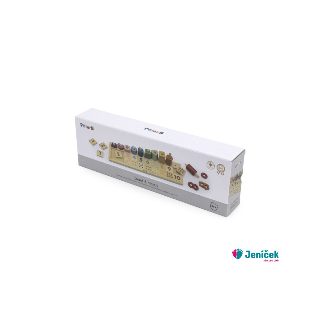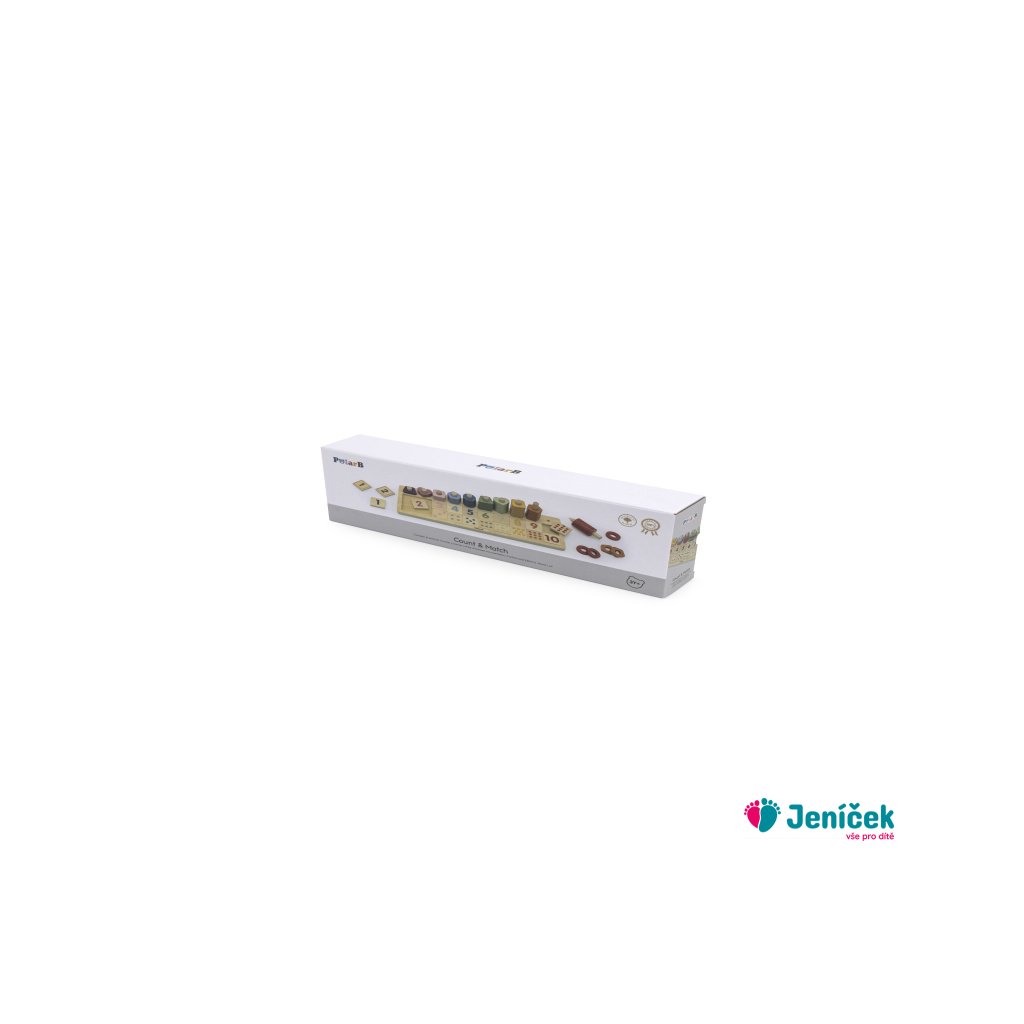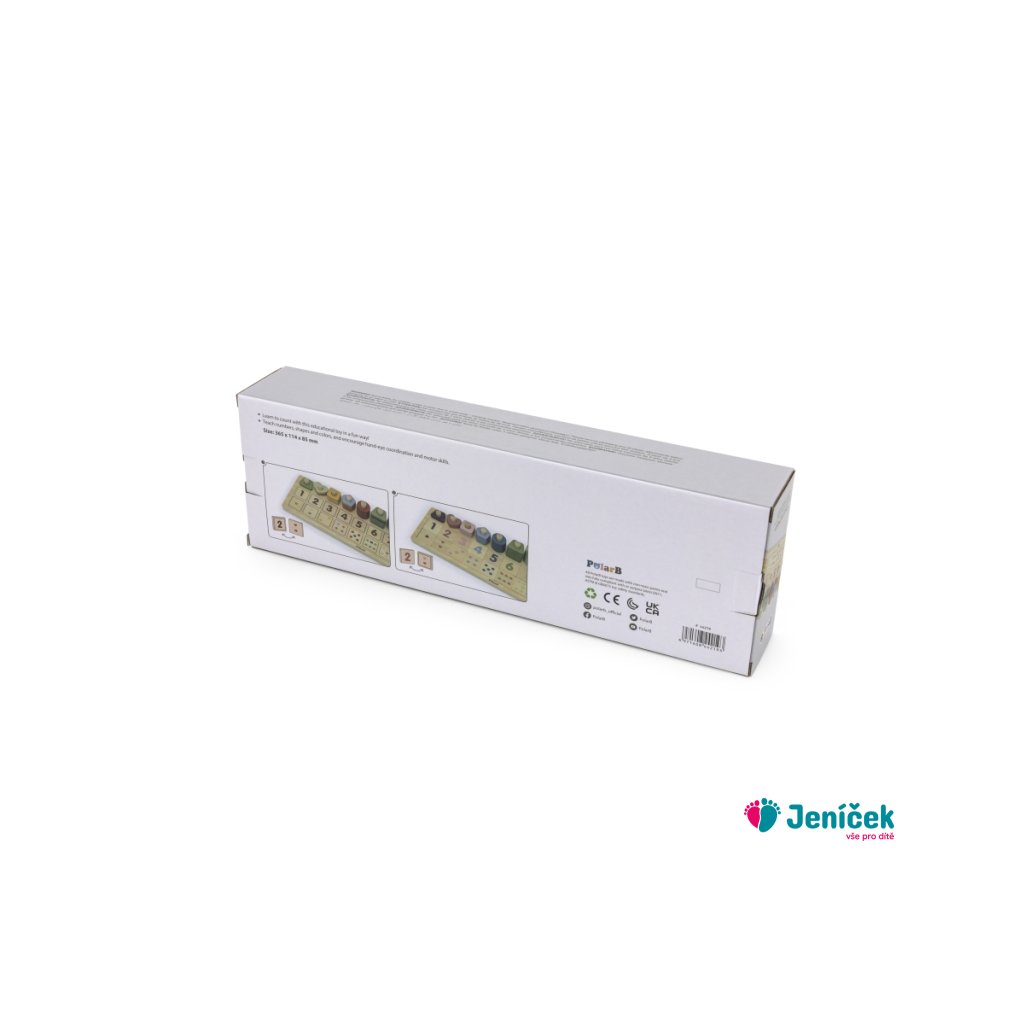 Dřevěná hra určená k trénování počítání do deseti. Hra obsahuje desku, stojánky určené k navlékání určitého počtu různých tvarů, kostičky s čislicemi a kostičky s obrázkama. Rozměry hry 36,5x11,4x8,5 cm. Rozměry balení cca 37x13x6 cm. Věk 3+