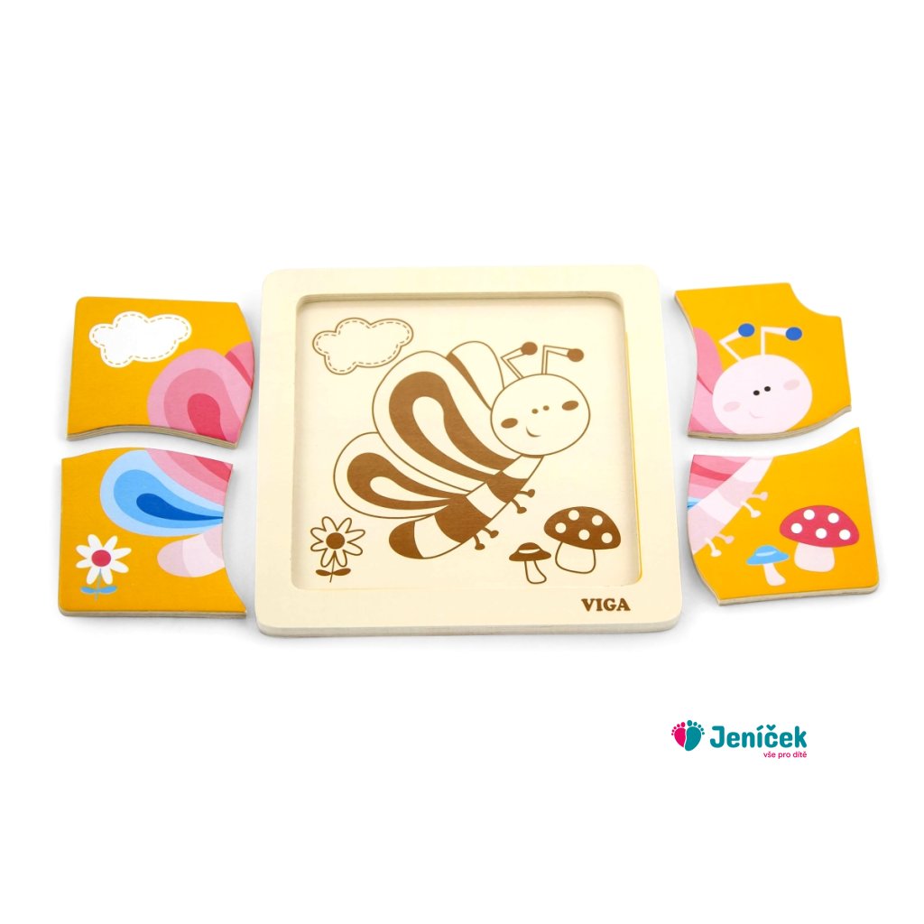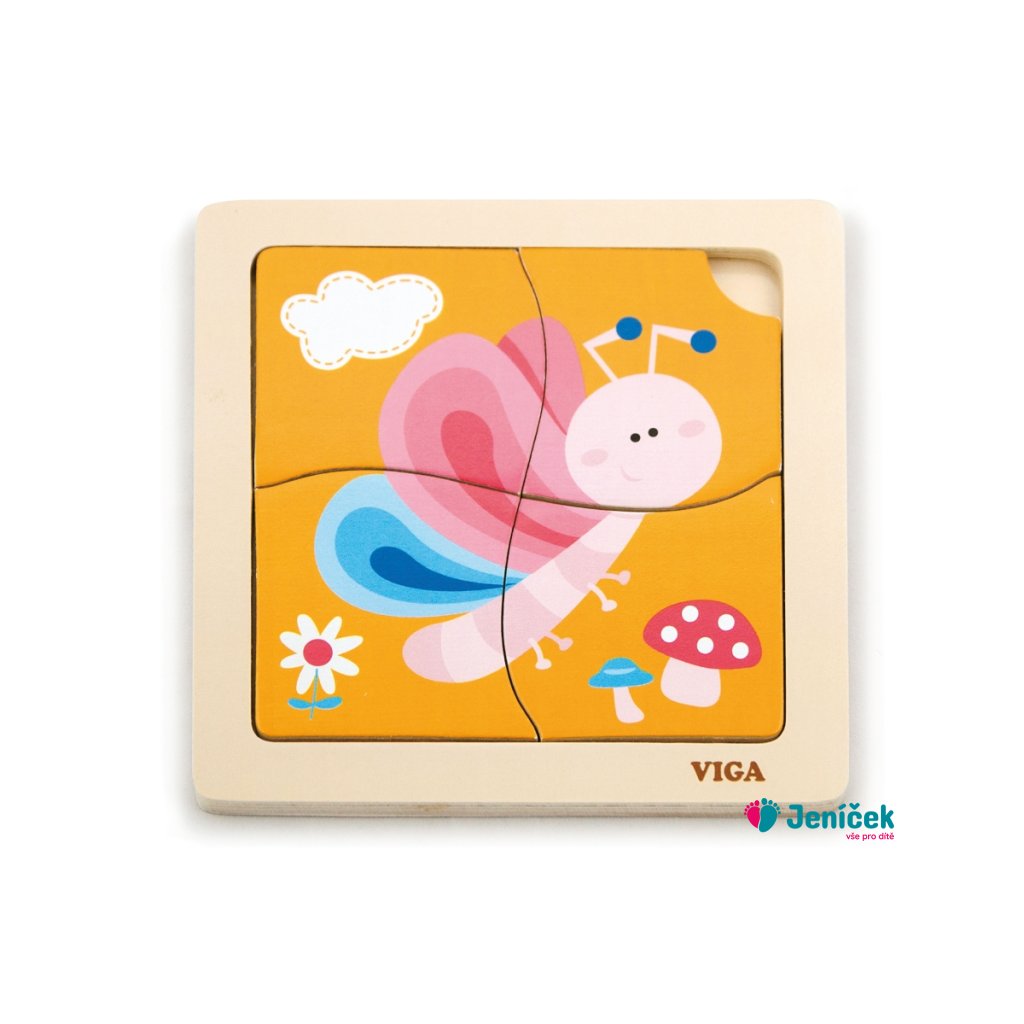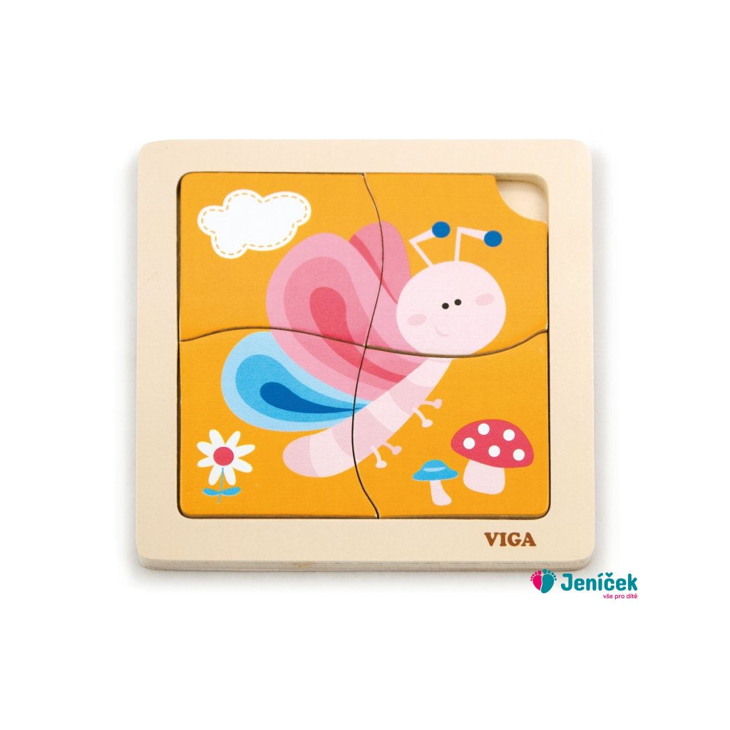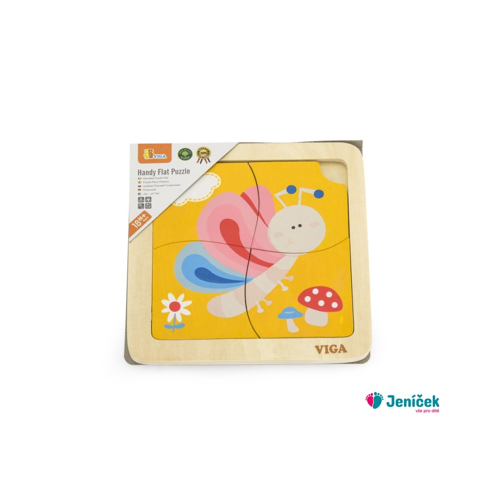 Dřevěné puzzle motýl, obrázek o rozměru cca 12 x 12 cm. Rozměry balení cca 15 x 15 x 1 cm. Věk 18m+
