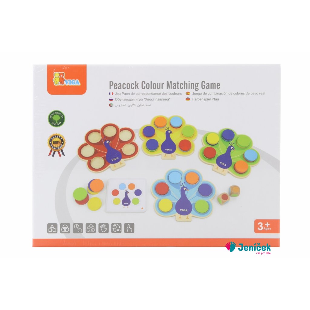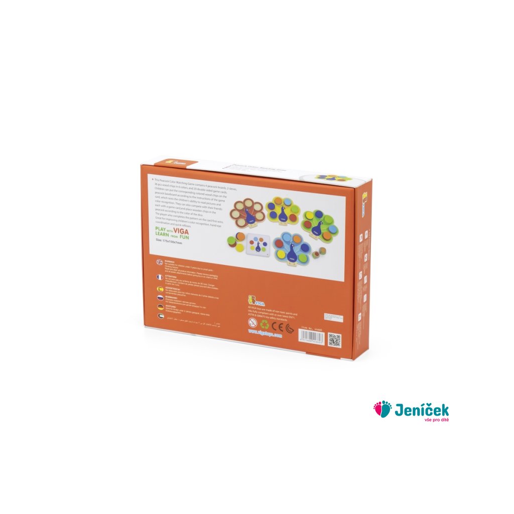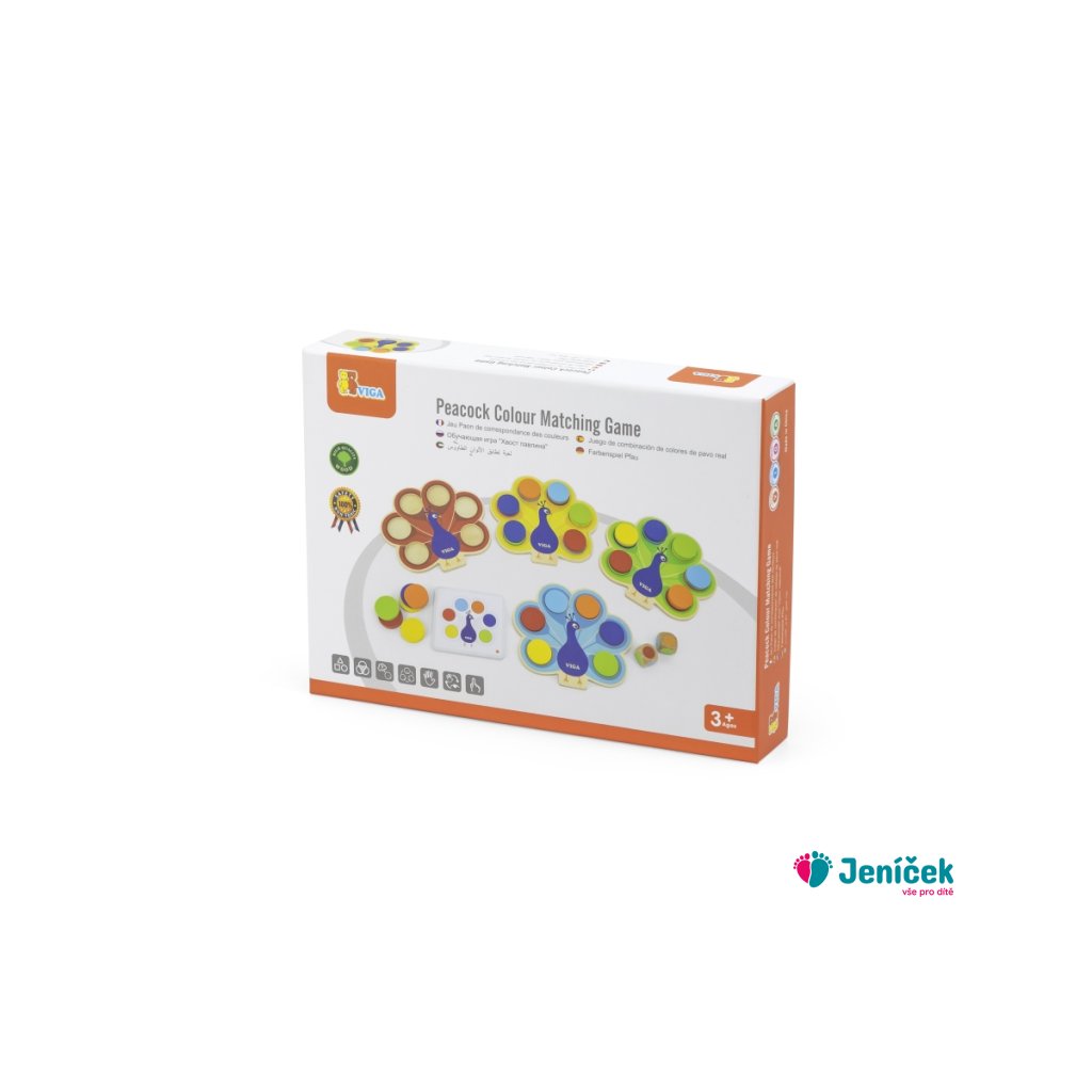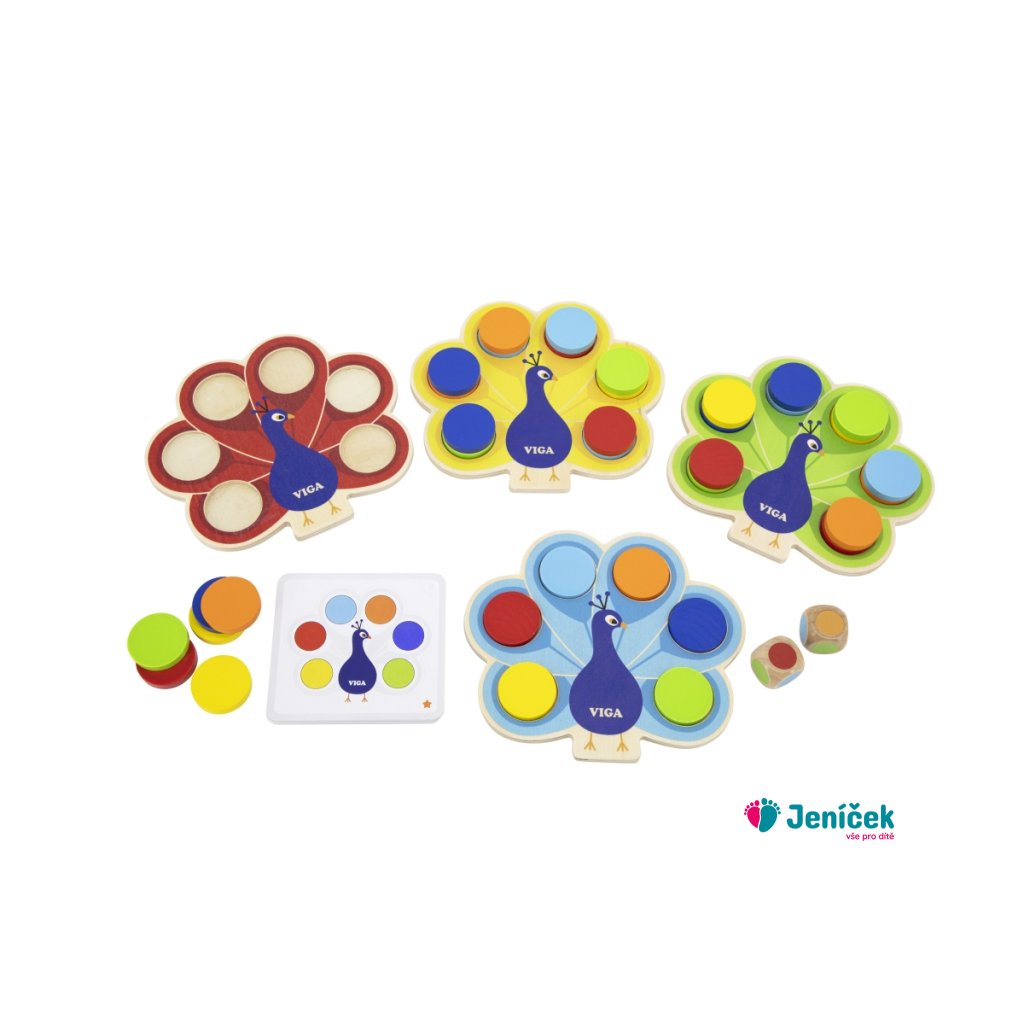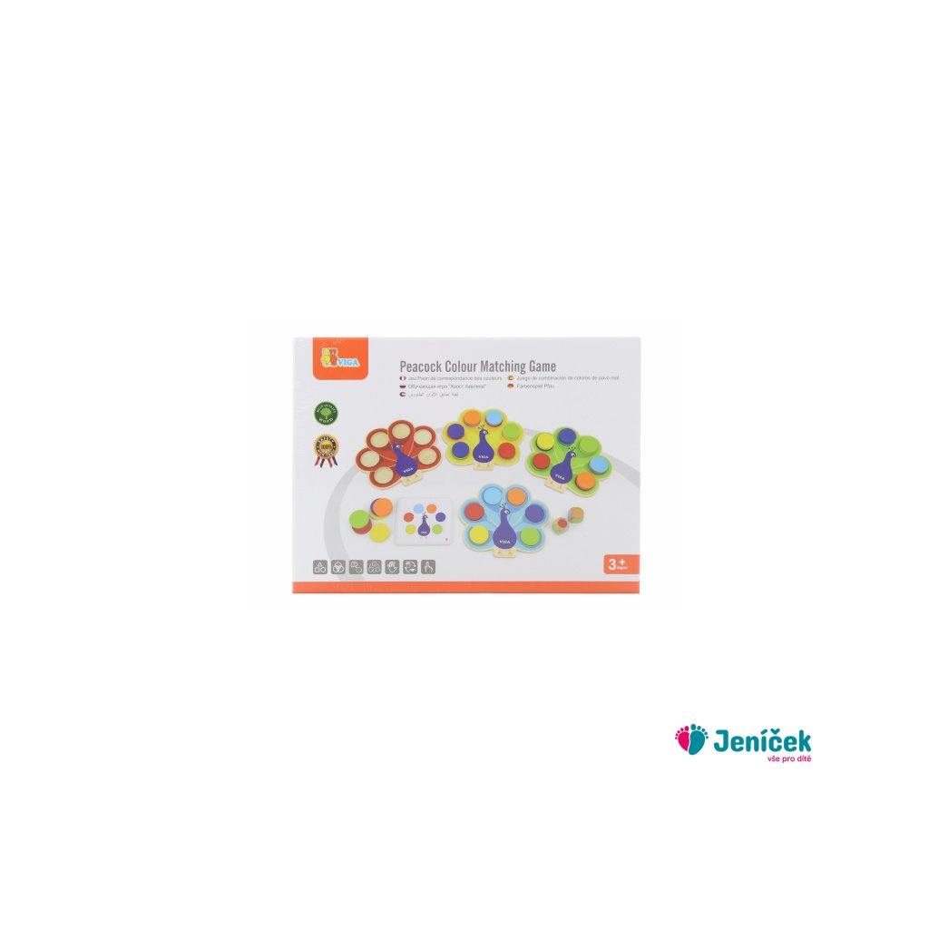 Dřevěná hra Barevný páv obsahuje 4 pávy (hrací základny), 36 dřevěných žetonů v 6 barvách a 20 hracích kartiček. Rozměry balení cca 26,5 x 19,5 x 5 cm. Věk 3+