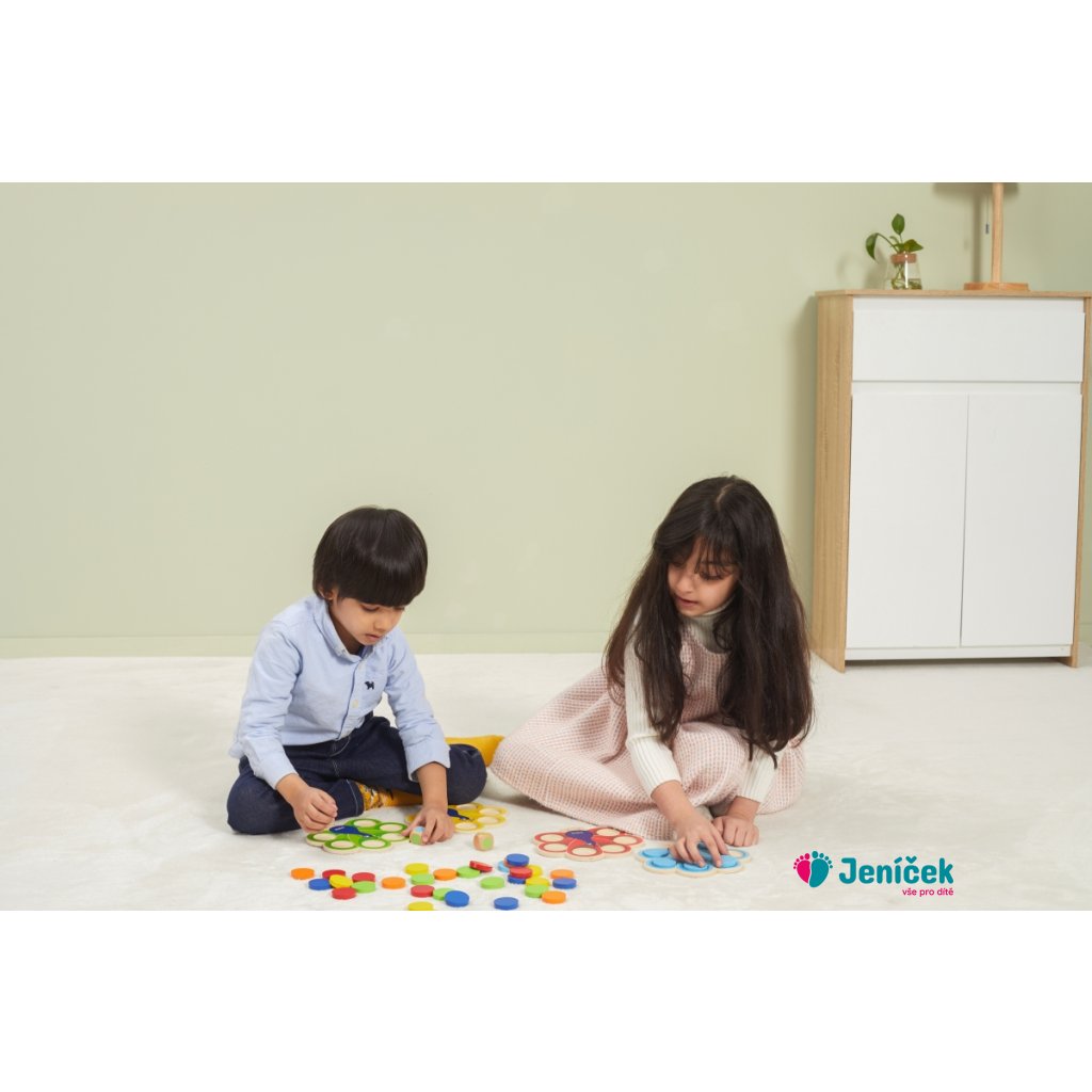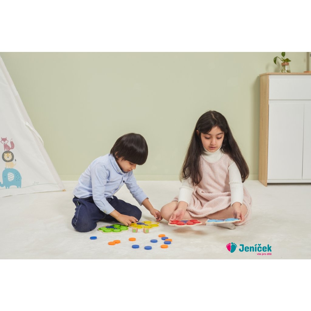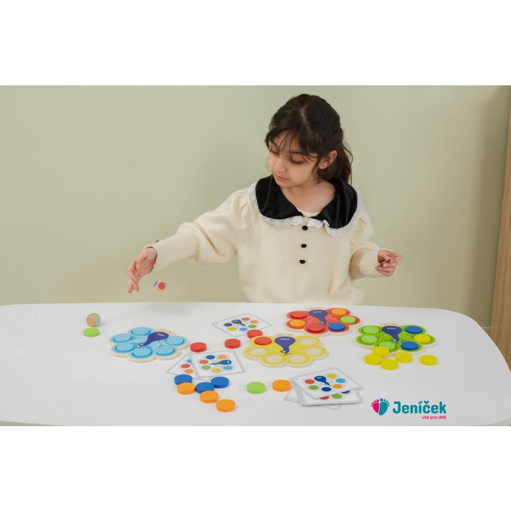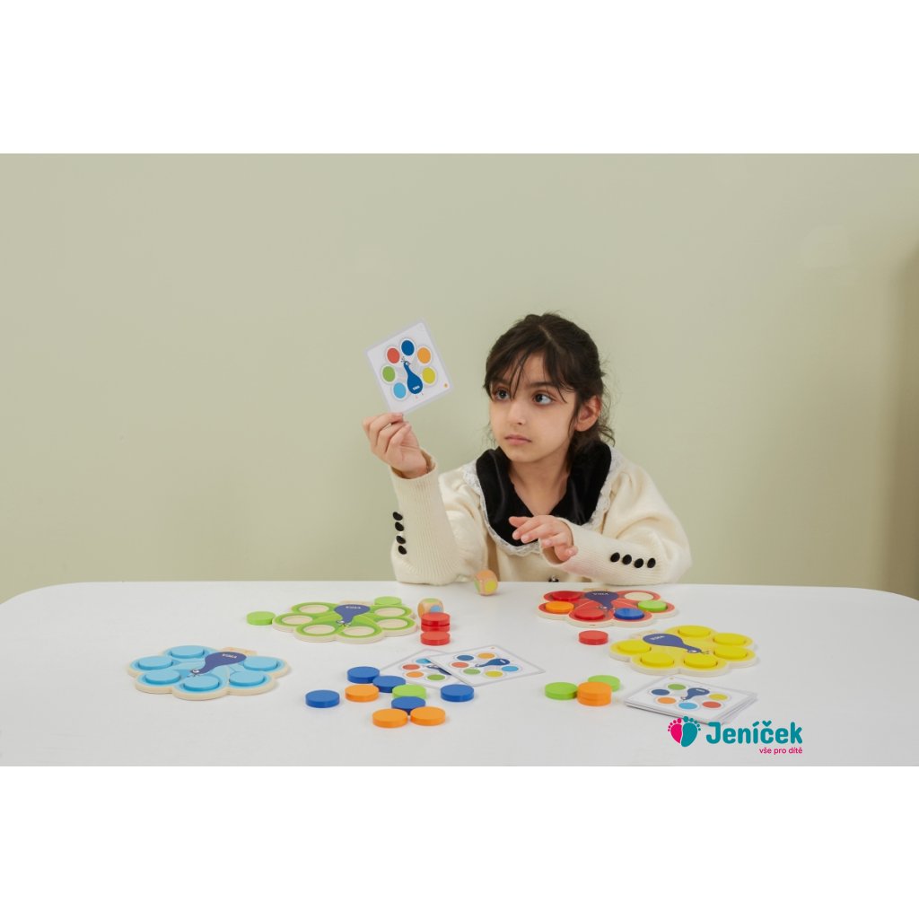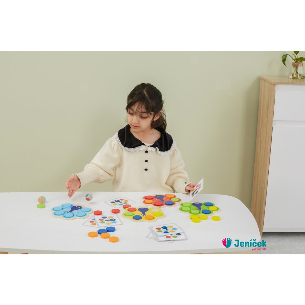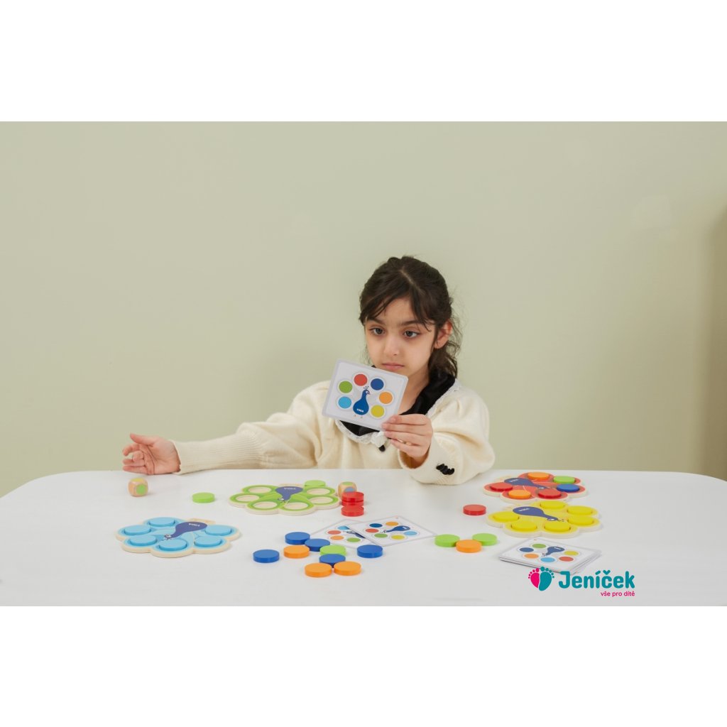 Dřevěná hra Barevný páv obsahuje 4 pávy (hrací základny), 36 dřevěných žetonů v 6 barvách a 20 hracích kartiček. Rozměry balení cca 26,5 x 19,5 x 5 cm. Věk 3+