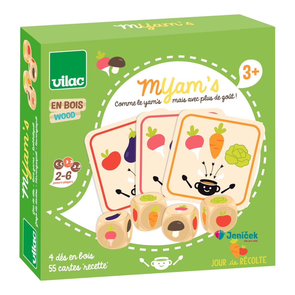 Nejen vegani si užijí tuto zábavnou zeleninovou hru! Lízněte si kartičku s receptem a pokuste se na kostkách hodit vyobrazenou kombinaci. Kdo bude mít více štěstí a shromáždí více karet? Díky jednoduchým pravidlům a obrázkům si zahrají i nejmenší, starší mohou hru okořenit i počítáním a jednotlivým druhům zeleniny přiřadit různou hodnotu. Hlavní vlastnosti:55 hracích kartiček a 4 kostkypro 2–6 hráčůatraktivní design a zpracování Zkrácený návod hry:Cílem hry je za pomocí kostek vytvořit kombinace odpovídající kartičkám receptů. Rozdejte 3 kartičky receptů každému hráči. Hráči se na tahu střídají. Tah začíná hodem kostek. Hráči mají 3 hody za každý tah. Při prvním hodu hodí všemi třemi kostkami, při dalších pak mohou házet všemi nebo jen některými kostkami. Pokud hráč hodí kombinaci, která se shoduje s jednou z jeho kartiček receptů, tuto kartu získá. Poté si lízne kartu novou. Vítězí hráč, který jako první získá 10 kartiček receptů. Dokumentace:návod ke hře Den sklizně (CZ)návod ke hře Den sklizně (SK) Výrobce Vilac se může pyšnit úzkou spoluprací s francouzskou agenturou ADEME. Takto označené hračky jsou vyráběny s ohledy k životnímu prostředí, ekologicky, udržitelně a s využitím obnovitelných zdrojů.