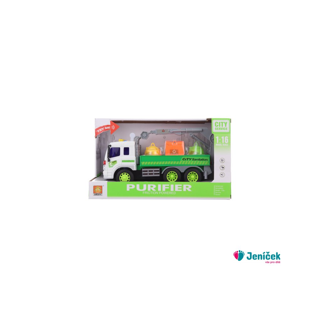 Auto s kontejnery na baterie. Po stisknutí tlačítek na kapotě vydává zvuky a svítí. Rozměry auta cca 28 x 14 cm. Rozměry balení cca 32 x 19 x 12 cm. Napájení 3x AG13 (je součástí balení). Věk 3+