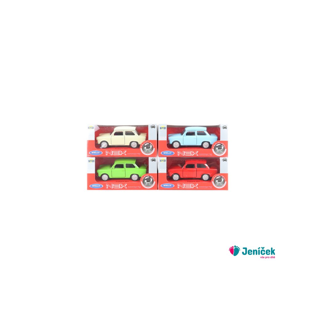 Auto Trabant 601 v měřítku 1:34. Vyrobené z kovových a plastových dílů, otevírací dveře. Baleno v papírové krabičce s fóliovým průhledem. Přišroubováno na papírovém podstavci s popisem typu. Rozměr auta: 11 cm Rozměr balení 15 × 7 × 7 cm. Věk 3+