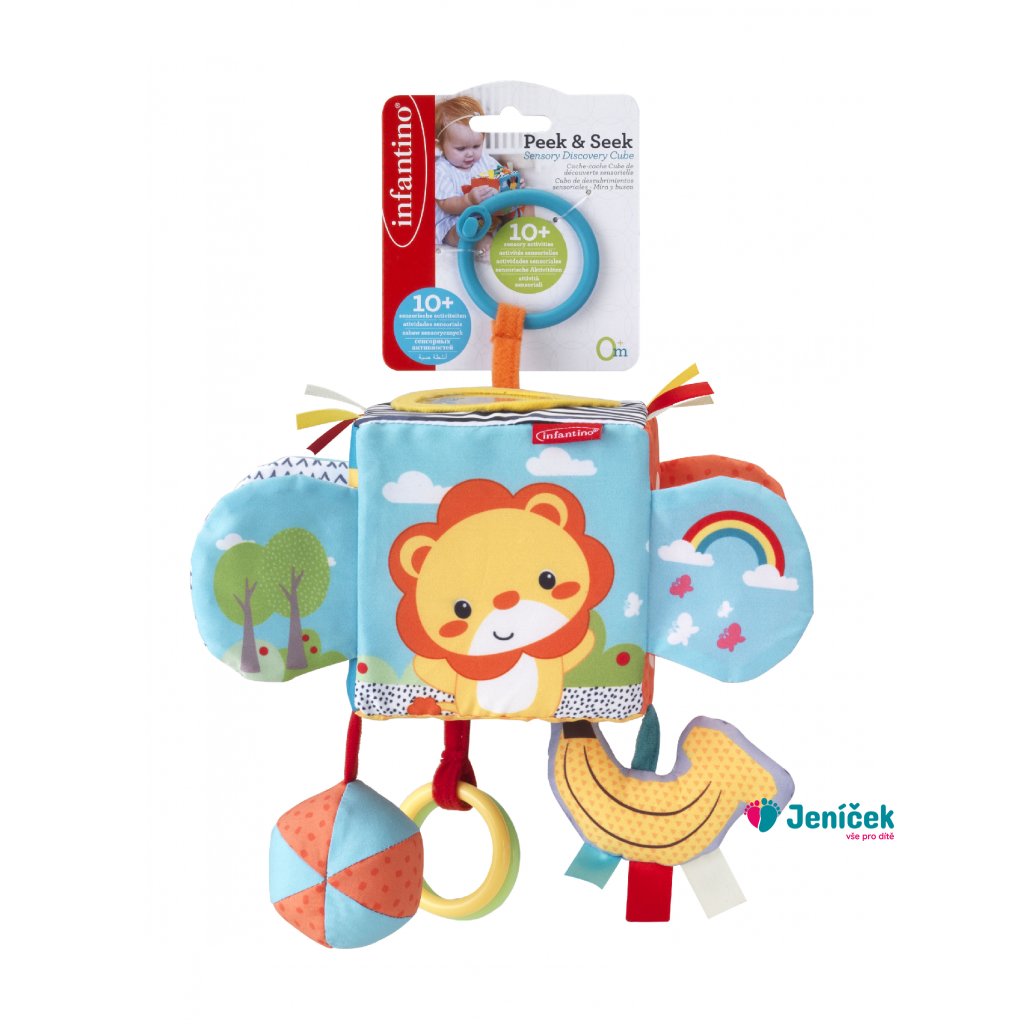 Závěsná textilní hračka s krásnými ilustracemi zvířátek nabízí množství různorodých aktivit ke zkoumání a pozorování včetně bezpečného zrcátka. Jednotlivé části šustí, cinkají či chrastí. Plastový kroužek umožňuje snadné zavěšení na kočárek, postýlku či autosedačku. Rozměry kostky: 11 x 11 x 11 cm Vhodné pro děti od narození.