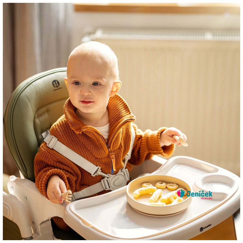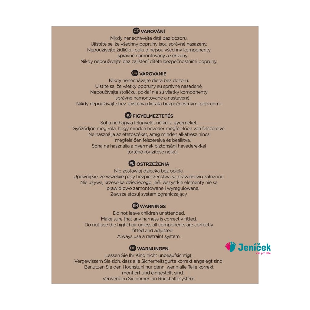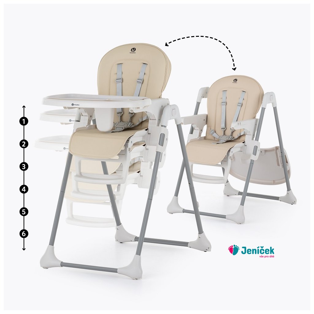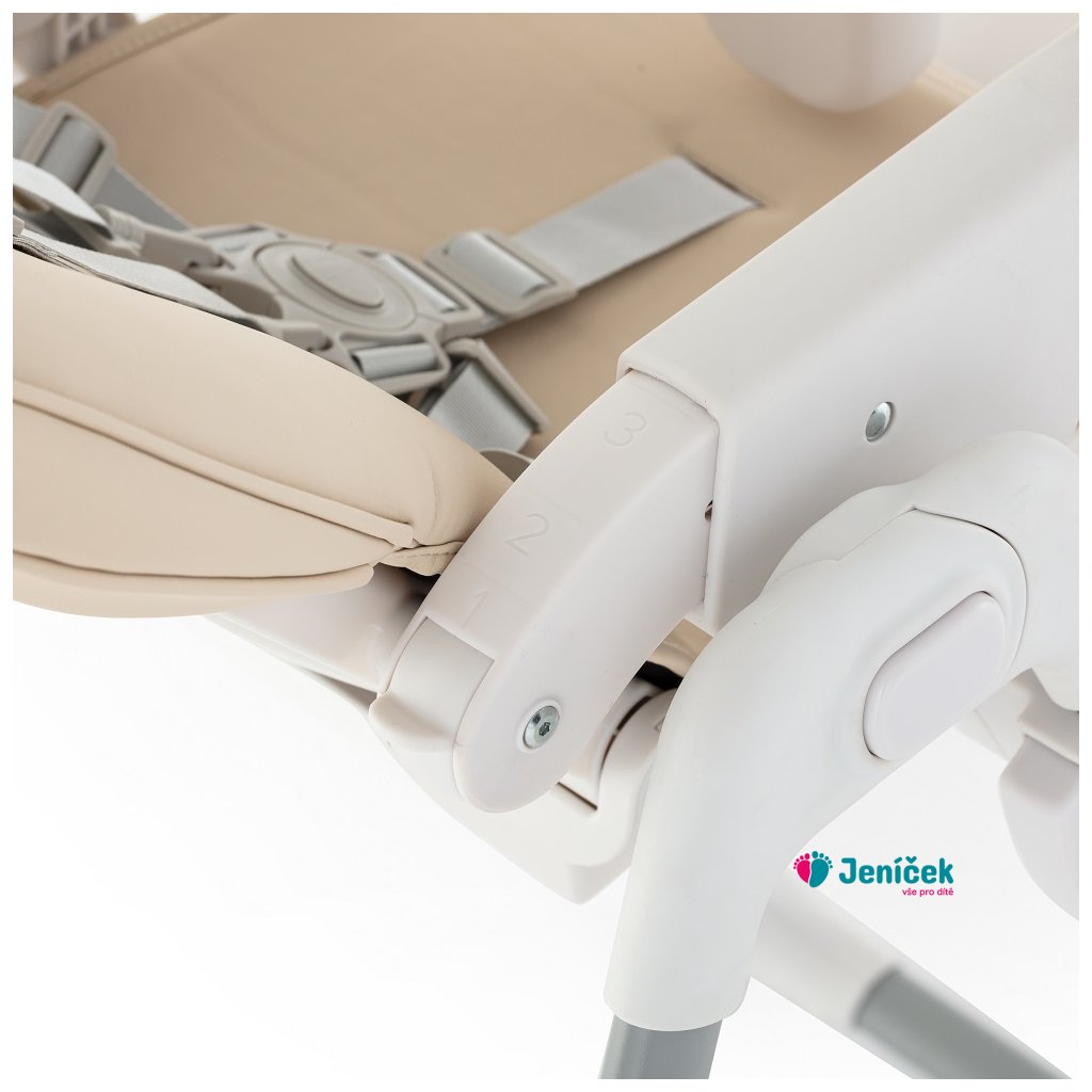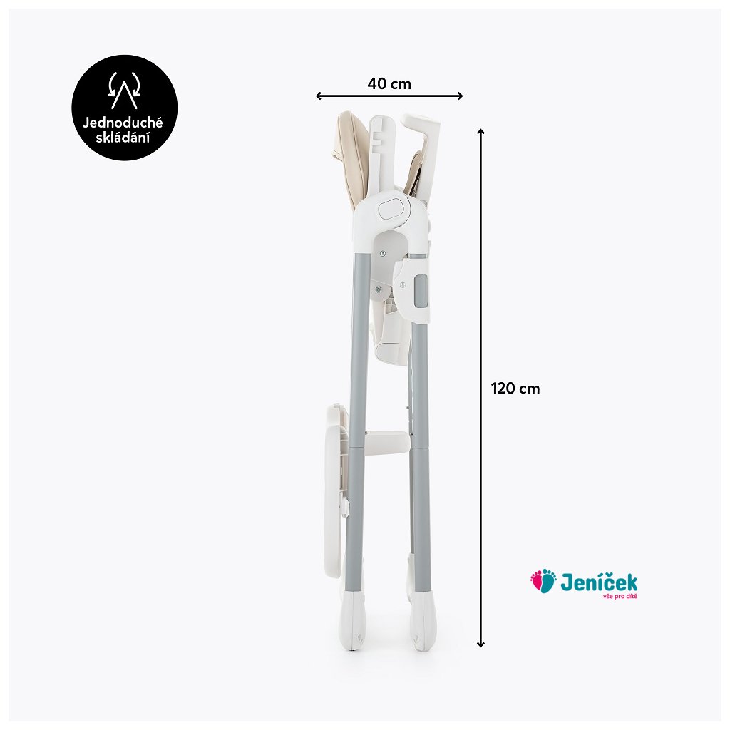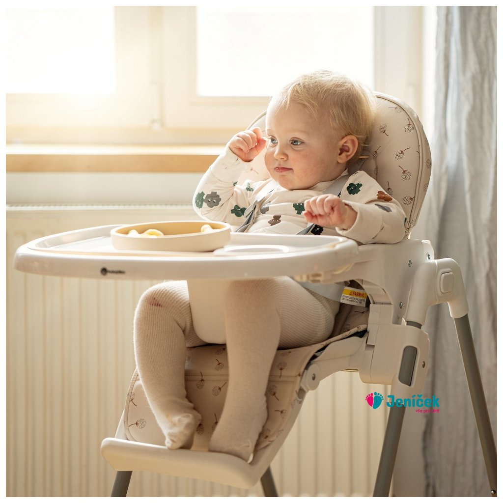 Péče o životní prostředí, kterou jsme při tvorbě této židle zohlednili, nezastínila nejdůležitější aspekty výrobku – byl totiž navržen tak, aby co nejbezpečněji zlepšil každodenní život děťátka i rodičů. Židle má všechny funkce, které usnadňují každodenní krmení: lze ji snadno sundat a vyčistit, má 5-bodové bezpečnostní pásy, nastavitelnou opěrku zad, nastavitelnou opěrku nohou, nastavitelnou výšku, dvě polohy pro podnos s horní částí, kterou lze mýt v myčce nádobí. Stabilní konstrukce židle zajistí bezpečnost vašeho dítěte bez ohledu na to, jak je aktivní nebo pohyblivé. Vysoce kvalitní provedení, promyšlená konstrukce, moderní a originální design a kompaktní skládání jsou nadčasové vlastnosti, které zajistí pohodlí pro vaše dítě od okamžiku, kdy se naučí sedět.