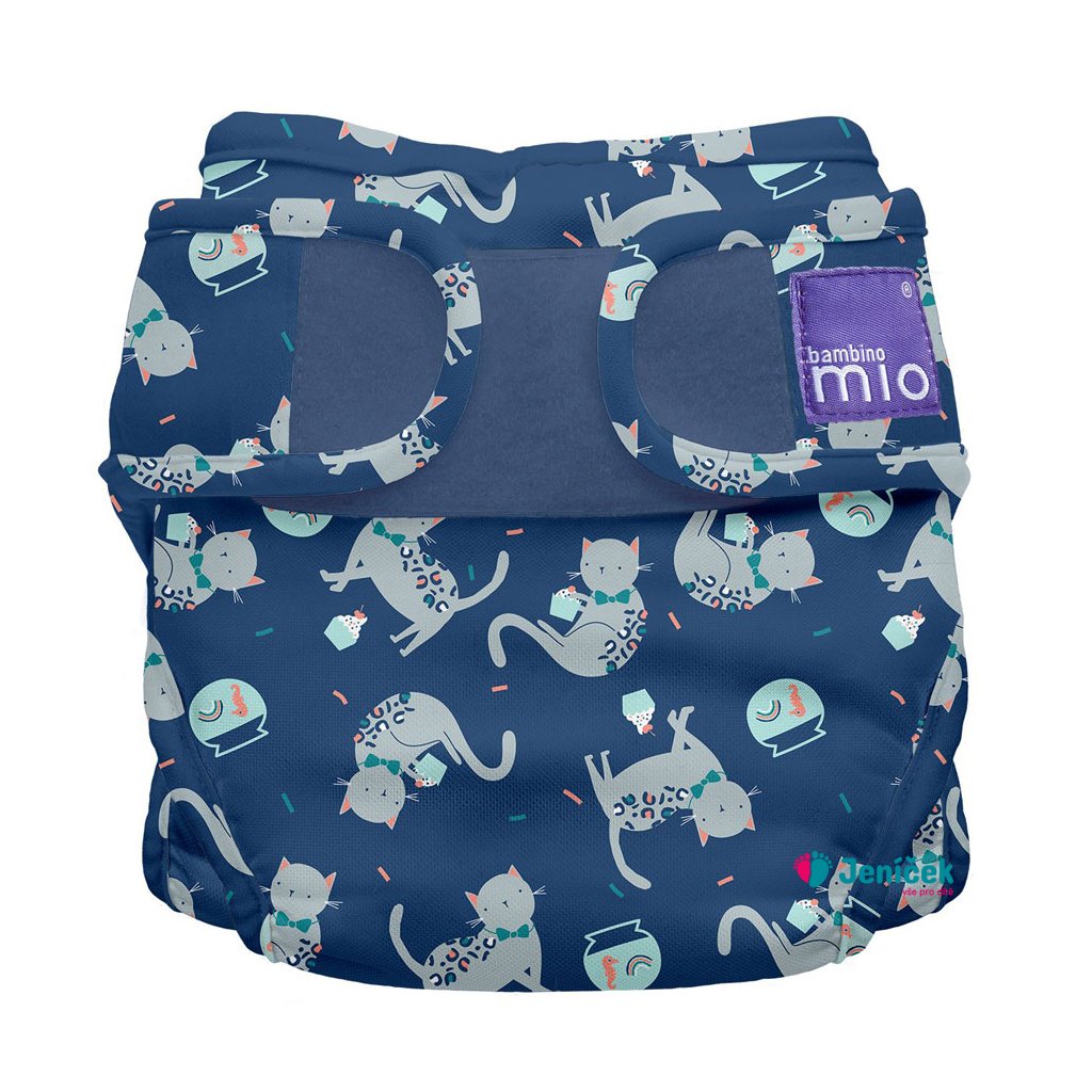 Svrchní plenkové kalhotky Miosoft Feline Fiesta patří k dvoudílnému systému Bambino Mio, kde jedna velikost originální plenky a dvě velikosti plenkových kalhotek budou stačit od narození do doby, kdy bude vaše děťátko chodit na nočník. Díky svému zapínání na suchý zip je práce s nimi velice rychlá, jednoduchá a umožňuje přizpůsobení každému dítěti. Tvar suchého zipu brání vytváření ostrých rohů a tak chrání před odřením jemné dětské pokožky. Vnitřní polyuretanová vrstva propouští menší molekuly plynů a par avšak zabraňuje průchodu kapalin a tekutin. Dítě se tak nezapaří, ale ani neznečistí své okolí. Pozor, působení dětských olejíčků snižuje životnost nepropustné vrstvy.