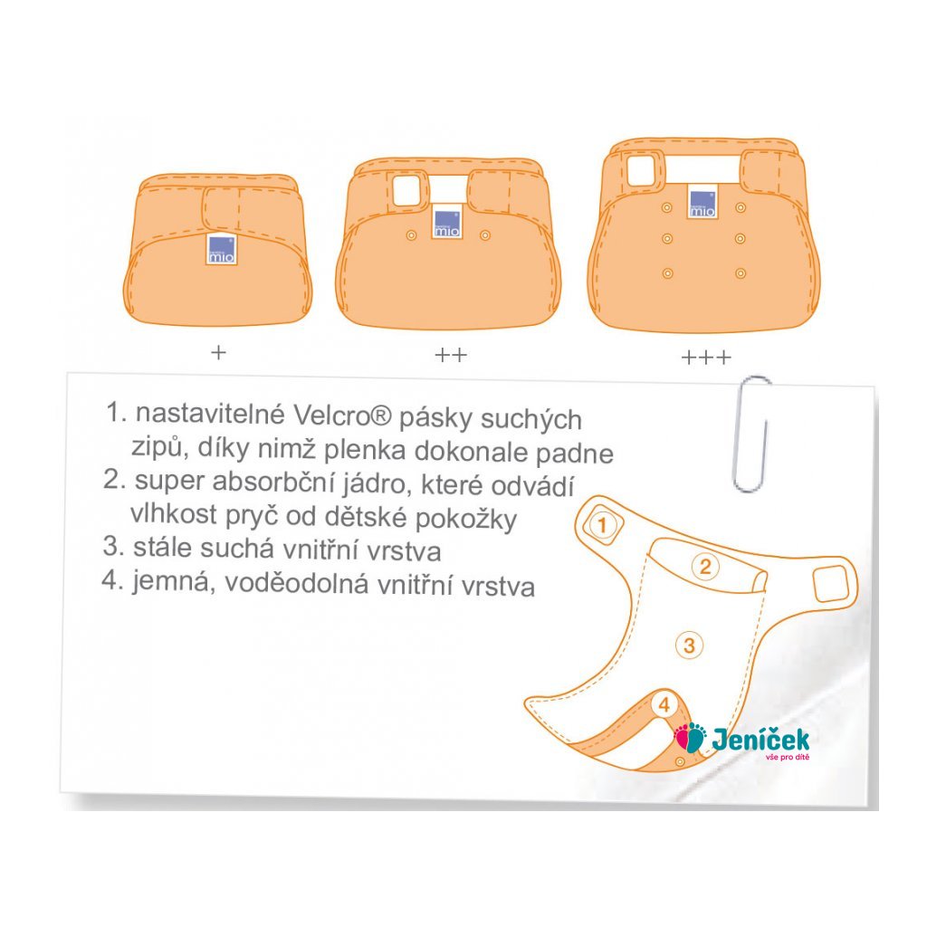 - Velikost plenky se dá jednoduše přizpůsobit velikosti vašeho dítěte pomocí dvou řad patentů a optimalizovaných pásků suchých zipů Velcro®, díky nimž plenka dítěti dokonale padne.