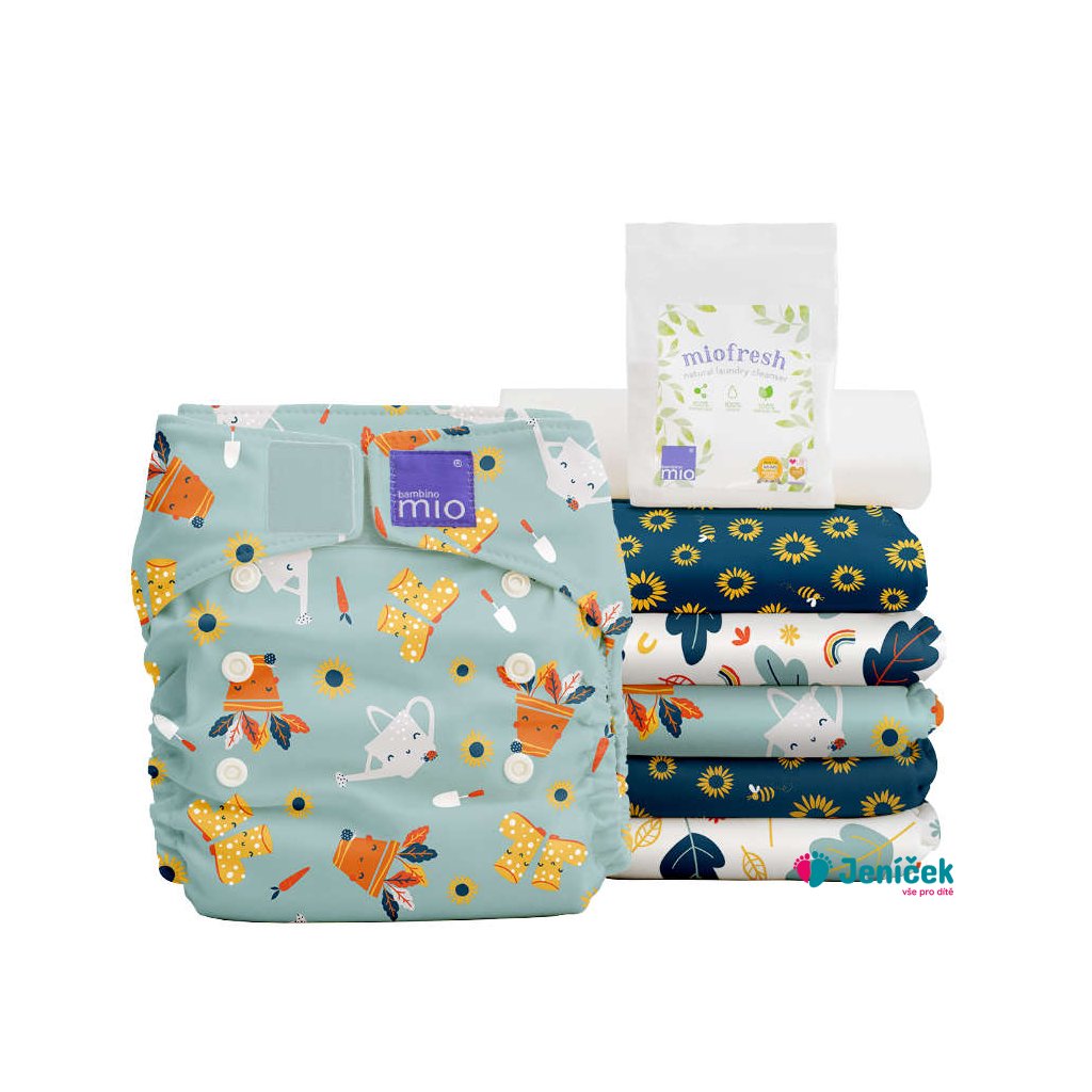 Plenkový set obsahuje: 6x plenky miosolo (různé vzory), 50ks separační vložky mioliners, 100g dezinfekční prostředek miofresh