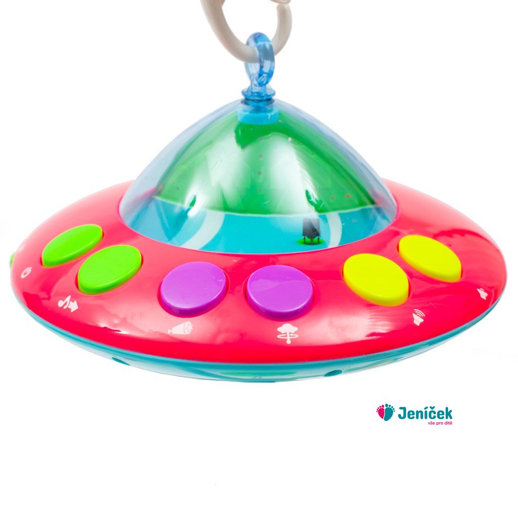 Kolotoč nad postýlku se světelným projektorem a ovladačem Bayo je určen nejmenším dětem, které se ještě samy nepohybují. Rozvíjí zrakově-pohybovou koordinaci dítěte a uklidňuje ho před usnutím. Kolotoč má světelný projektor s hvězdičkami, který mění barvu a plní také funkci noční lampičky. Pomocí tlačítek na projektoru lze nastavit melodii, rotaci kolotoče a promítání hvězdiček. Figurky lze odmontovat a používat jako chrastítka. Hrací strojek nabízí různé melodie. Má nastavitelnou hlasitost. Výška jednotlivých figurek cca 10 cm. Baterie nejsou součástí balení - 3 x AA 1,5V.- světelný projektor (noční obloha)