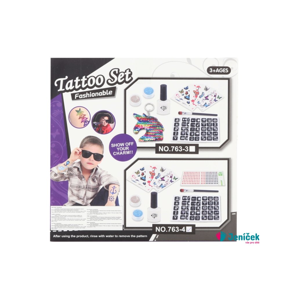 S touto tetovací sadou můžete vytvořit krásné třpytivé tetování na každý den. Balení obsahuje 5 archů tetování, samolepky, šablony, třpytky, štěteček a tetovací gel. Rozměry balení cca 18,5 x 18,5 x 2,5 cm. Věk 3+