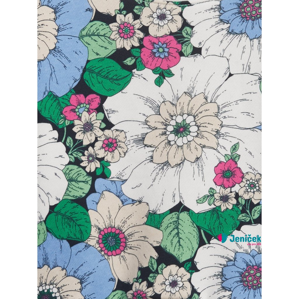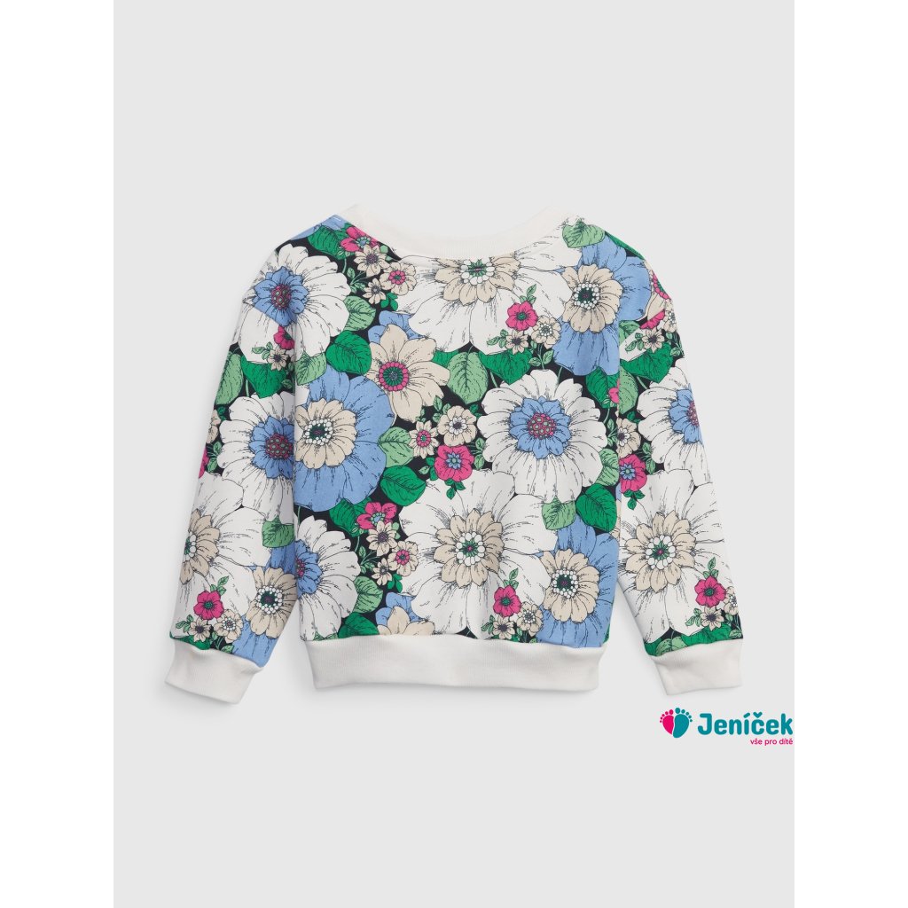 Dětská mikina přes hlavu. Vícebarevný květinový vzor. Kulatý výstřih s pružným nápletem. Dlouhé rukávy a jednobarevné náplety. 77% bavlna, 23% polyester