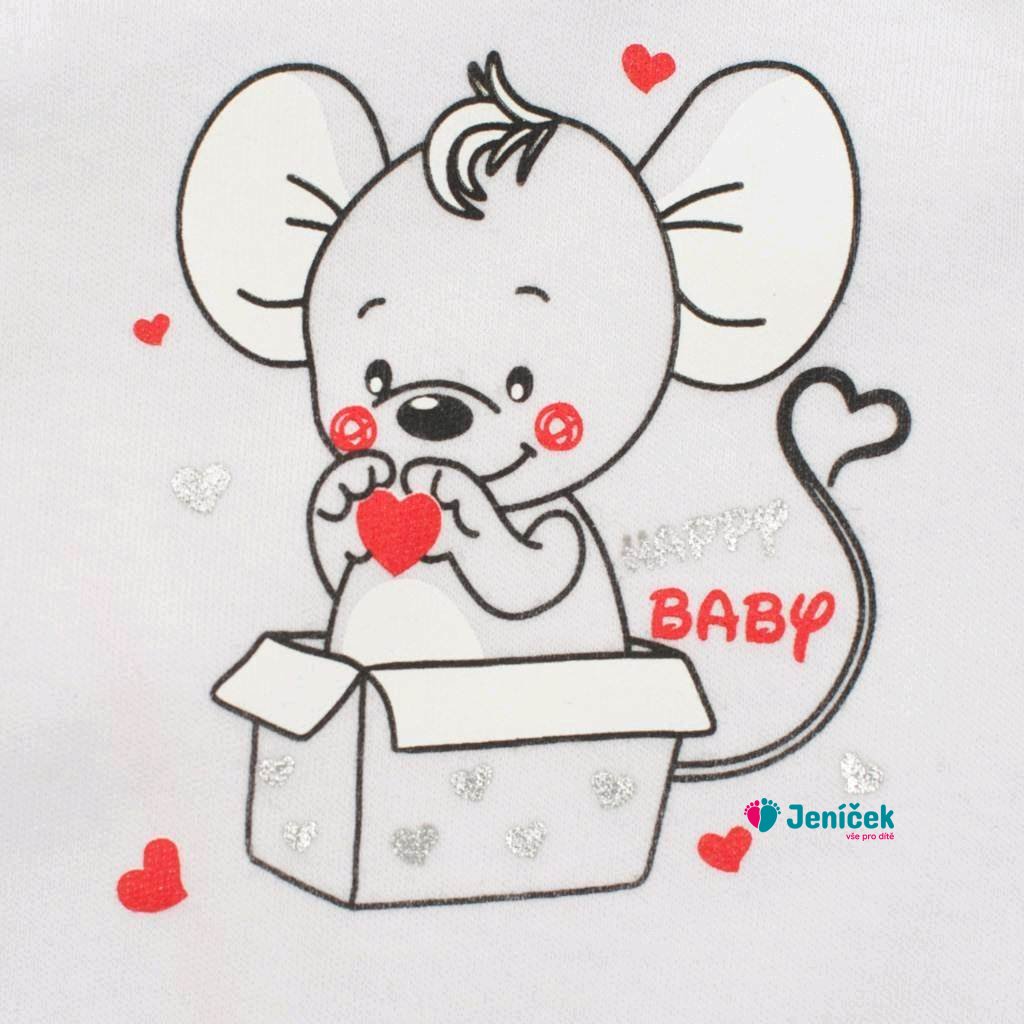 Nápaditá bavlněná kojenecká soupravička New Baby Mouse pro miminka. Součástí soupravičky jsou dupačky a kabátek. Kabátek je jednobarevný. Zapínání na cvočky po celé délce usnadňuje oblékání. Dupačky jsou zdobené barevným lemováním a velkým obrázkem myšky. Zapínání na cvočky na ramínku a mezi nožičkami usnadňuje oblékání a přebalování. Soupravička má velice příjemňoučký a kvalitní materiál, který je ideální pro miminka. Složení: 100% bavlna. Produkt české značky.