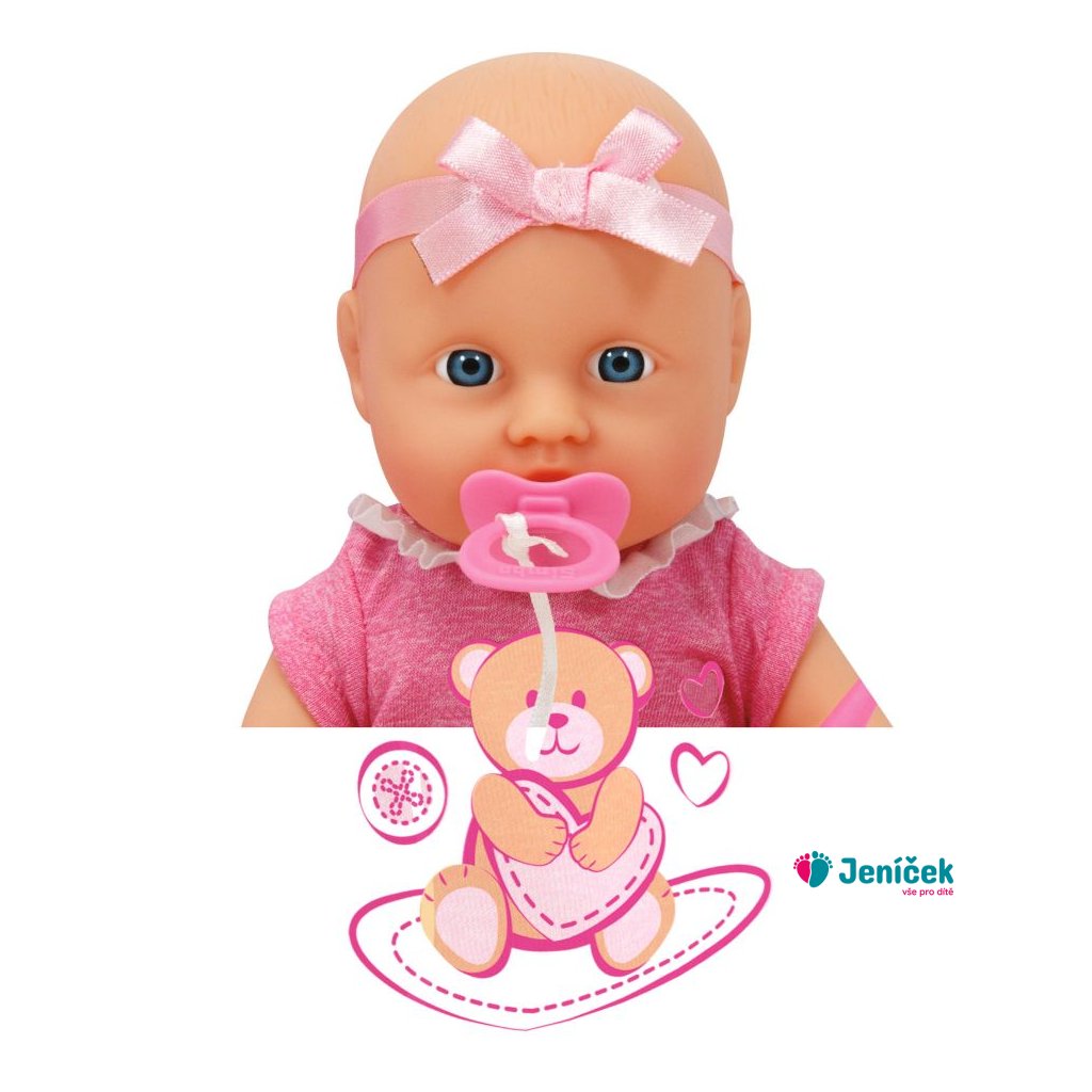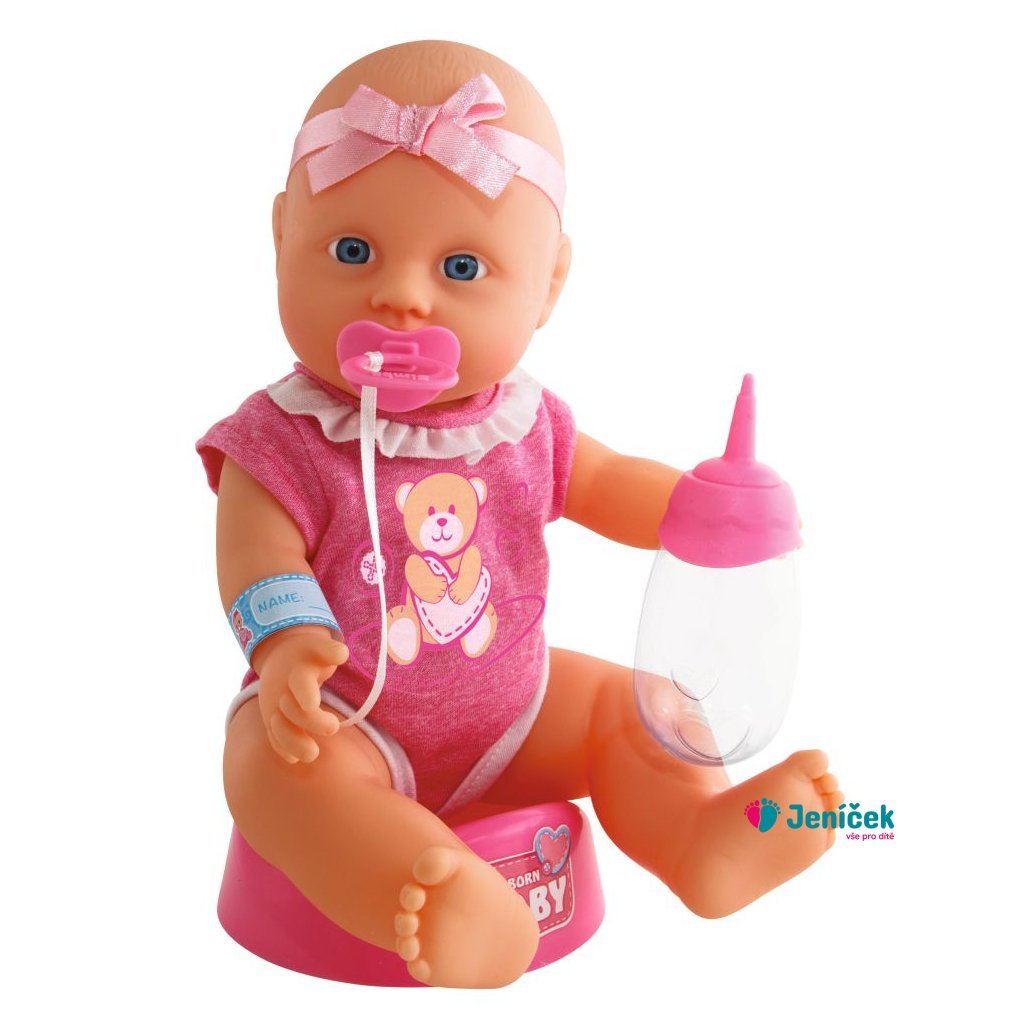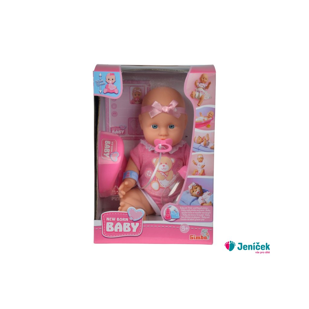 Panenka s plastovým tělíčkem z řady New Born Baby s funkcí "pije a čůrá". Součástí 4 ks příslušenství: dudlík, lahvička, nočník a rodný list. Velikost panenky 30 cm.