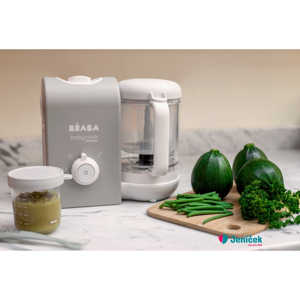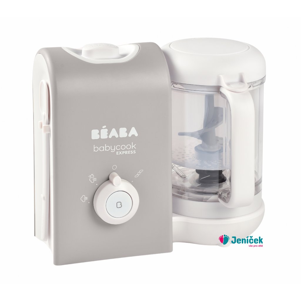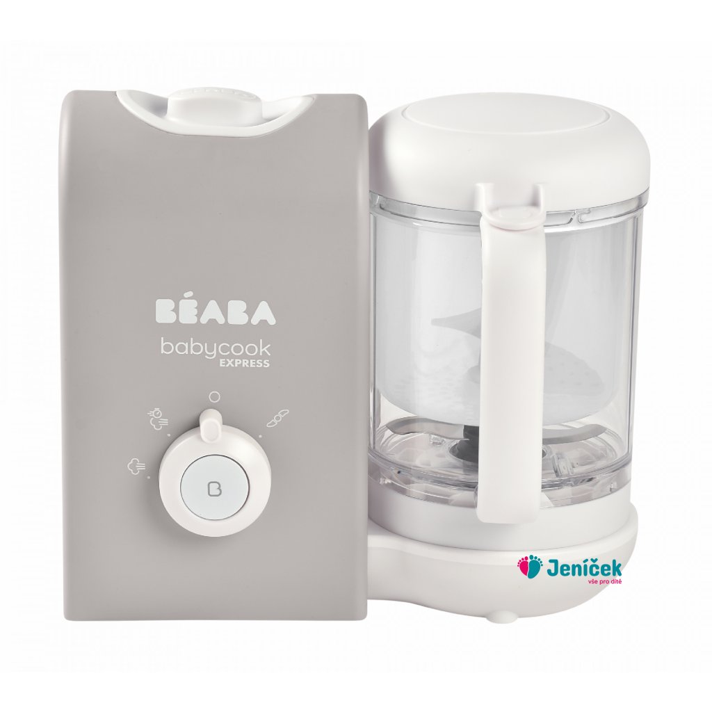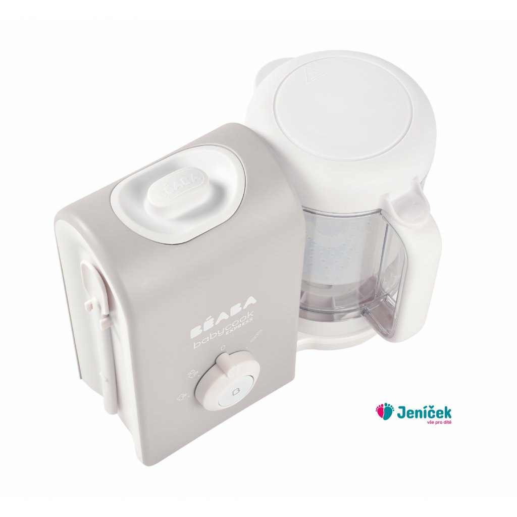 Skvělou pomoc při přípravě pokrmů pro děti představuje parní hrnec a mixér v jednom Beaba Babycook® Express. Babycook® umožňuje zdravě uvařit pokrm v páře a následně ho ve stejné nádobě rozmixovat. Zcela nový model Babycook® Express nabízí 2 režimy vaření v páře: Express režim pro úsporu času a Eco režim pro tradiční vaření. Zásobník na vodu s magnetickým víkem a vnitřní ryskou umožňuje díky velkému otvoru snadné plnění vodou. Příprava jídla v Babycooku je velmi snadná – pouze do něj nalijete vodu, do vkládacího košíku vložíte na kousky nakrájené suroviny (zeleninu, maso atd.) a přístroj zapnete. Po skončení vaření (trvá nejdéle 21 minut) se Babycook sám vypne. Chcete-li následně pokrm rozmixovat, pouze vysypete uvařené suroviny z vkládacího košíku do průhledné hlavní nádoby a rozmixujete (podle věku dítěte na jemnou hladkou kaši, nebo na hrubší strukturu s kousky). Když se dítě naučí dobře kousat, dá se Babycook® dále používat pro zdravé vaření v páře i bez mixování. Přístroj je možné použít i pro rozmrazování a ohřívání dětské stravy. Vnější plastová nádoba má objem 1250 ml, vkládací plastový košík má objem 1000 ml využitelný v režimu Eco. V režimu Express, který využívá při vaření míchací lopatku, je maximální využitelný objem 980 ml. Samostatně prodávaný nástavec umožňuje vařit v Babycooku i rýži nebo těstoviny. Nádobu, do které se vkládají potraviny, je možné mýt v myčce. Příkon: 400 W