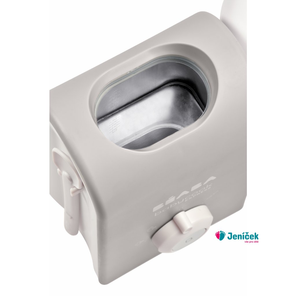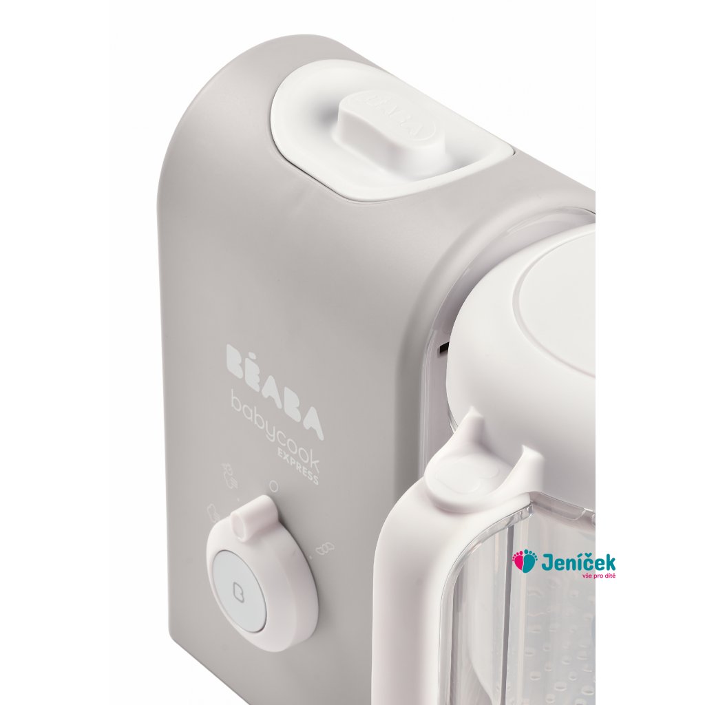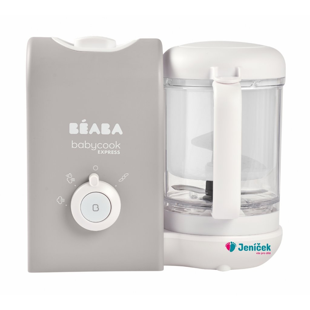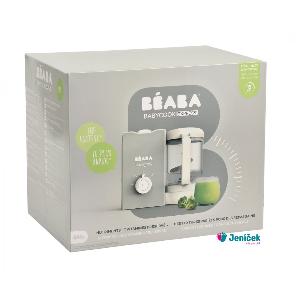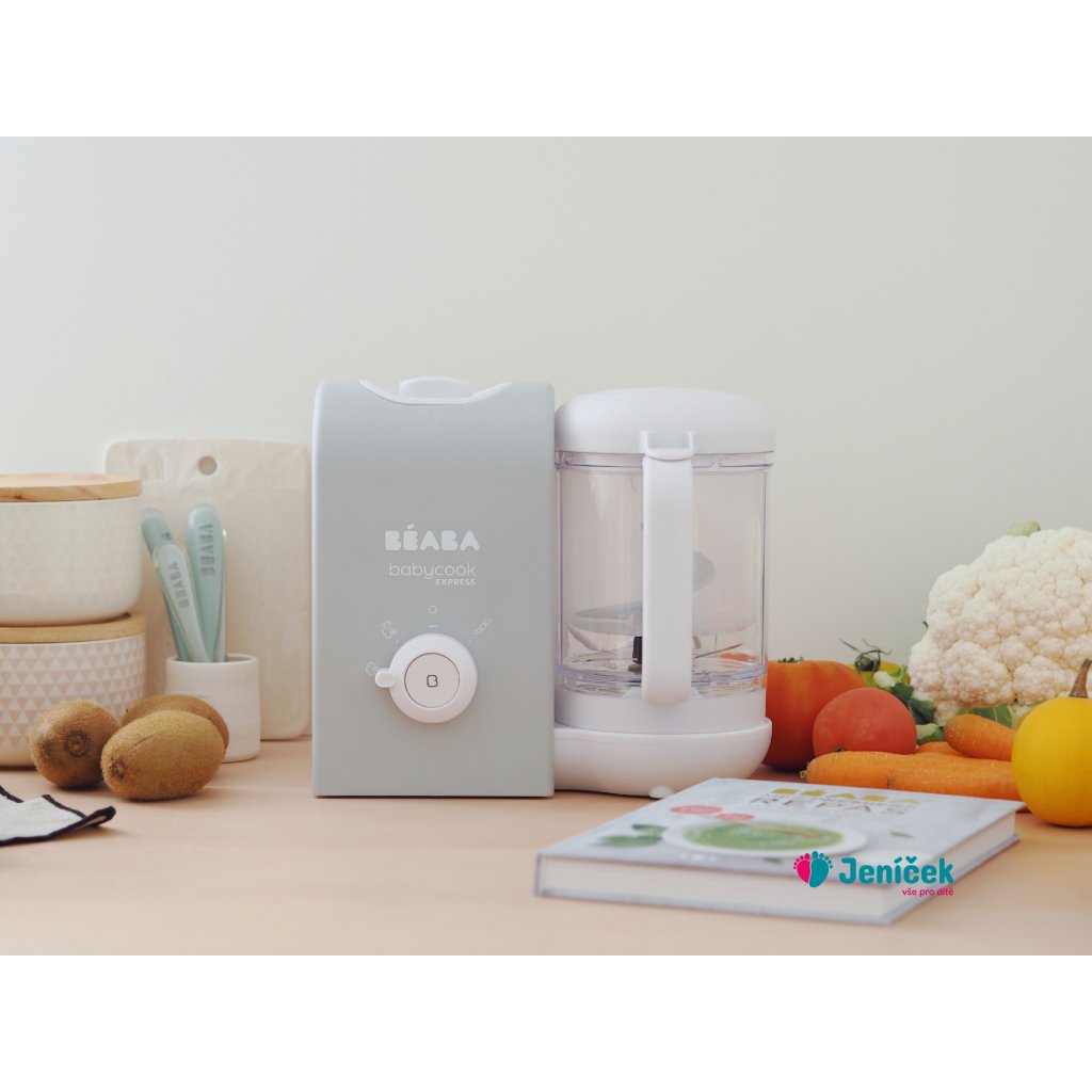 Skvělou pomoc při přípravě pokrmů pro děti představuje parní hrnec a mixér v jednom Beaba Babycook® Express. Babycook® umožňuje zdravě uvařit pokrm v páře a následně ho ve stejné nádobě rozmixovat. Zcela nový model Babycook® Express nabízí 2 režimy vaření v páře: Express režim pro úsporu času a Eco režim pro tradiční vaření. Zásobník na vodu s magnetickým víkem a vnitřní ryskou umožňuje díky velkému otvoru snadné plnění vodou. Příprava jídla v Babycooku je velmi snadná – pouze do něj nalijete vodu, do vkládacího košíku vložíte na kousky nakrájené suroviny (zeleninu, maso atd.) a přístroj zapnete. Po skončení vaření (trvá nejdéle 21 minut) se Babycook sám vypne. Chcete-li následně pokrm rozmixovat, pouze vysypete uvařené suroviny z vkládacího košíku do průhledné hlavní nádoby a rozmixujete (podle věku dítěte na jemnou hladkou kaši, nebo na hrubší strukturu s kousky). Když se dítě naučí dobře kousat, dá se Babycook® dále používat pro zdravé vaření v páře i bez mixování. Přístroj je možné použít i pro rozmrazování a ohřívání dětské stravy. Vnější plastová nádoba má objem 1250 ml, vkládací plastový košík má objem 1000 ml využitelný v režimu Eco. V režimu Express, který využívá při vaření míchací lopatku, je maximální využitelný objem 980 ml. Samostatně prodávaný nástavec umožňuje vařit v Babycooku i rýži nebo těstoviny. Nádobu, do které se vkládají potraviny, je možné mýt v myčce. Příkon: 400 W