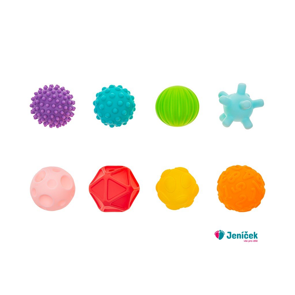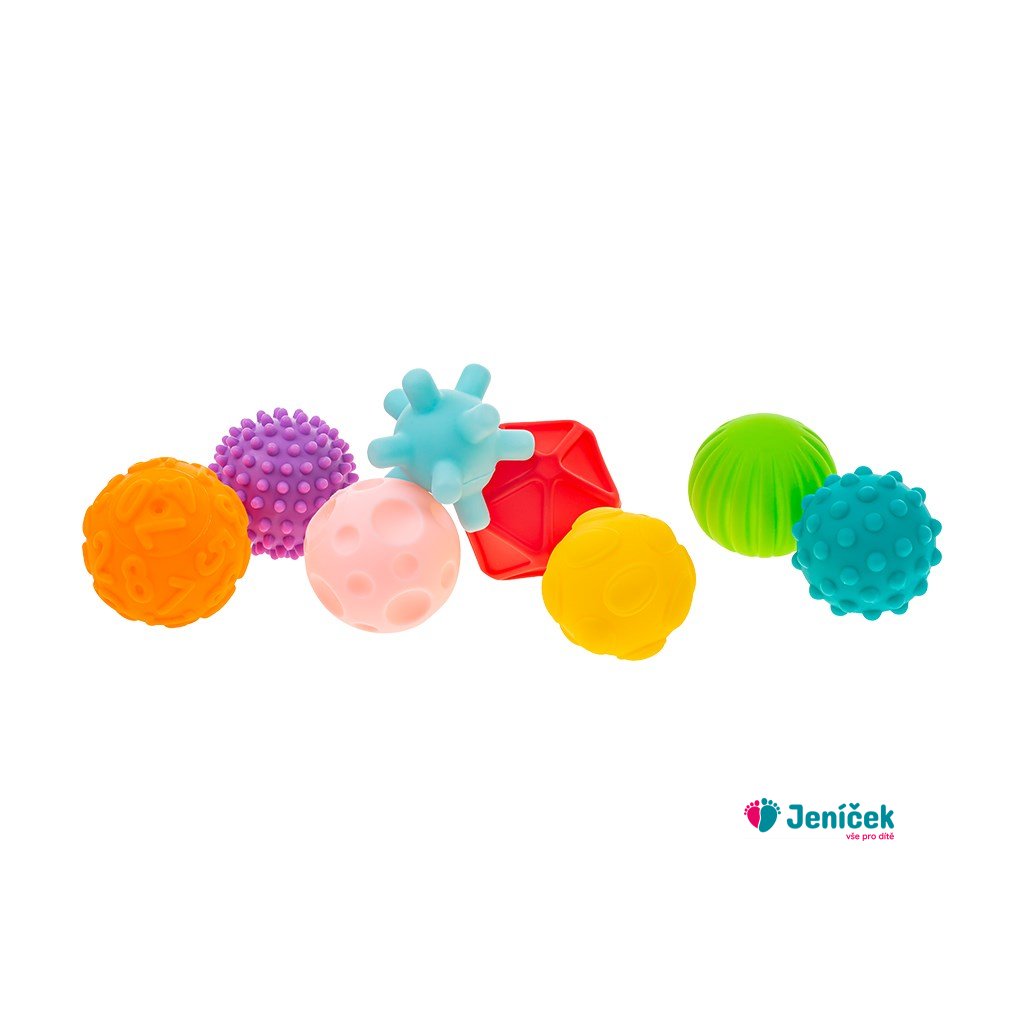 Sada senzorických hraček 8ks Akuku je vyrobená z gumového materiálu a je proto vhodná i do koupele. Obsahuje 8 různobarevných tvarů s různým povrchem, které po stlačení pískají. Hračky rozvíjí smysly, představivost dítěte, koordinaci pohybů a učí poznávání barev a tvarů. Materiál je bezpečný, hygienický a neobsahuje BPA. Vhodné pro děti od 6 měsíců. Rozměr hraček: cca 7cm.