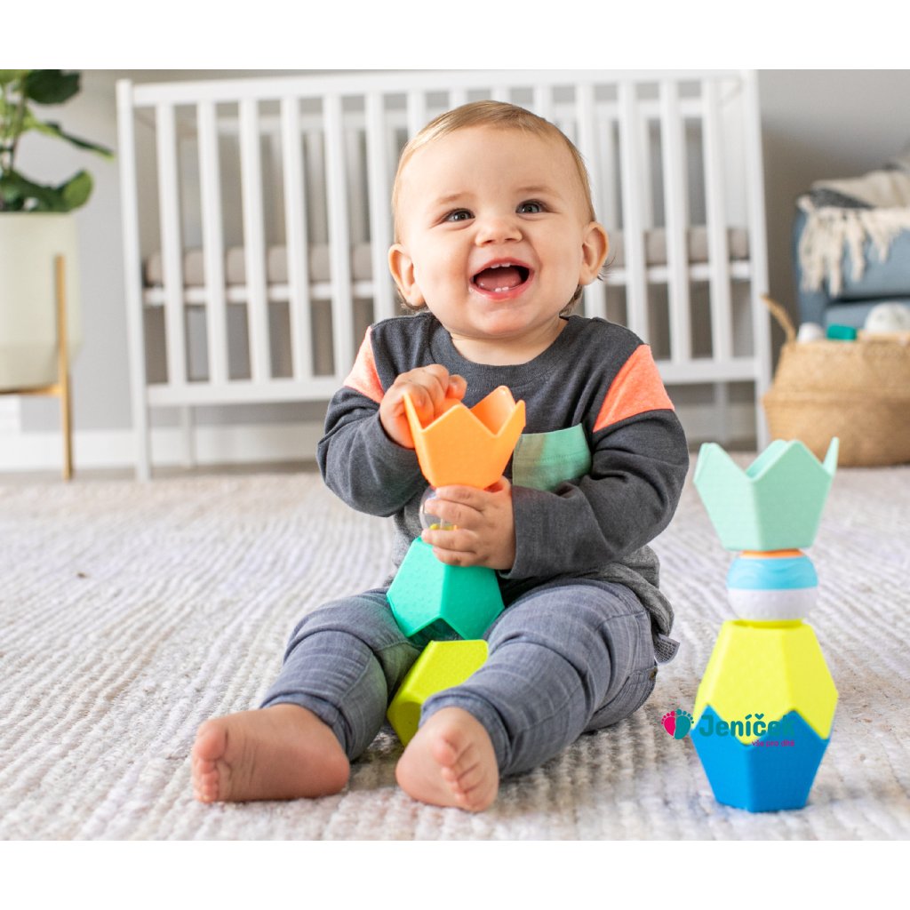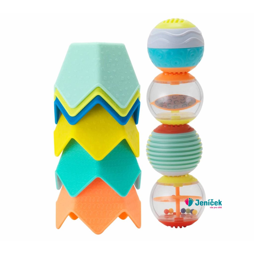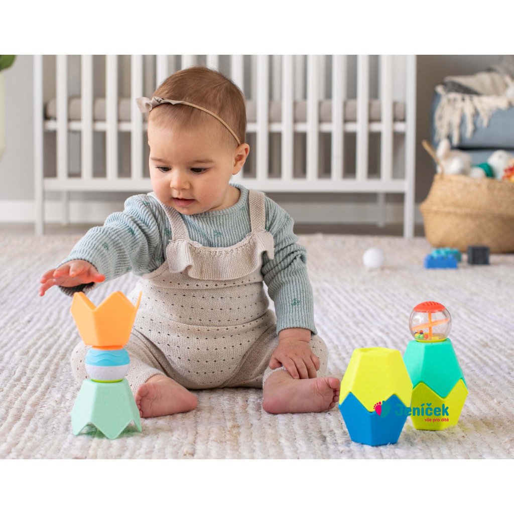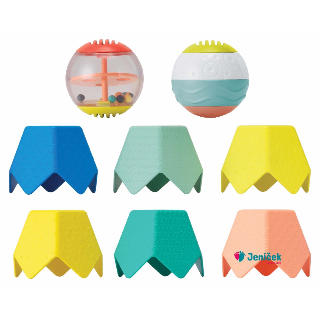Sada multifunkčních míčků a kelímků nabízí mnoho různorodých aktivit a způsobů hry. Míčky a kelímky lze snadným způsobem spojovat dohromady a vytvářet tak stále nové, originální konstrukce. Každý míček nabízí jinou texturu, některé jsou naplněné korálky, které při pohybu chrastí. Hračka podporuje rozvoj jemné motoriky a kognitivních schopností dítěte. Sada obsahuje 4 míčky a 6 originálně tvarovaných kelímků. Vhodné pro děti od 3 měsíců.