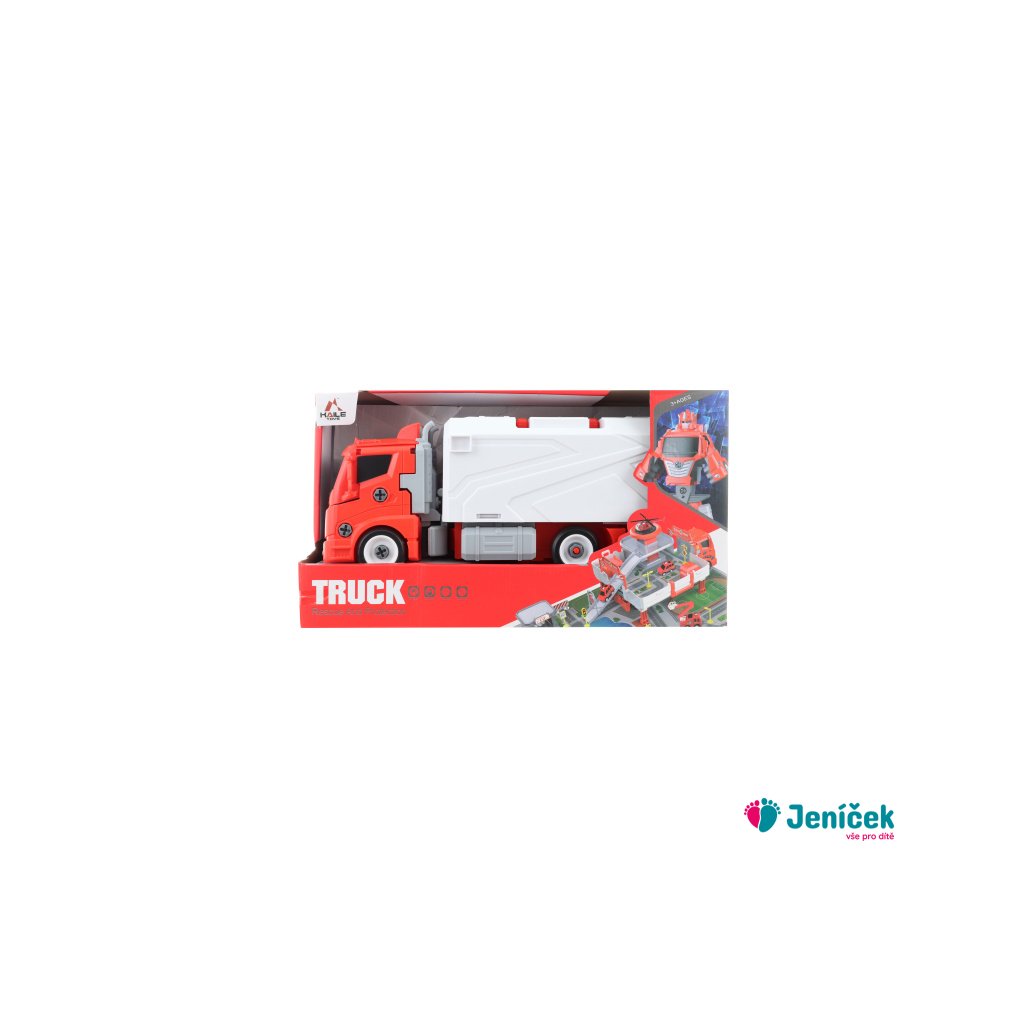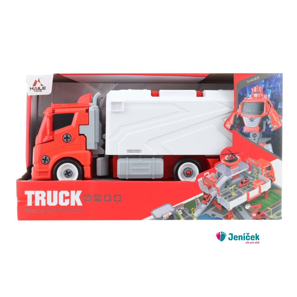 Krásný velký šroubovací kamion, ze kterého lze složit hasičská stanice nebo robot. Materiál plast. Baleno v otevřené krabici. Rozměry balení cca 37x22x13 cm. Velikost kamionu 32 cm.