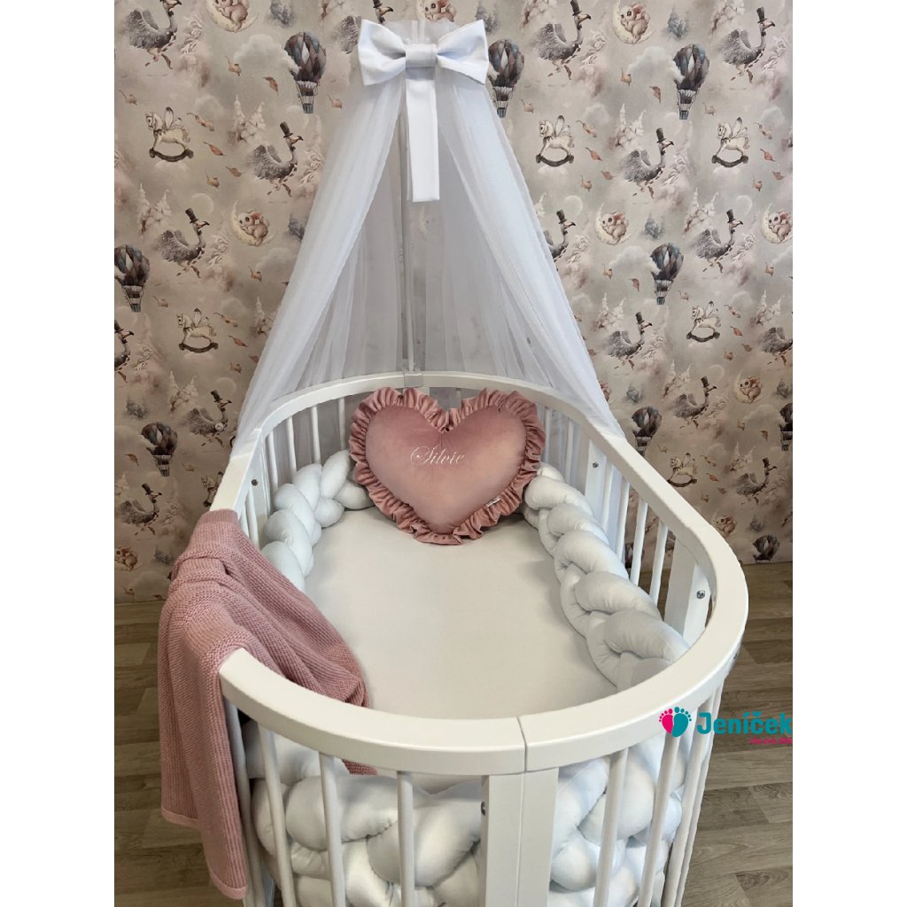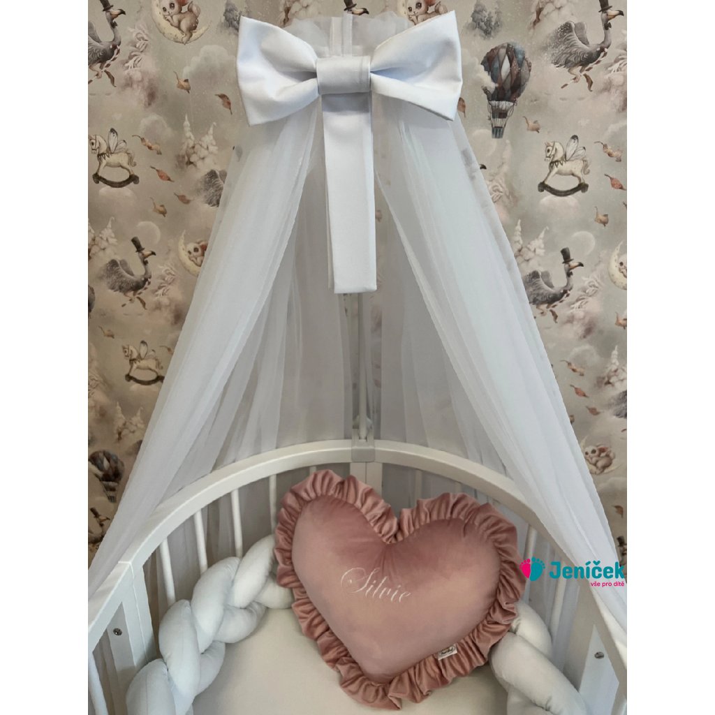 Krásná bílá šifonová nebesa s bavlněnou mašlí. Tyto nebesa jsou vhodná pouze na kovový držák, kvůli jinému uchycení. Odstín mašle si můžete zvolit. Nebesa jsou vhodná na všechny typy postýlek.