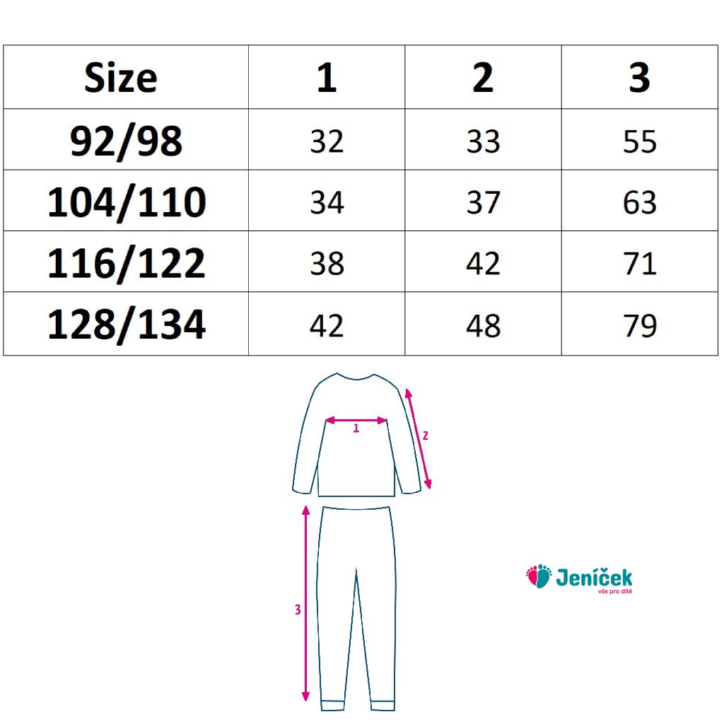 Krásné a praktické bavlněné pyžamko české značky New Baby. Pyžamko s roztomilým dětským motivem se skládá z trička s dlouhým rukávem a kalhot. Bavlněné tričko je velmi pohodlné už jen tím, že je vyrobeno z kvalitní bavlny, bez zapínání, s jemným lemem okolo krčku. Lem nesmí tlačit, obepínat a tričko se musí snadno oblékat přes hlavičku. Kalhoty mají na nohavičkách příjemné lemy a v pase lem s gumičkou, která netlačí. Použití kvalitních materiálů a příjemný střih zaručují maximální pohodlí, tvarovou stálost a jednoduchou údržbu. Pro děti je pyžamo mnohem vhodnější než noční košile, protože se při spánku více vrtí, odkopávají a pak mají studené nožičky i záda. A tomu dokáže pyžamo, účinně zamezit. Složení: 100 % bavlna. OEKO-TEX STANDARD 100.