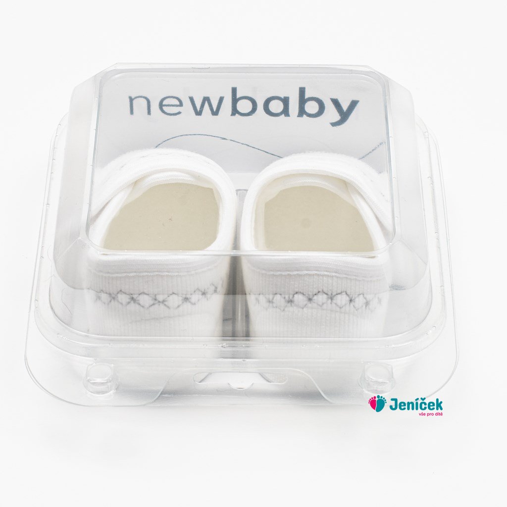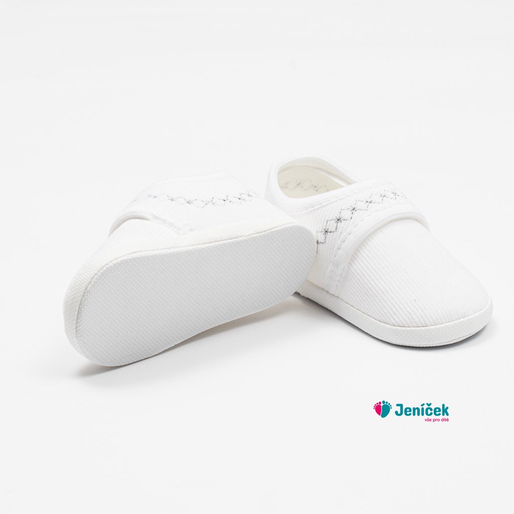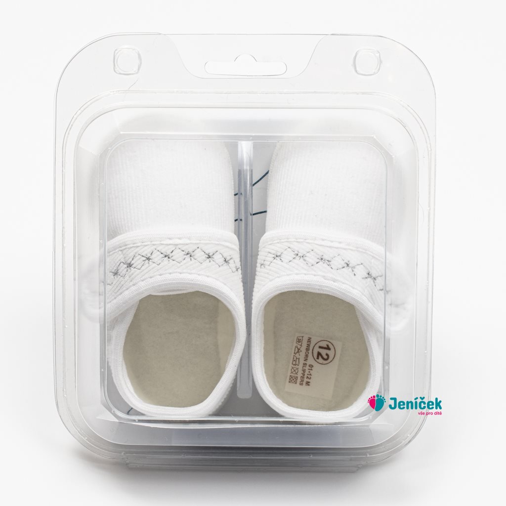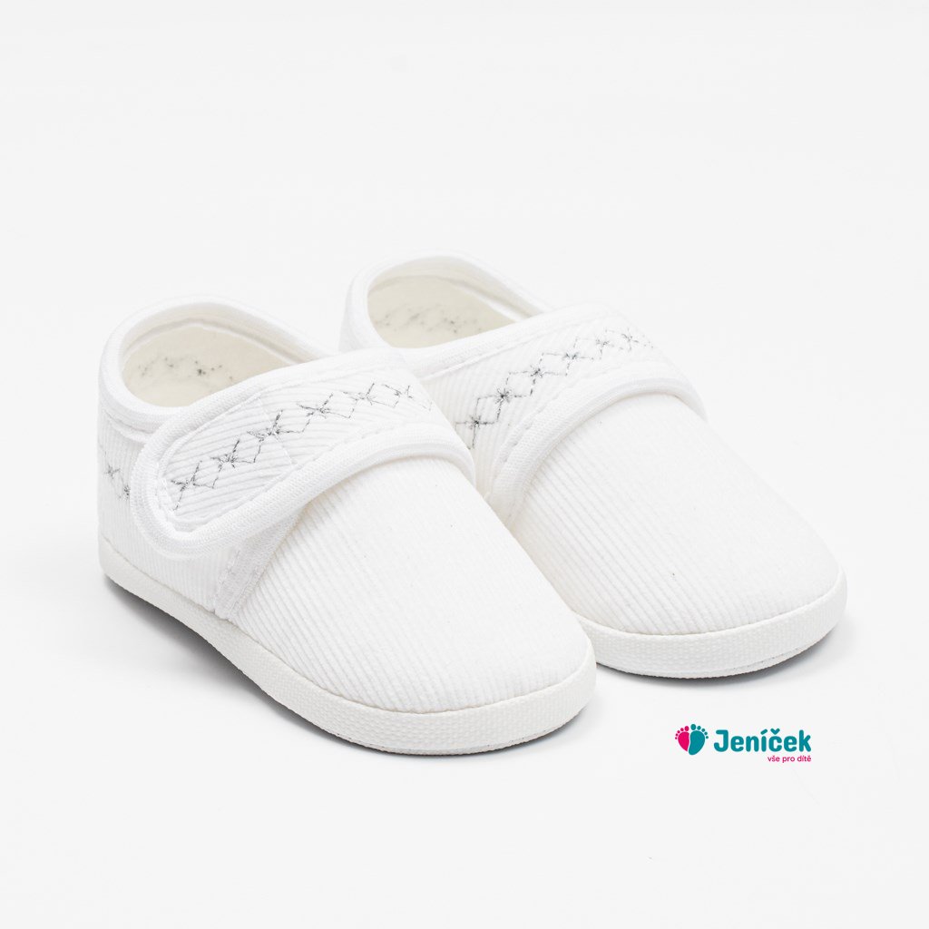 Kojenecké capáčky New Baby pro miminka. Krásné botičky s moderním vzhledem na suchý zip, zdobené stříbrnou výšivkou. Capáčky přiléhají k nožičce a mají široký vnitřek, což umožňuje volný pohyb prstů a svalů. Výrobek není určen k chůzi. Jsou velmi lehké s tenkou syntetickou podrážkou. Složení: 100% polyester. Podrážka: syntetický materiál PVC bez BPA. Délka vnitřní stélky 12 cm. Určeno pro děti 6-12 měsíců. Dodáváné v praktické krabičce. Upozornění: pod textilní vložkou se někdy nachází papírová vložka, která drží tvar capáčky. Před prvním použitím odstraňte tuto papírovou vložku.Doplňkové parametry