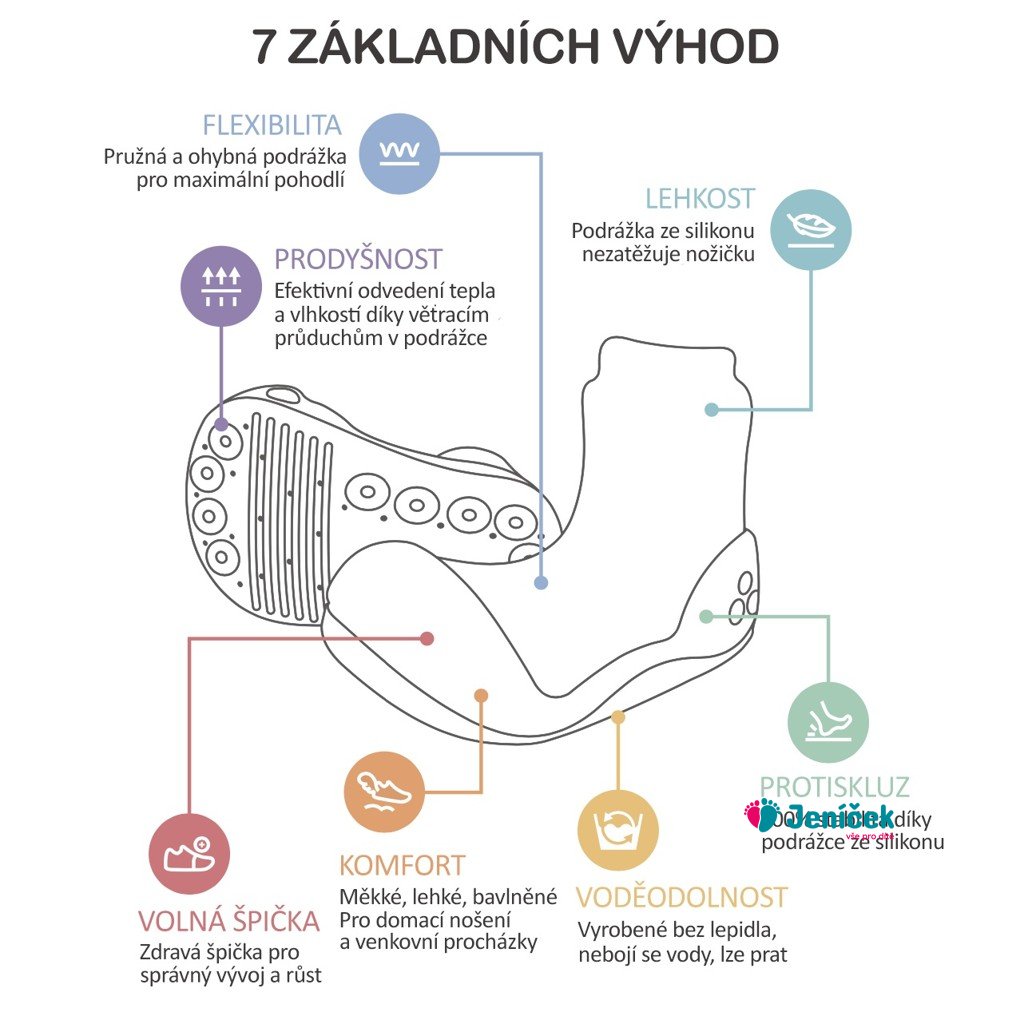 - Lehkost a flexibilita. Podrážka je ze silikonu a ponožka z bavlny. Tento jednoduchý materiál dělá obuv velice lehkou a pružnou.