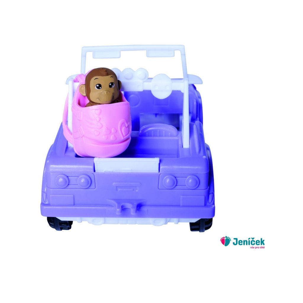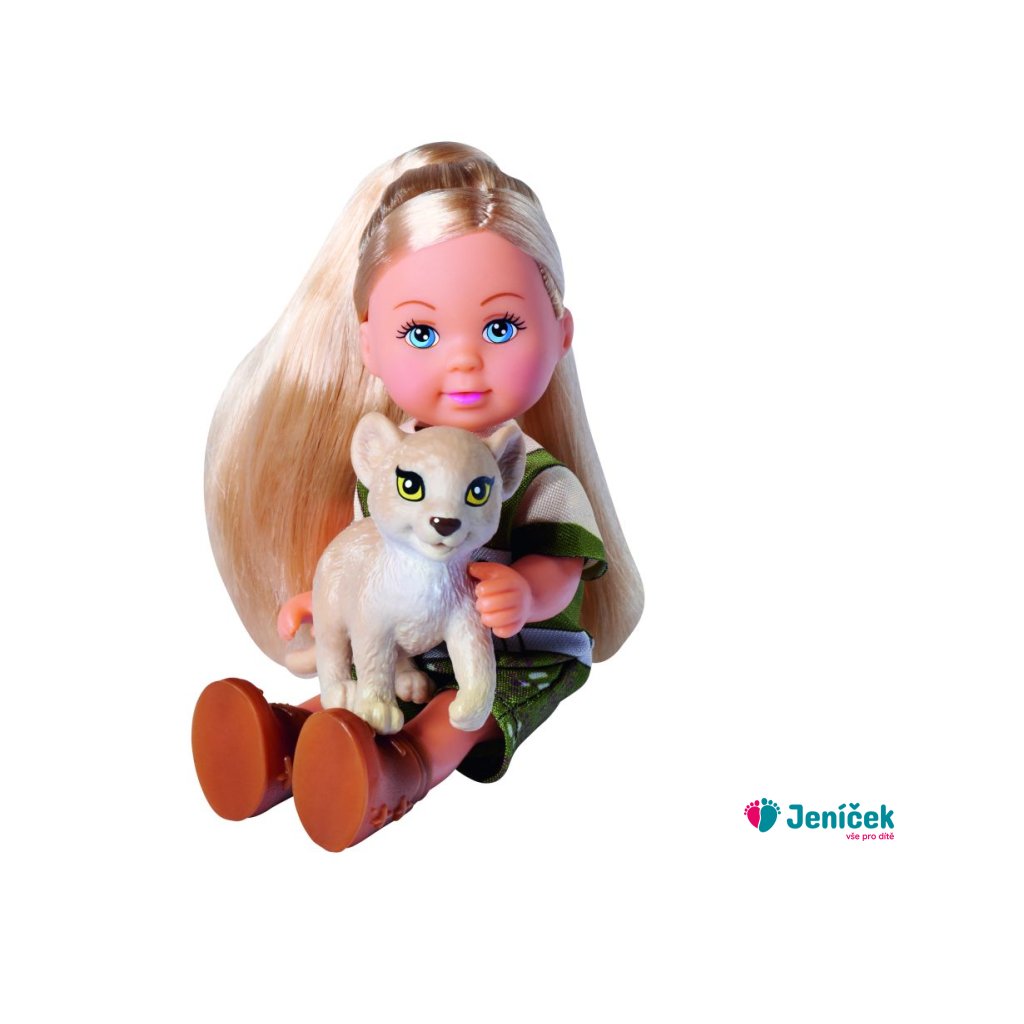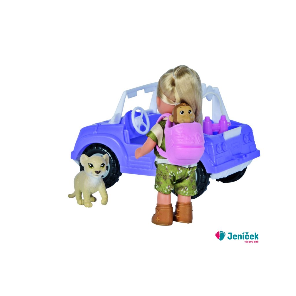 Panenka Evička v safari oblečení a s terénním autem. Nechybí batůžek, malá opička, lvíček a dalekohled. Délka auta 16 cm. Výška panenky 12 cm.Doplňkové parametry