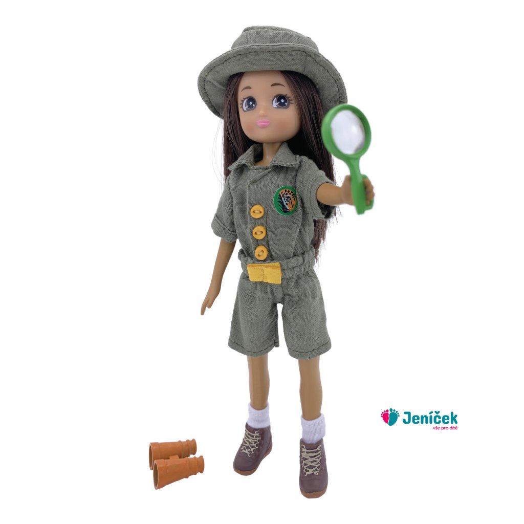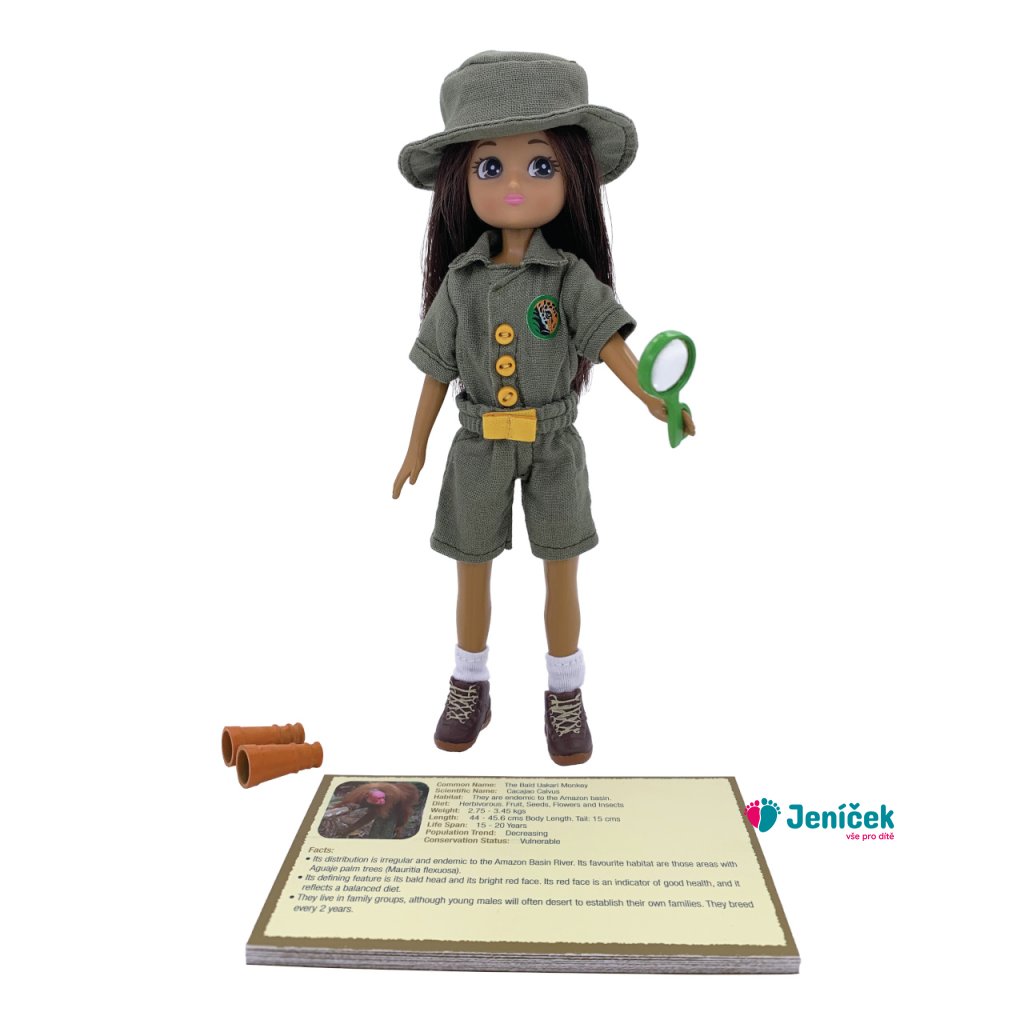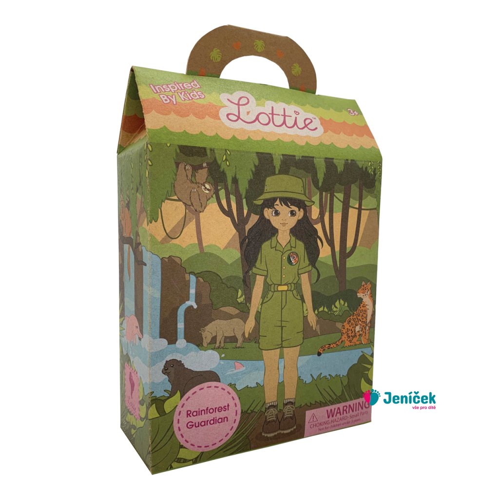 Se svým dalekohledem a lupou je připravena zkoumat a strážit deštný prales, který je domovem mnoha ohrožených zvířat a rostlin. Příroda přece skýtá tolik dobrodružství, proto je potřeba ji chránit. Ve spolupráci s organizací Rainforest Trust přichází kolekce Lottie s panenkou, která děti prostřednictvím sady kartiček provede vzácnou Amazonskou přírodou. Jako ostatní panenky z oceňované kolekce Lottie je i tato realistická a snaží se děti naučit upřímnému pohledu na svět. Lottie jsou navrženy a zvláště uzpůsobeny malým dětským ručkám, mají pohyblivá kolena a jsou vyrobeny z prémiového měkkého vinylu a nylonu, bez použití ftalátů. Každá panenka je dodávána v atraktivní barevné kartónové taštičce s plastovým průhledem a uchem. Hlavní vlastnosti:kloubová panenka s pohyblivými koleny, perfektní pro představivou hruprémiové nylonové vlasy jsou hebké na dotek a nezamotávají sepanenka z vinylu bez obsahu ftalátů, měkká na dotekpanenka má snímatelné boty a stojí samostatněhnědé vlasy a hnědé očimilované všemi dětmi, vhodné od 3 letmalá a roztomilá panenka ve velikosti 18 cm Balení obsahuje:Lottie, milovnice zvířat a strážkyně parku, vybavená zelenou kombinézou s páskem, bílými ponožkami, hnědými botami a kloboučkemdalekohled, lupa a 10 sběratelských kartiček