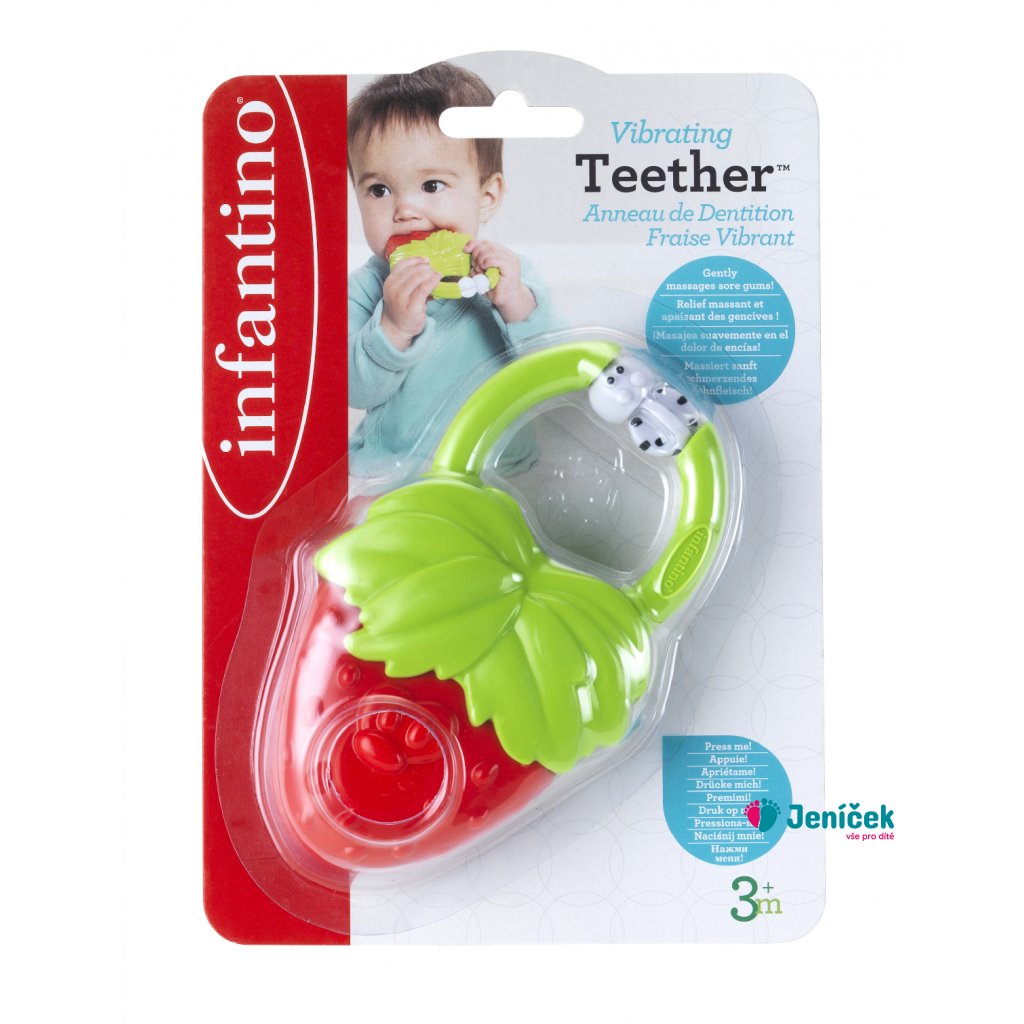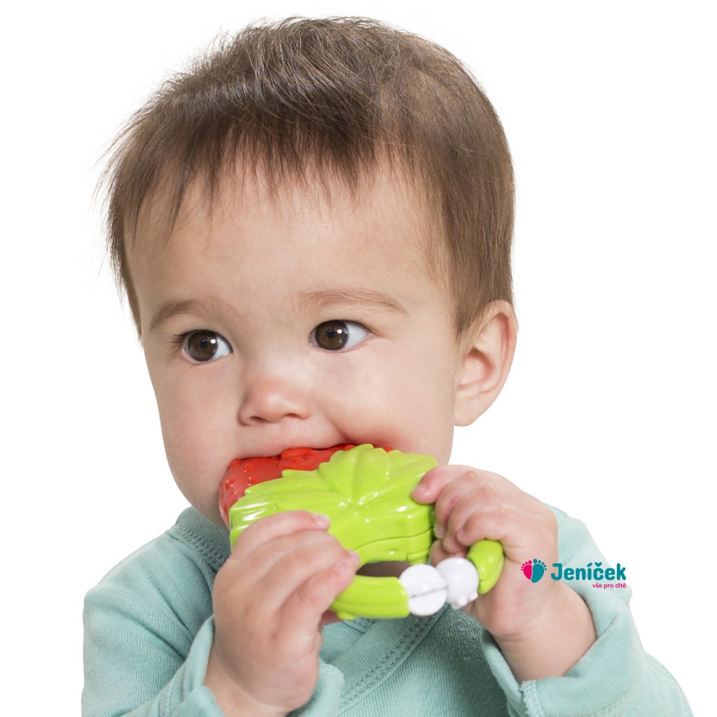 Kousátko s různorodými texturami pro zkoumání v ústech při zmáčknutí jemně vibruje a masíruje tak dítěti citlivé dásně při prořezávání prvních zoubků. Pohyblivá beruška na držadle kousátka nabízí další texturu pro zkoumání rukama i ústy. Tvar kousátka umožňuje snadné uchopení malými dětskými ručičkami. Baterie 1x AA (LR6) 1,5V je součástí výrobku. Vhodné pro děti od 3 měsíců.