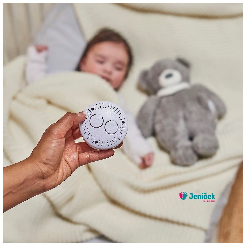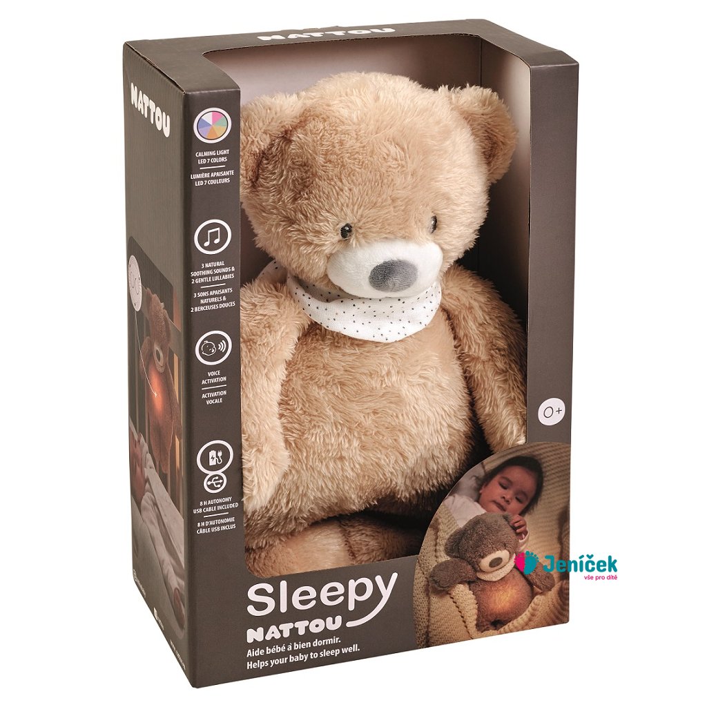 Medvídek na spaní Nattou je krásné měkké kvality s příjemnou výplní. Spící medvídek má v bříšku světýlko, které se může měnit mezi sedmi barvami a zvukem, s bílým šumem, mořem, tlukotem srdce a dvěma uklidňujícími ukolébavkami, které pomáhají zajistit klidný spánek. Zvuky spícího medvídka se aktivují automaticky, když uslyší pláč dítěte a zvuky automaticky přestanou po 15 minutách. Světlo spícího medvídka vychází z LED diody v bříšku, takže světlo je tlumeno textilií zajíčka a nepřehřívá se, tedy světlo může bez problémů svítit celou noc.
