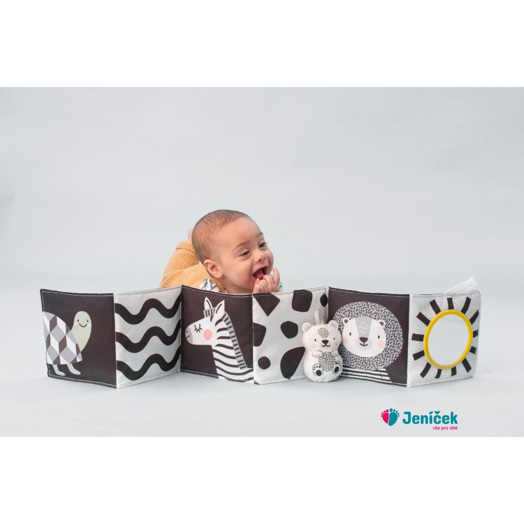Oboustranná textilní knížka pro nejmenší je určena do kočárku, postýlky i na hrací deku. Kniha nabízí dvě strany s bezpečným zrcátkem a vysoce kontrastními obrázky v základních barvách, které podněcují rozvoj smyslů a emoční inteligence dítěte. Při zkoumání rukama stránky šustí, šusticí je i odnímatelný roztomilý medvídek. Knížka drží postavená samostatně nebo je možné ji připevnit s pomocí úchytů na postýlku či do kočárku. Rozměr 15 x 85 cm. Vhodné od narození.