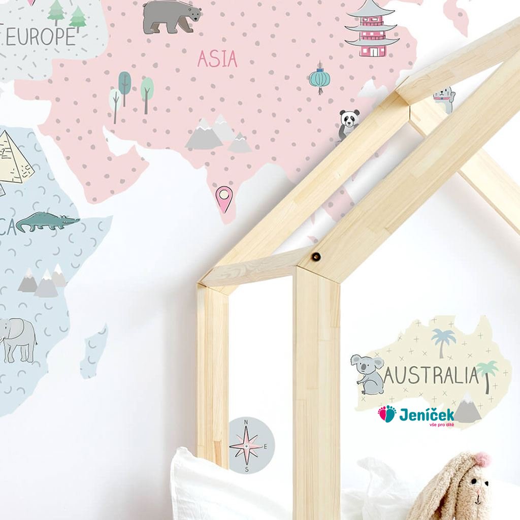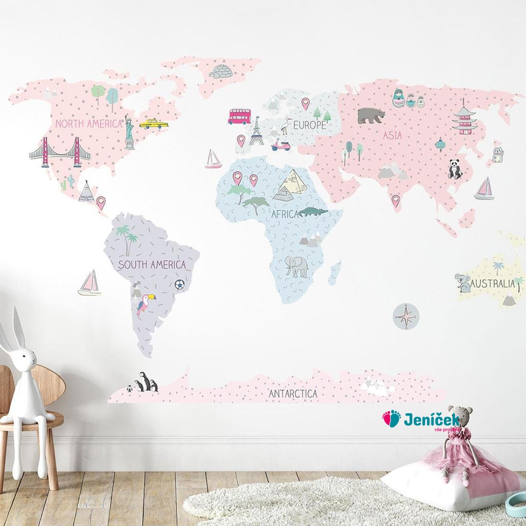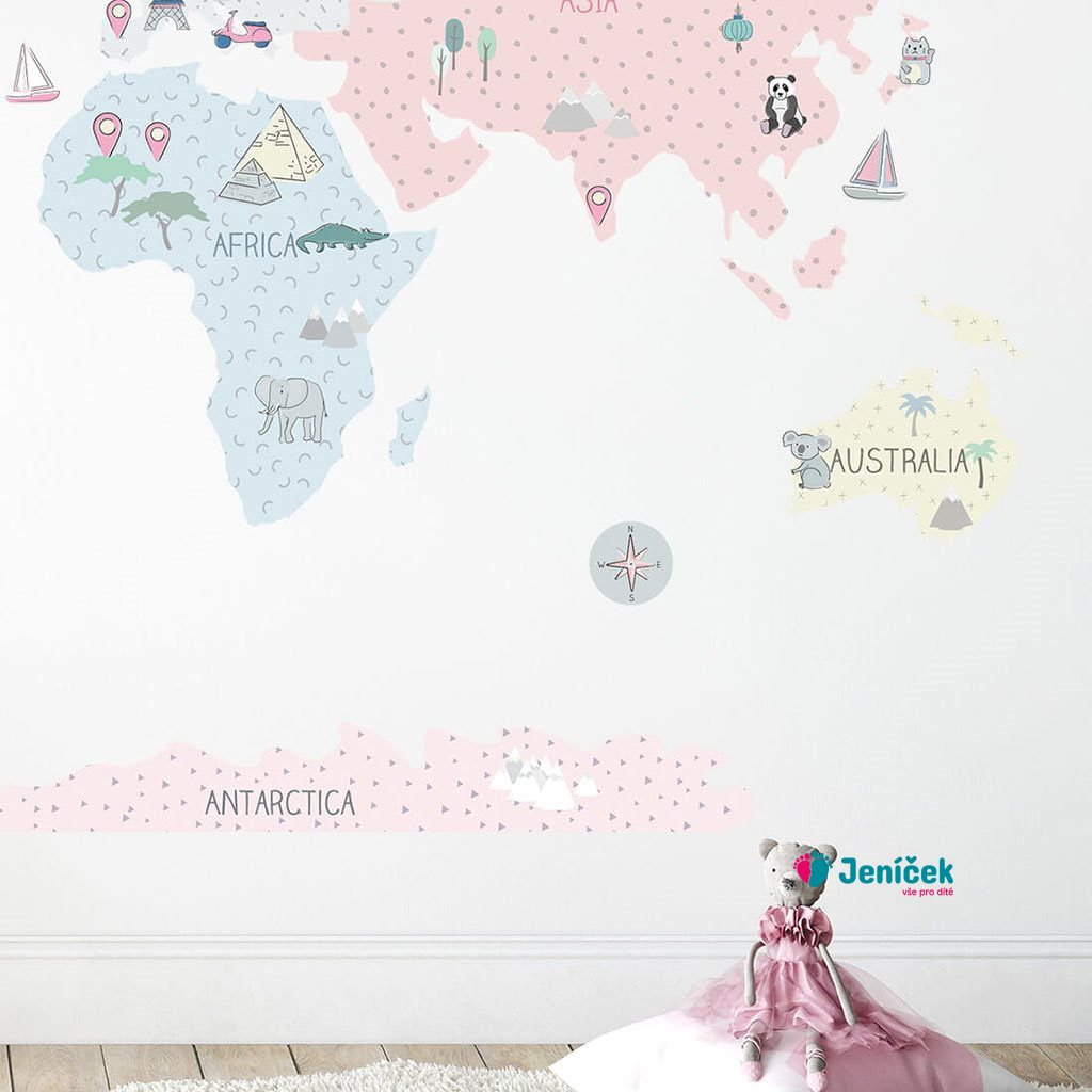Krásná nálepka na zeď Mapa M. Růžové mapy světa jsou produkty nejvyšší kvality, vyrobené s maximální péčí a pozorností k detailům, udržované v tlumených skandinávských barvách, které dokonale zapadnou do prostoru dítěte. Mapy jsou nejen jedinečnou dekorací, ale také senzačním způsobem učení hrou. Děti poznávají kontinenty, oceány a světové strany, ale i památky a zajímavosti daného regionu či státu. Každý prvek mapy je pečlivě vyříznut z obrysu a nalepen samostatně, což usnadňuje aplikaci, zejména v případě velkých prostor. Velikost samolepky se měří po její aplikaci na zeď, přičemž kontinenty jsou od sebe v patřičné vzdálenosti. Samolepka je zajištěna speciálním matným laminátem, který ji chrání před poškrábáním při každodenním používání a zároveň usnadňuje lepení – fólie je silnější a snáze se přenáší na zeď. Pokud hledáte dokonalý způsob, jak oživit dětský pokojíček, naše samolepky na zeď jsou tou správnou volbou. Objednejte si je ještě dnes a udělejte radost svému dítěti.Tato sada obsahuje: